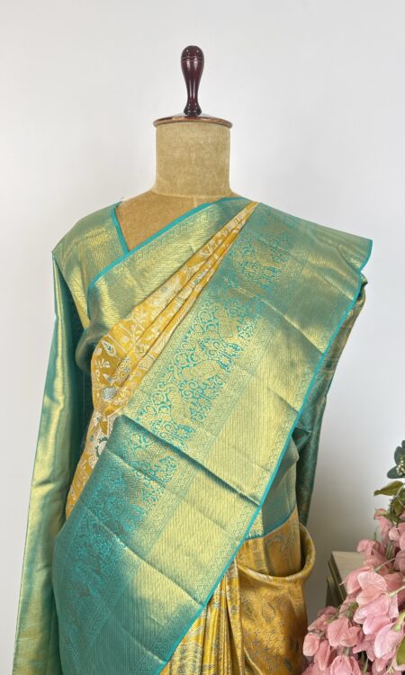 Yellow and sea blue Kanchi tissue saree