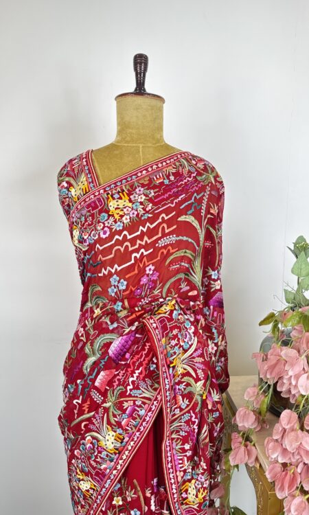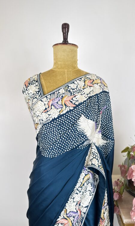 Deep Teal blue satin Parsi gara sareeclick here to know all about sizings.⚡