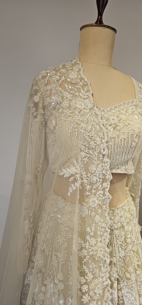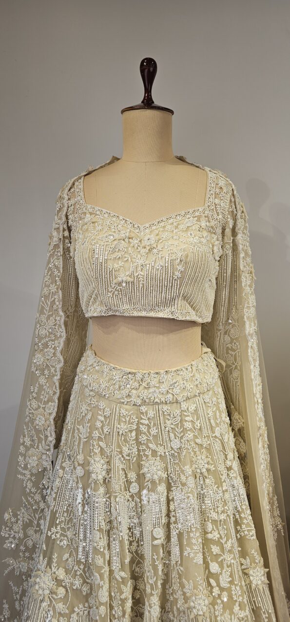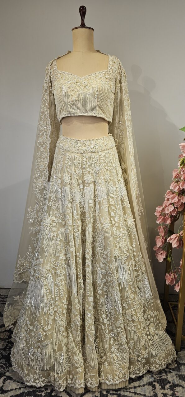 Beautiful Net lehenga with all over heavy pearl and sequence hand done work. Paired with elegant dupatta and blouse.