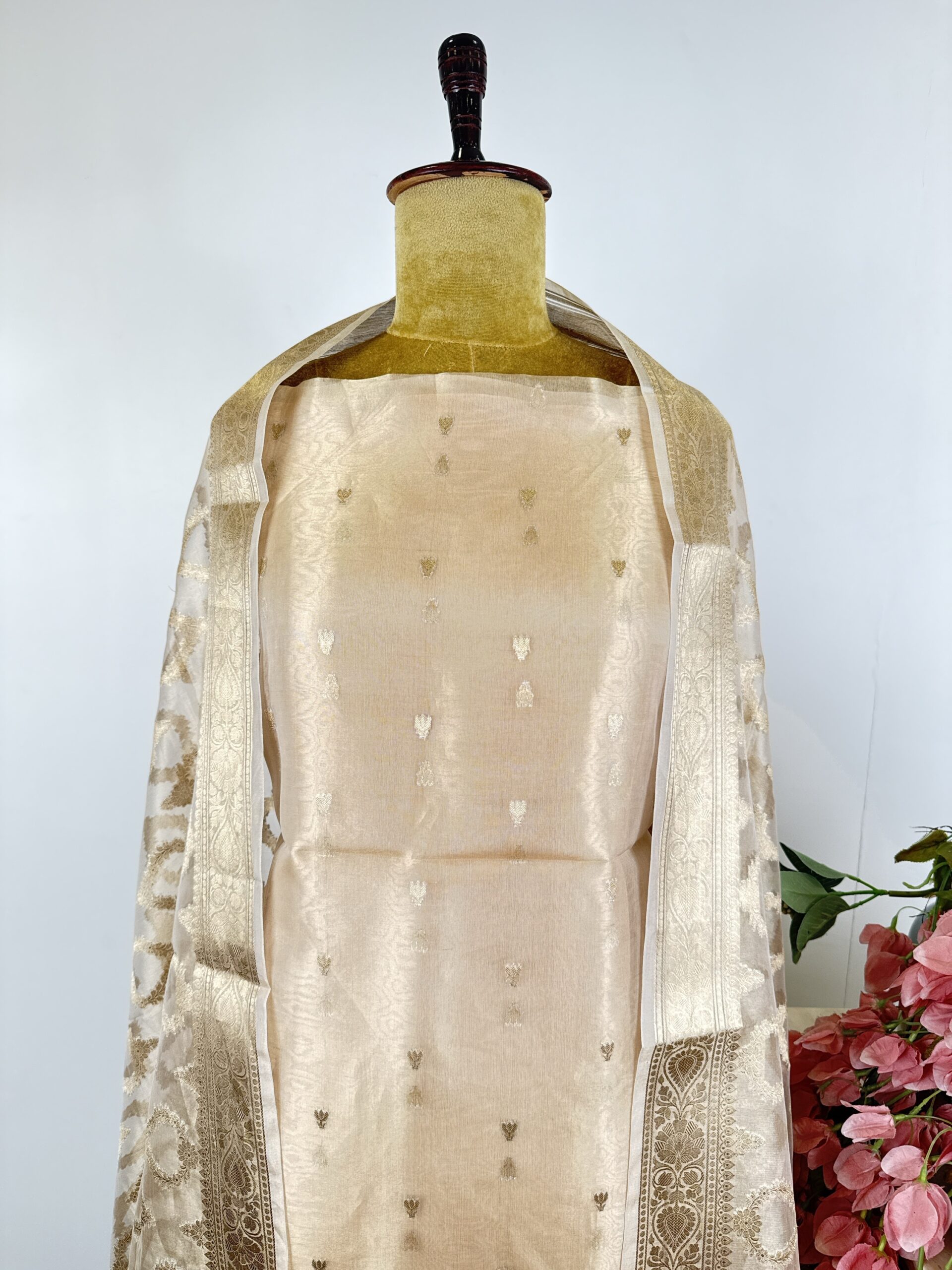 Beige colour tissue unstitched suit with floral zari motifs paired with brocade zari dupatta