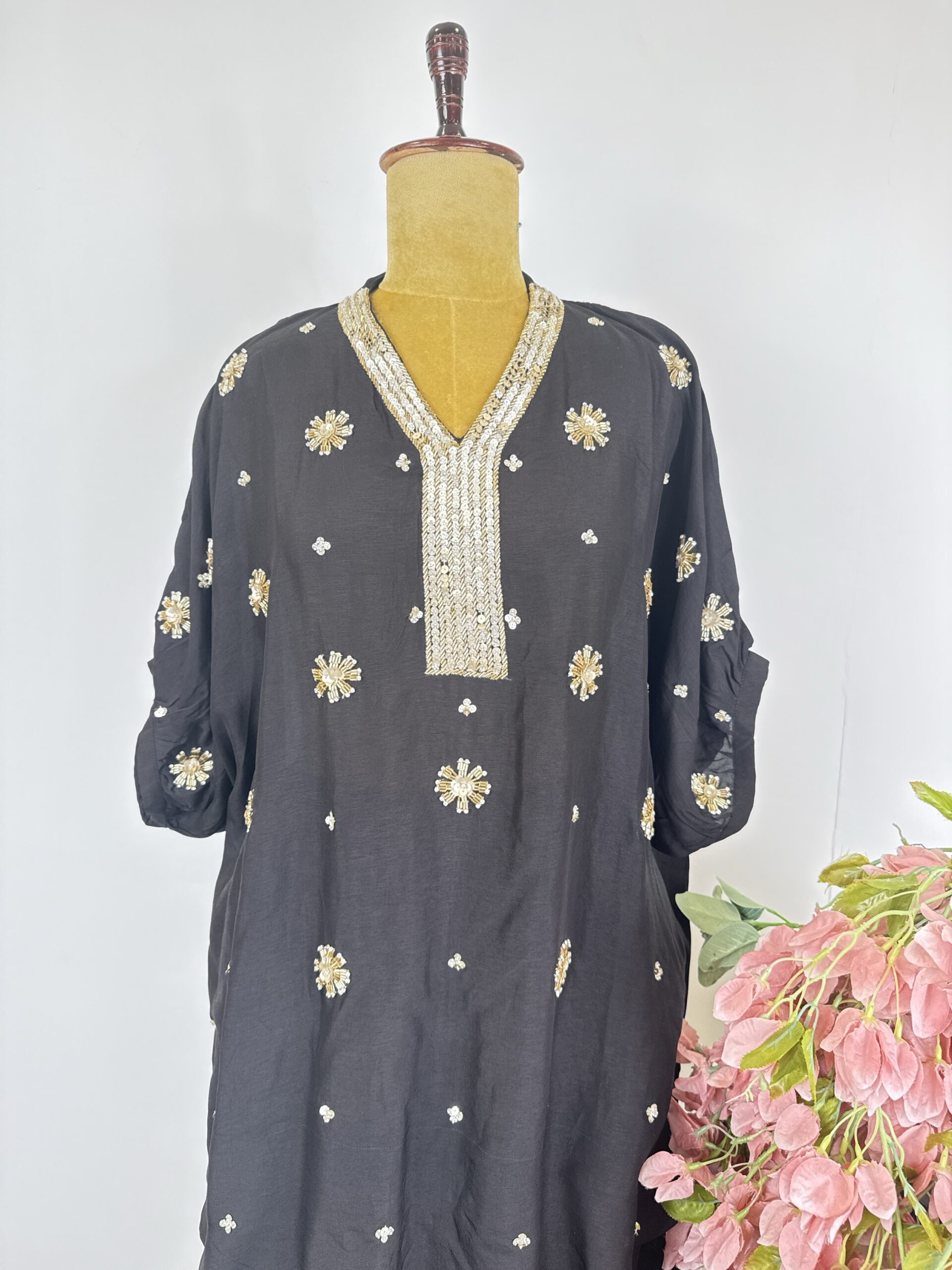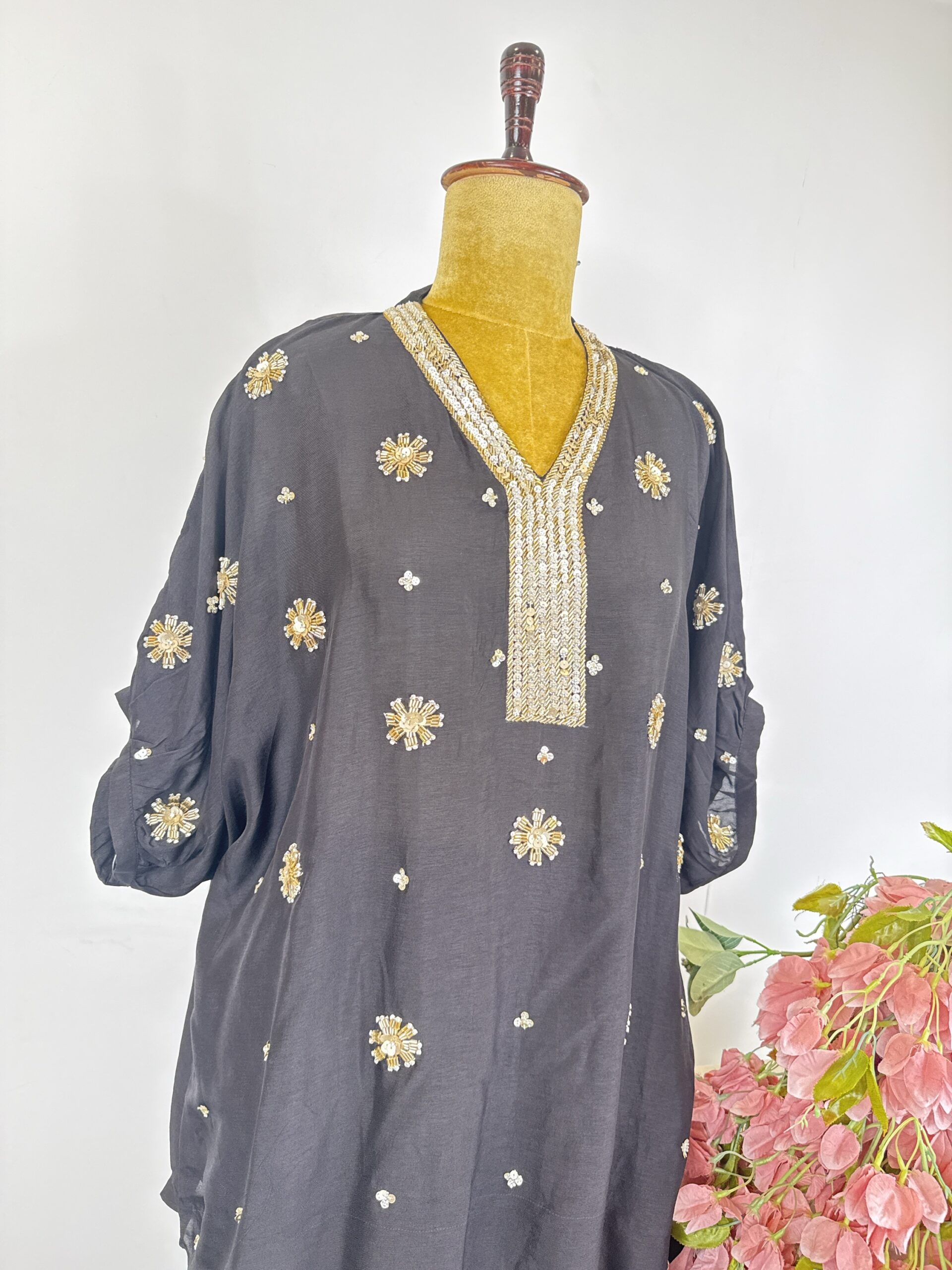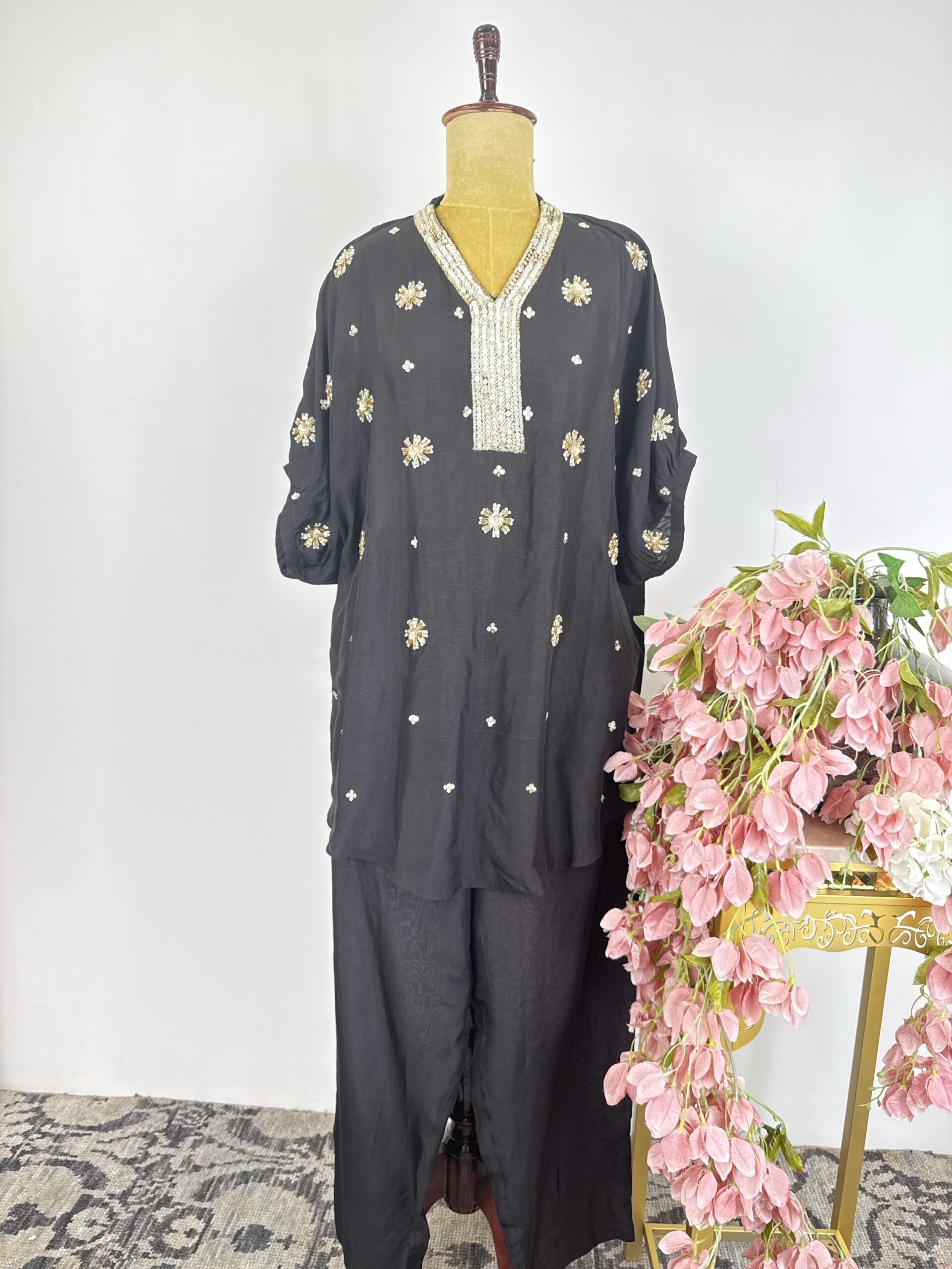Black colour silk cord set with floral motifs detailed with cut dhana and sequins and paired with pants