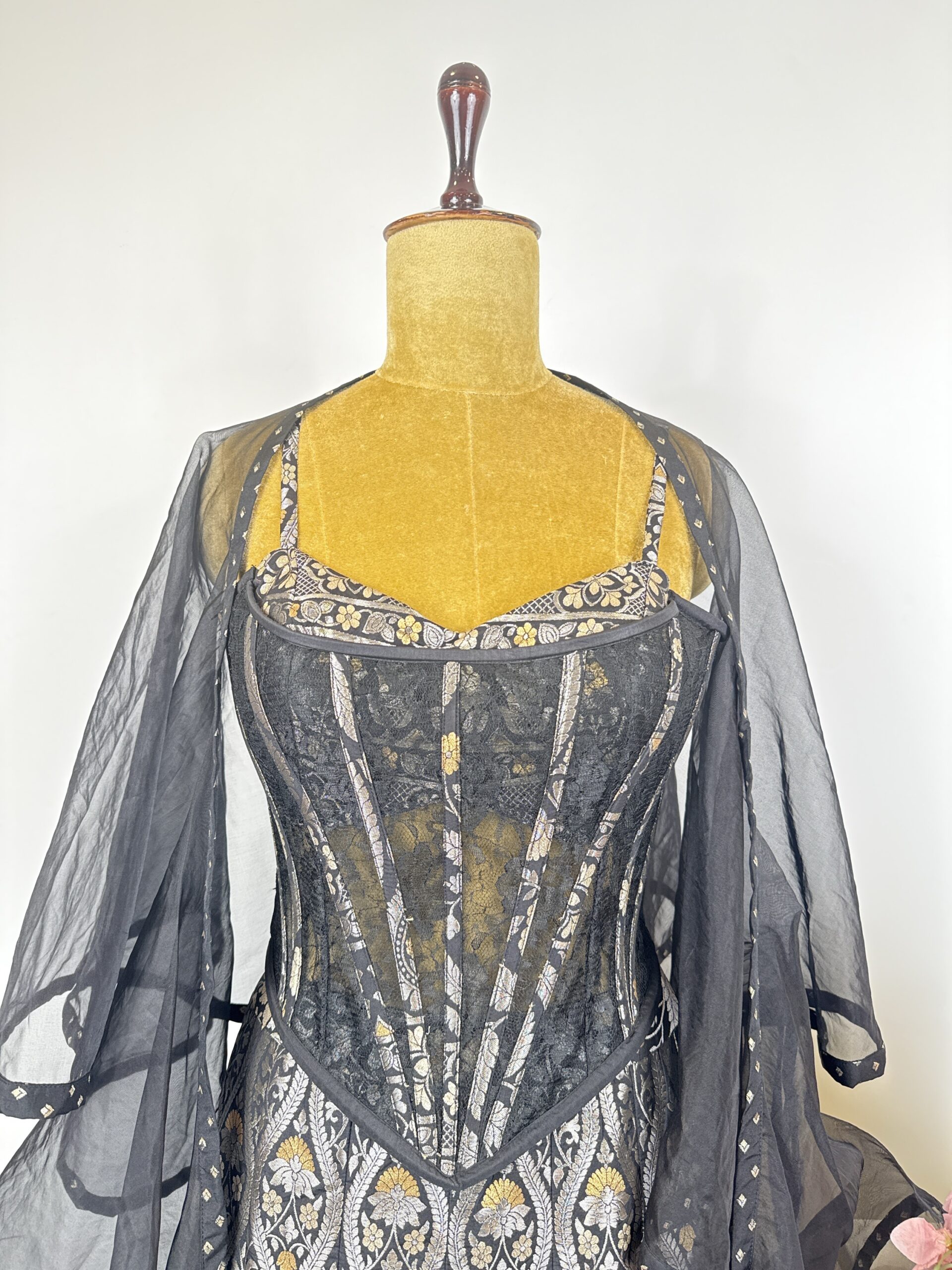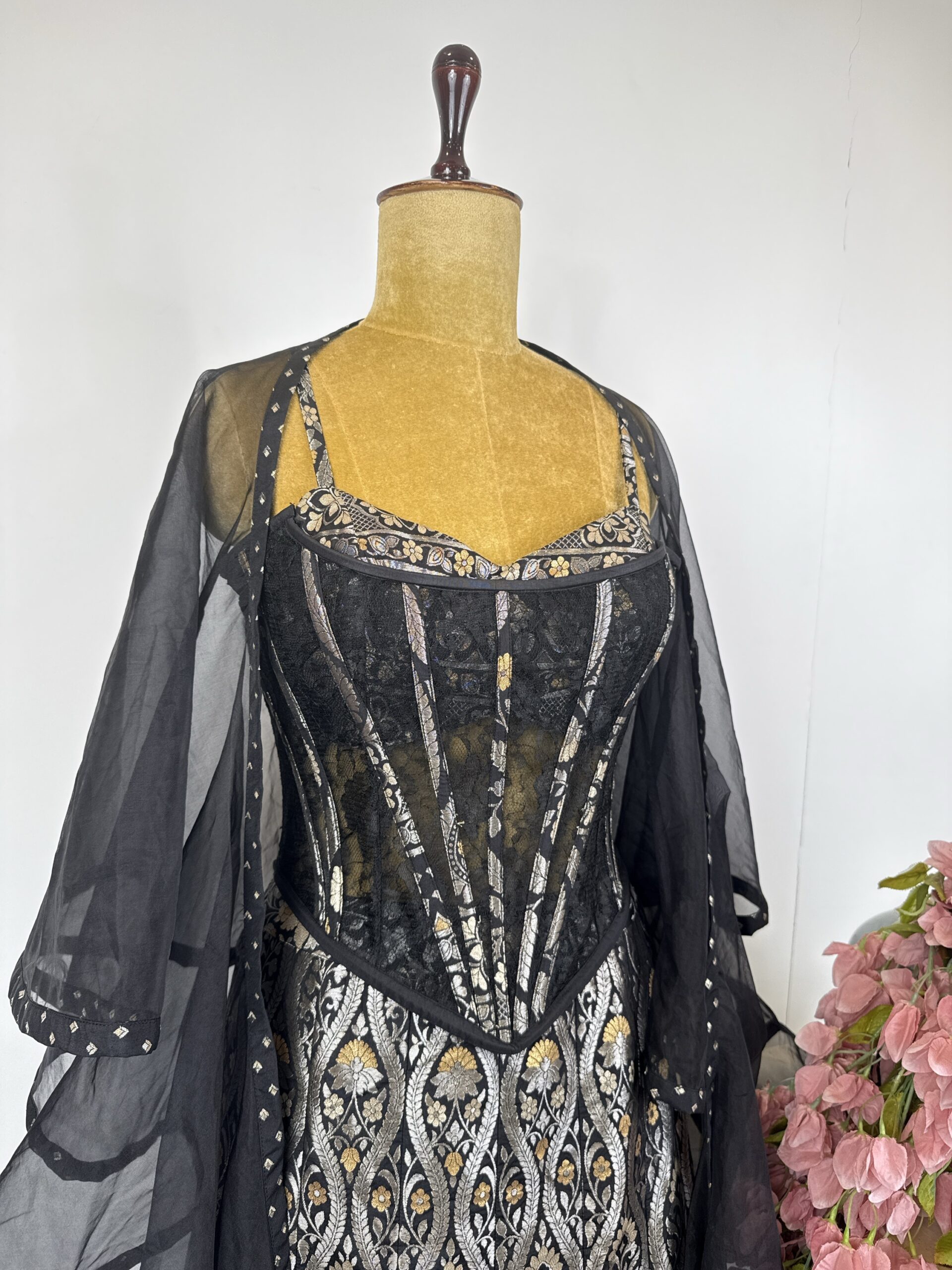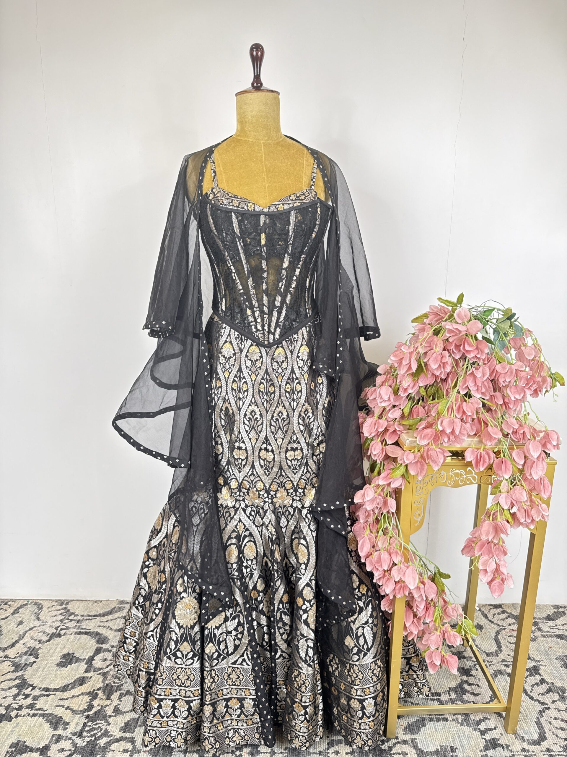 Black colour Banarasi brocade fitted lehenga with corset top and paired with dupatta