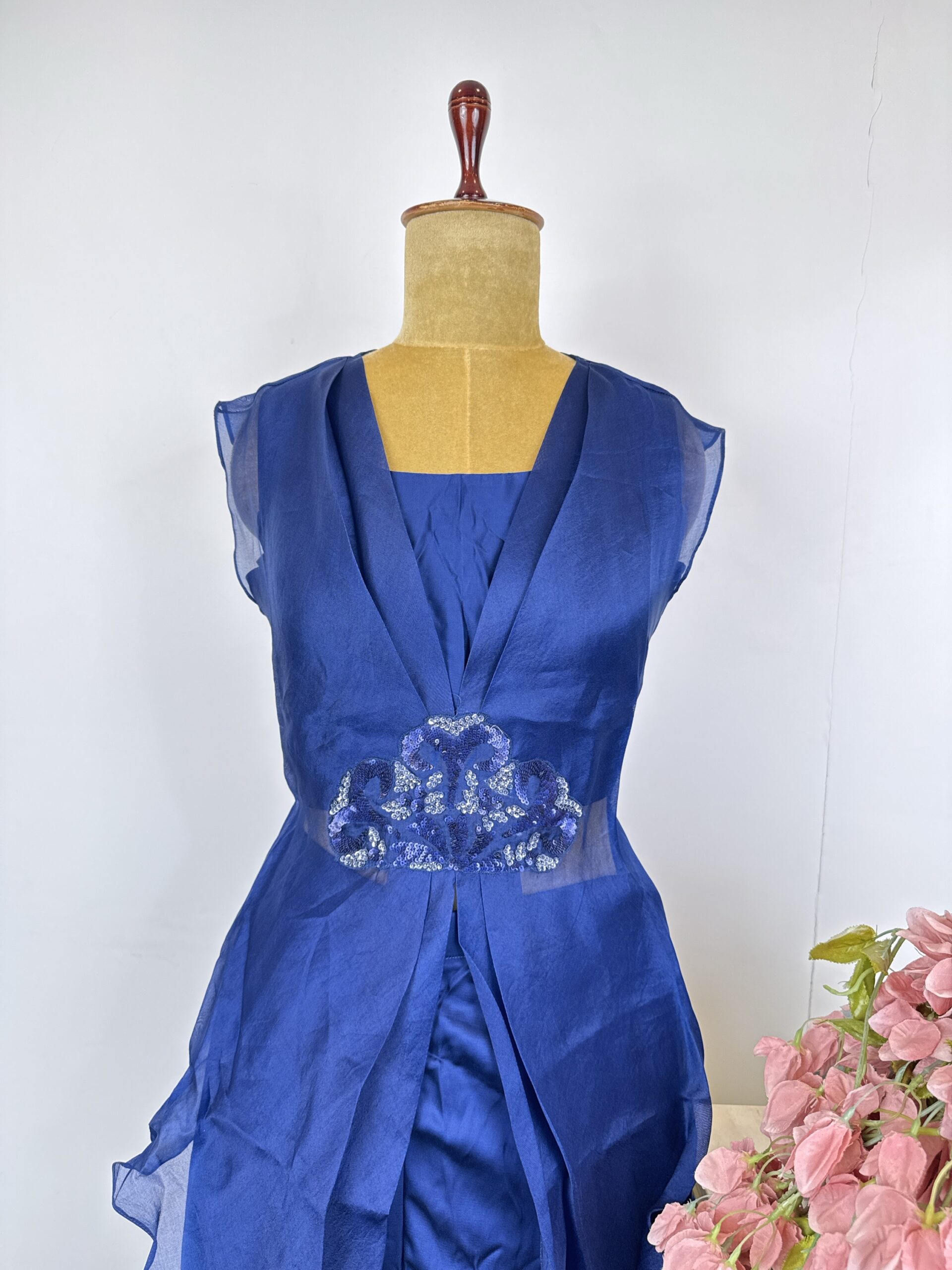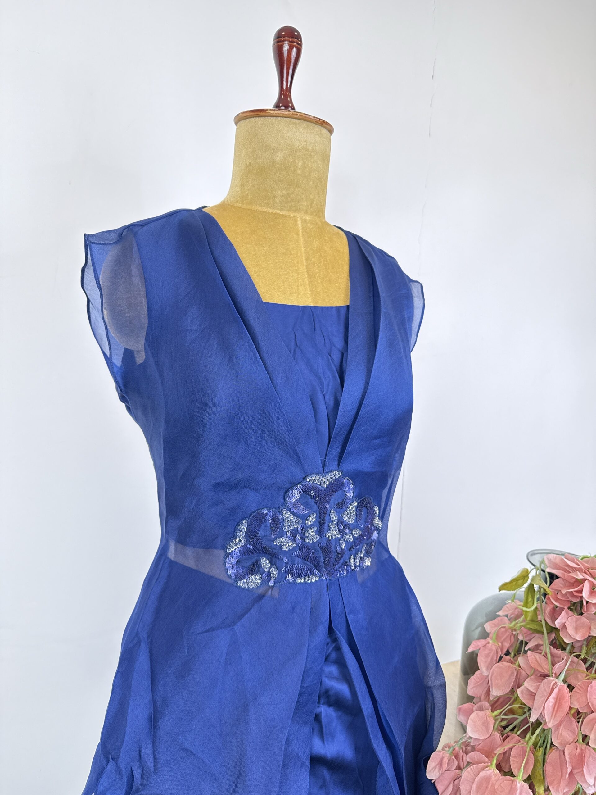 Blue colour indo western 3 piece set with flared pants and buster and jacket