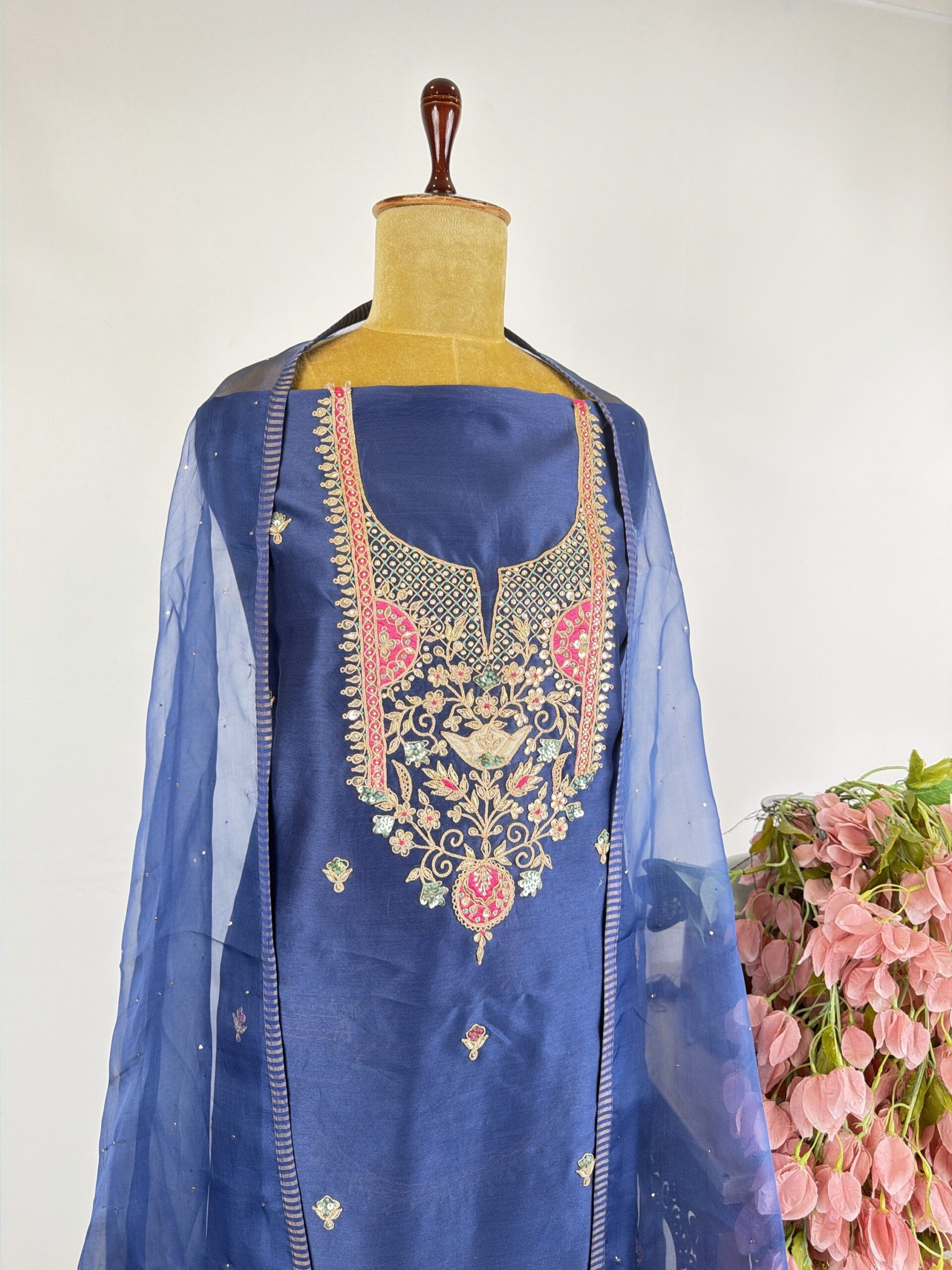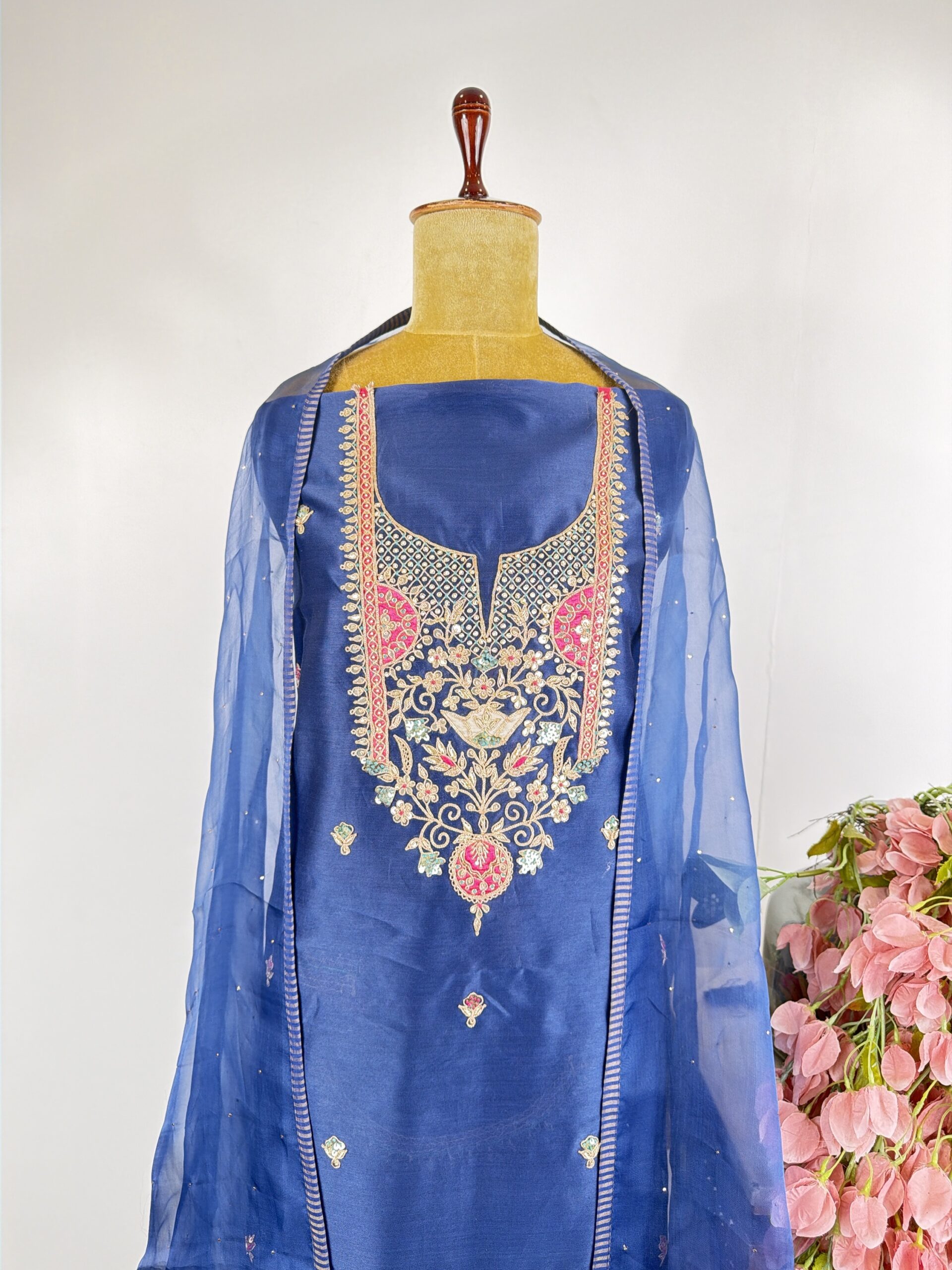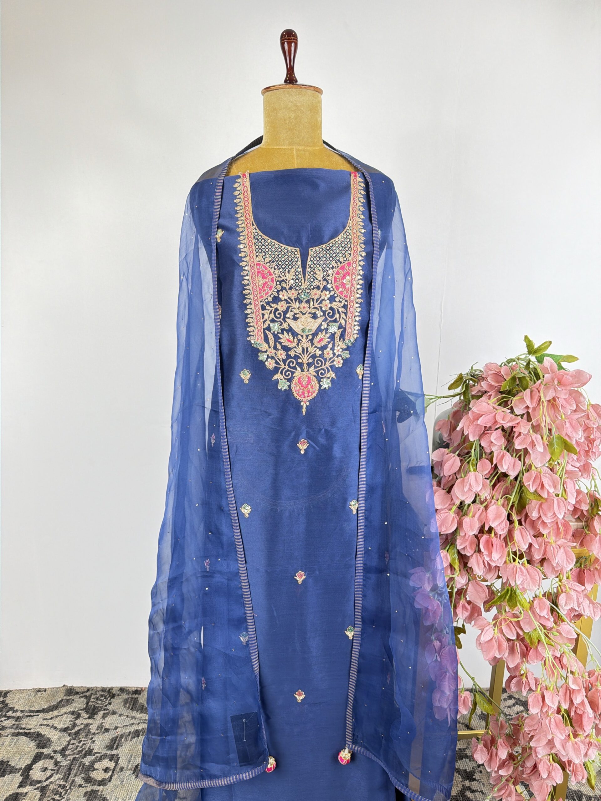 Blue colour organza unstitched suit with floral motifs with hand done embroidery paired with organza dupatta