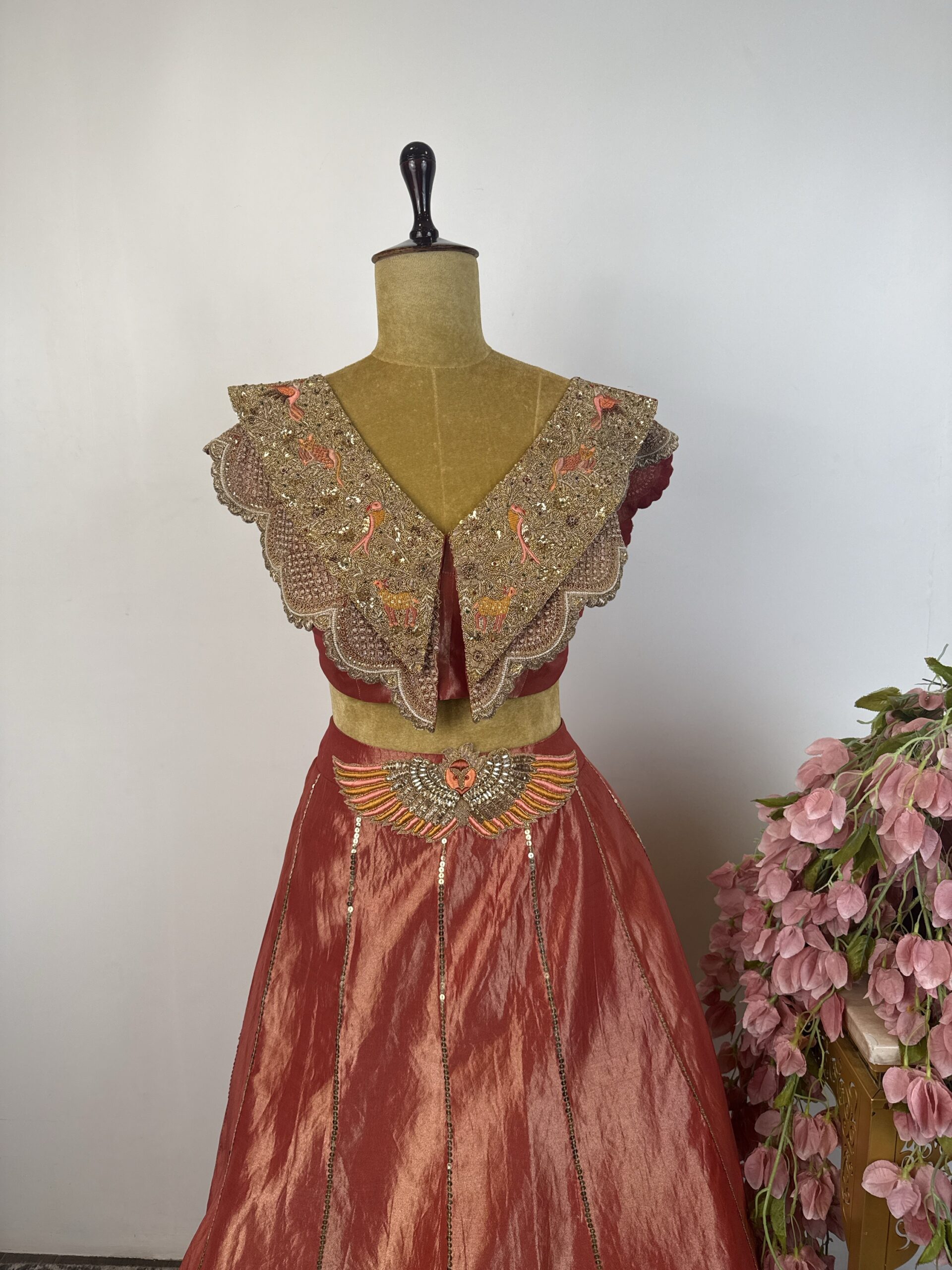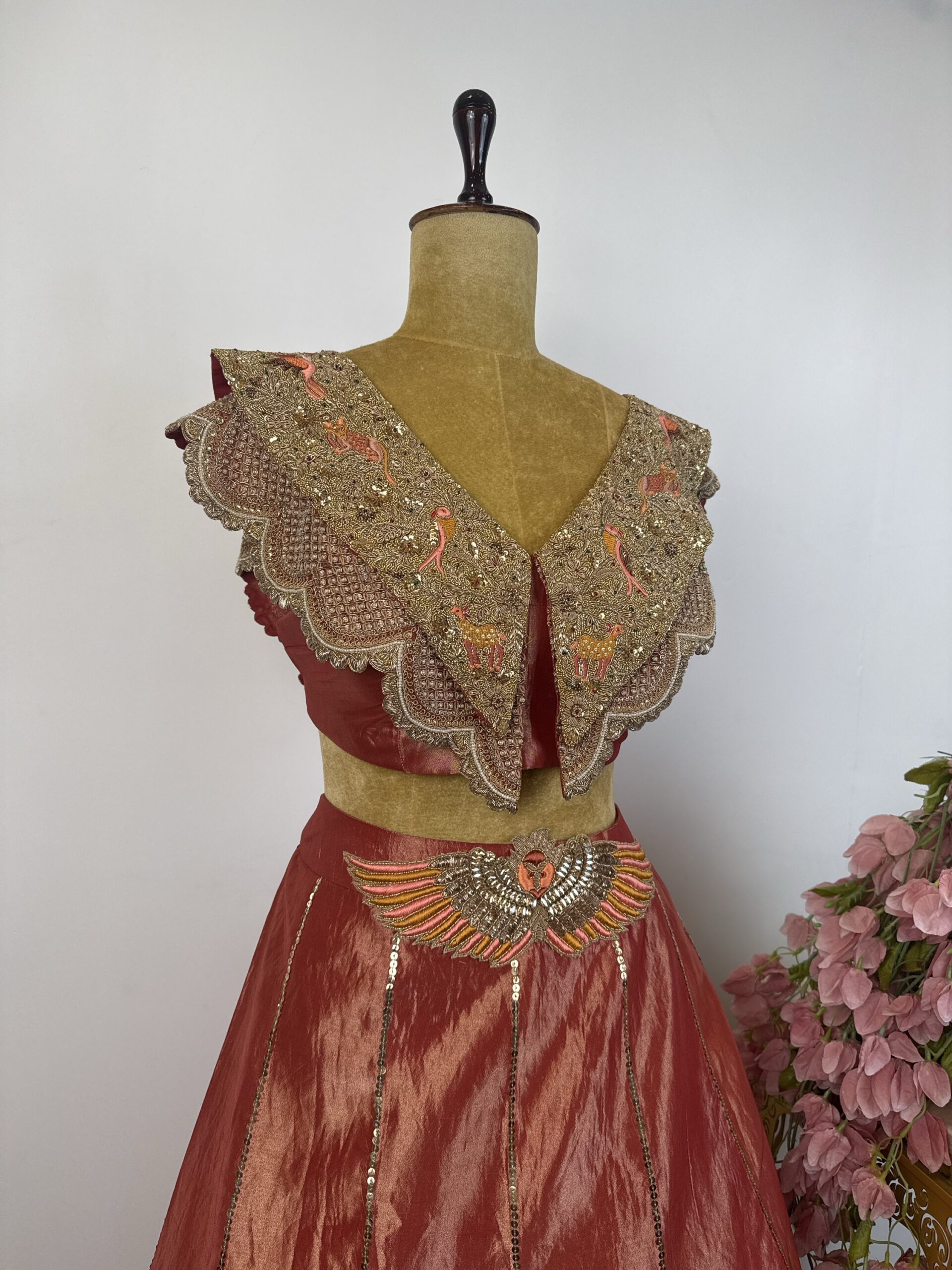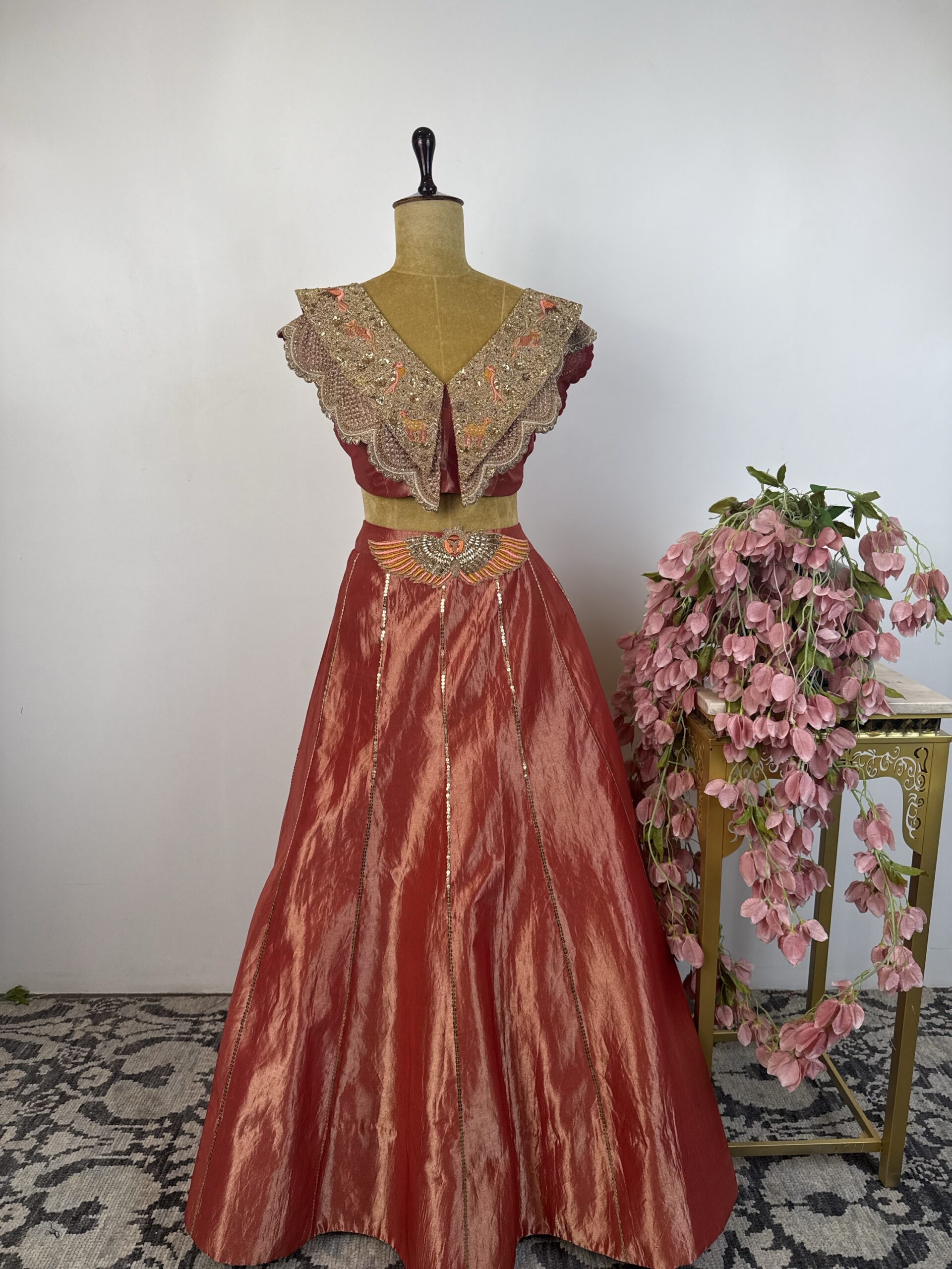 copper-rust red lehenga with golden sequence work and features intricate hand embroidery, beautifully detailed with pearl embellishments and rich zardosi work