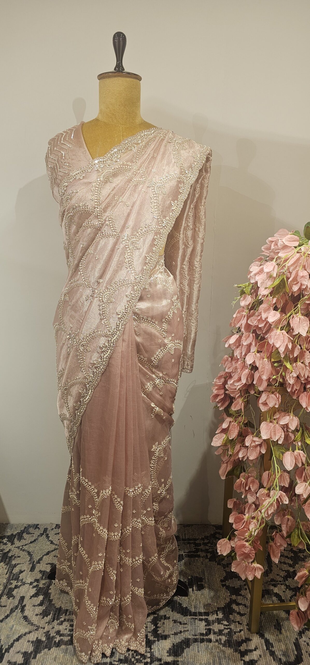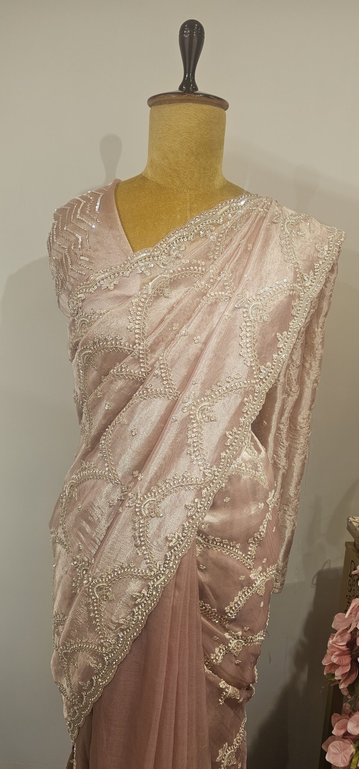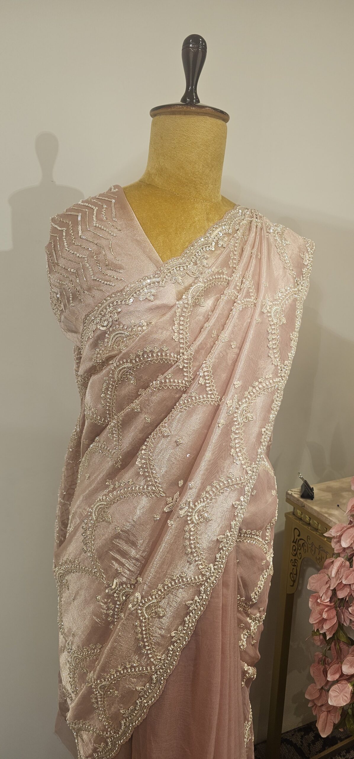 Coral pink colour tissue organza saree with beautiful hand done cutdana and sequence work with jal concept all over the saree
