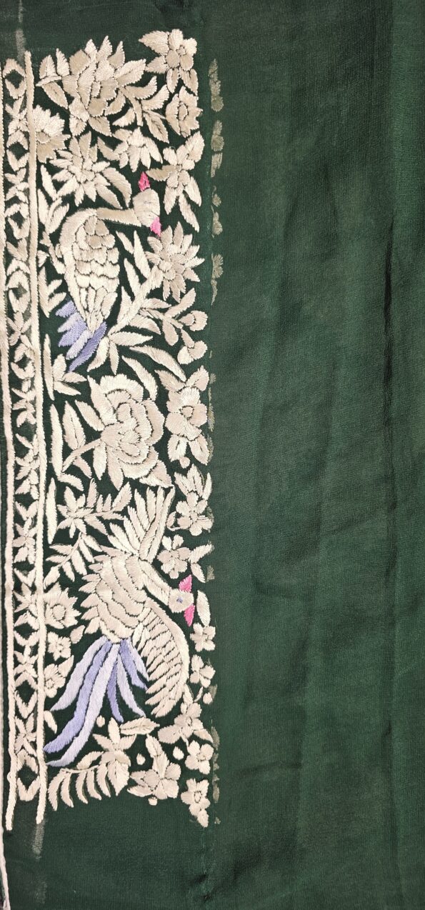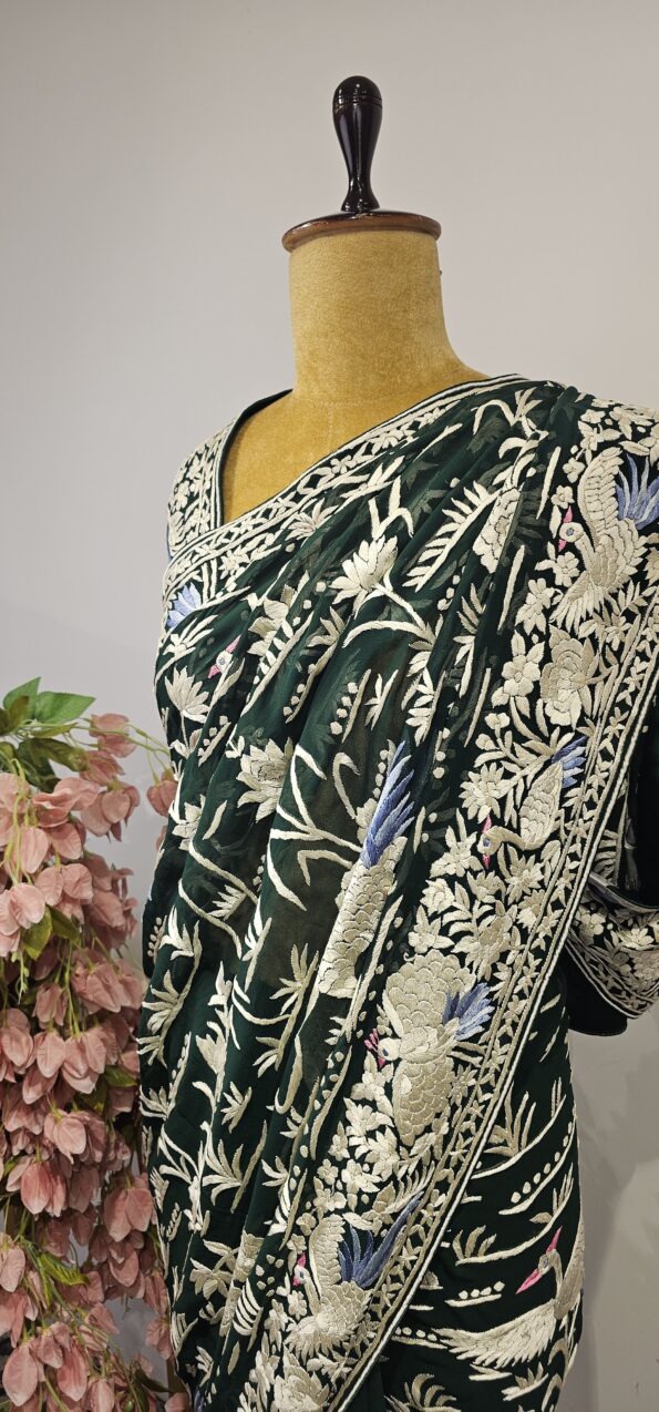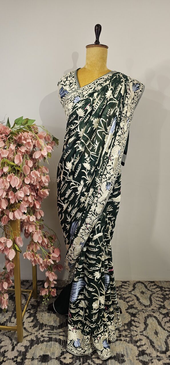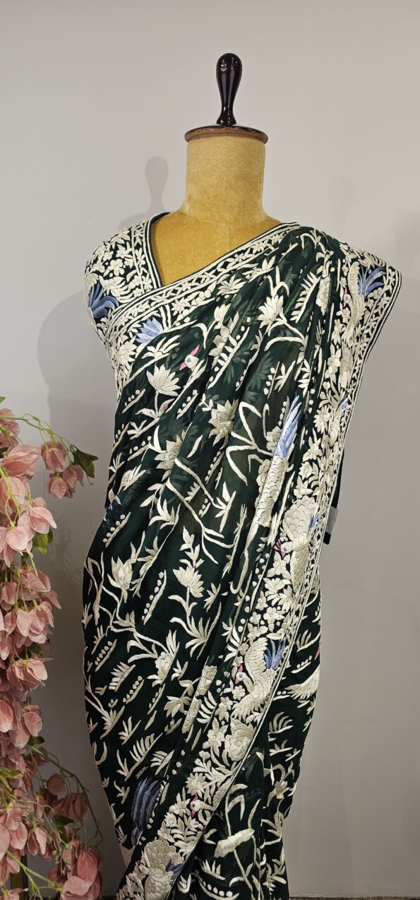 Dark green colour georgette saree with floral and birds motifs all over saree with thread embroidery (parsi gara)