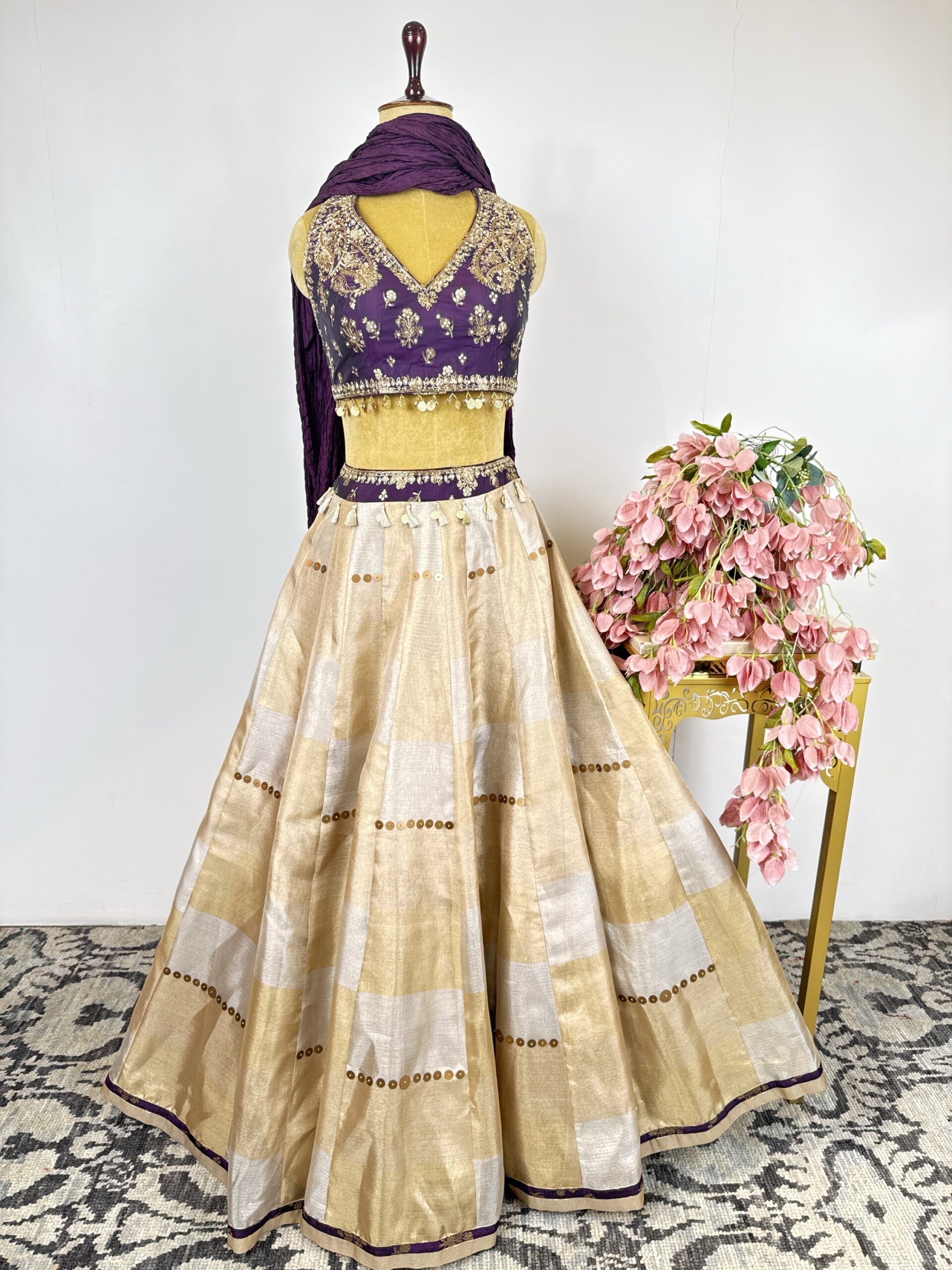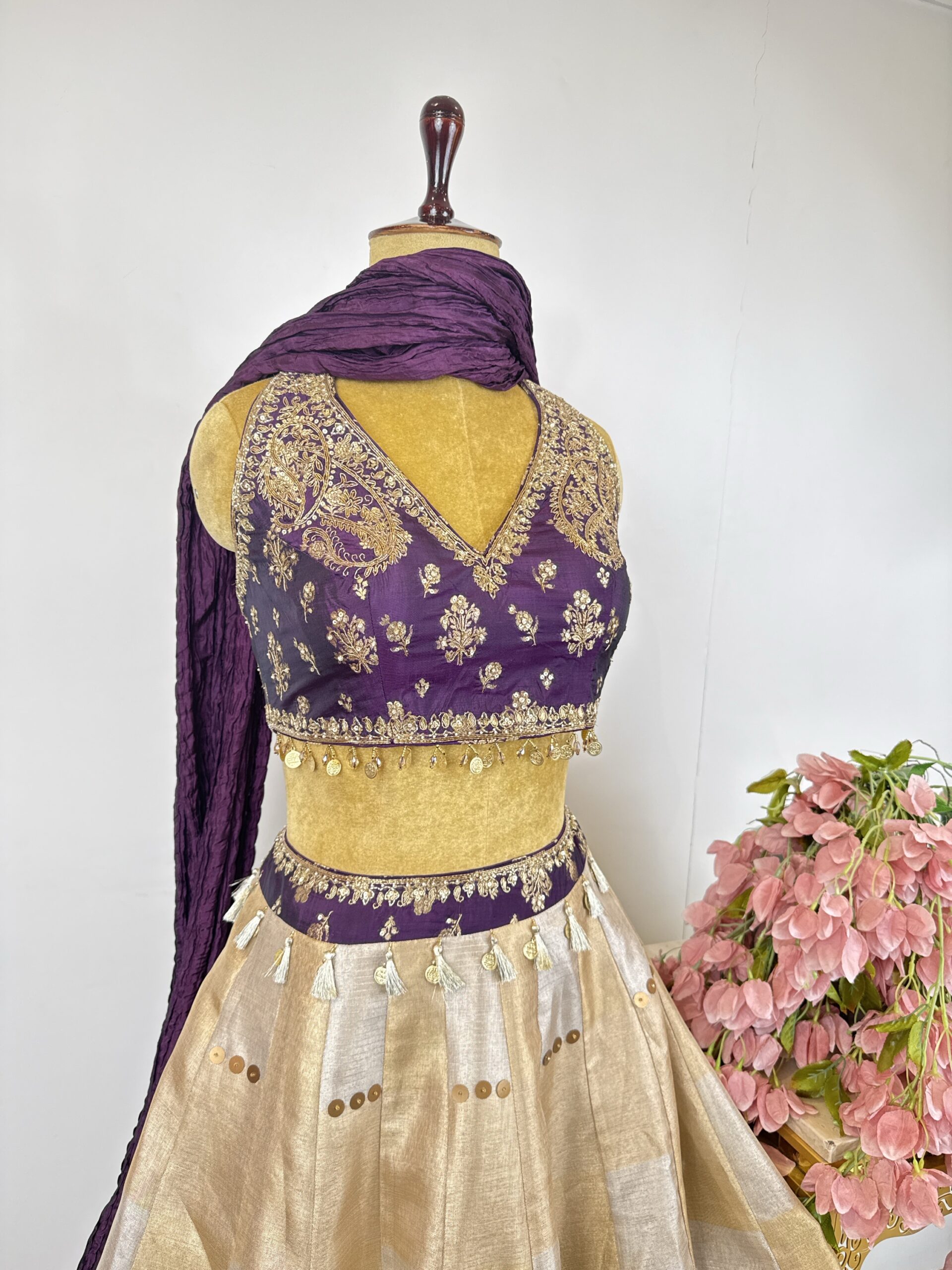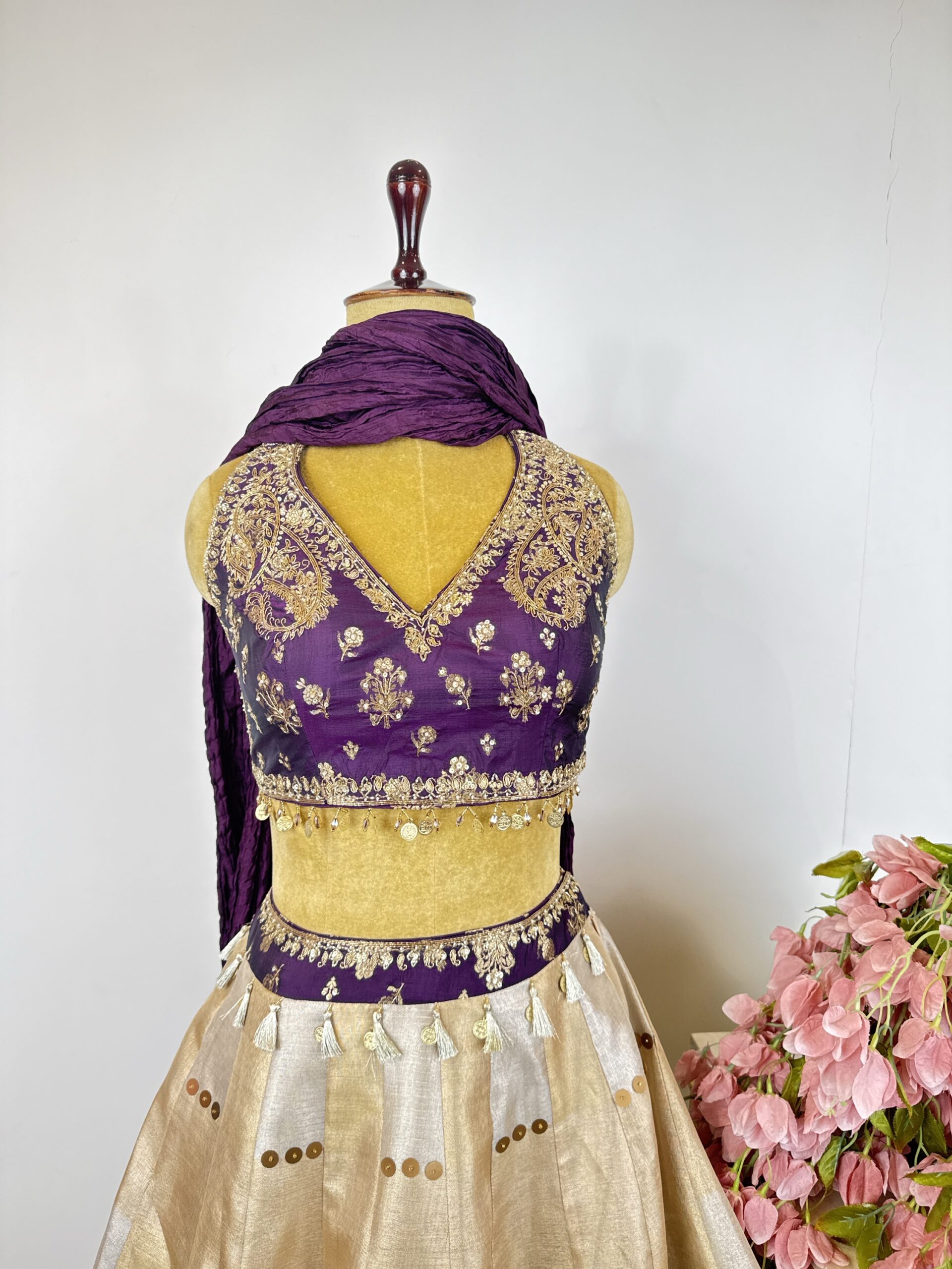 Gold and silver colour tissue lehenga with purple colour blouse embroidered with Zardosi and sequins and paired with dupatta
