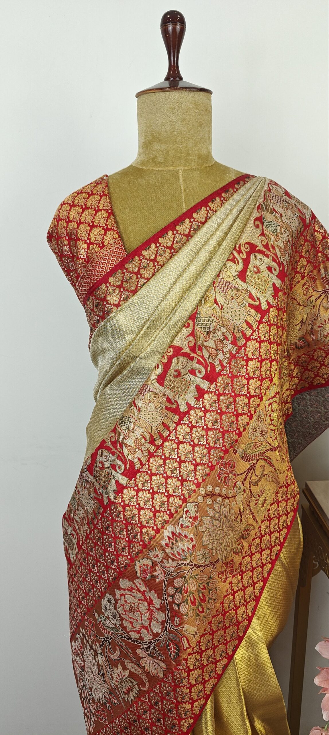 Gold color Kanchi saree with self weaving with contrast red color border with elephant and floral motifs
