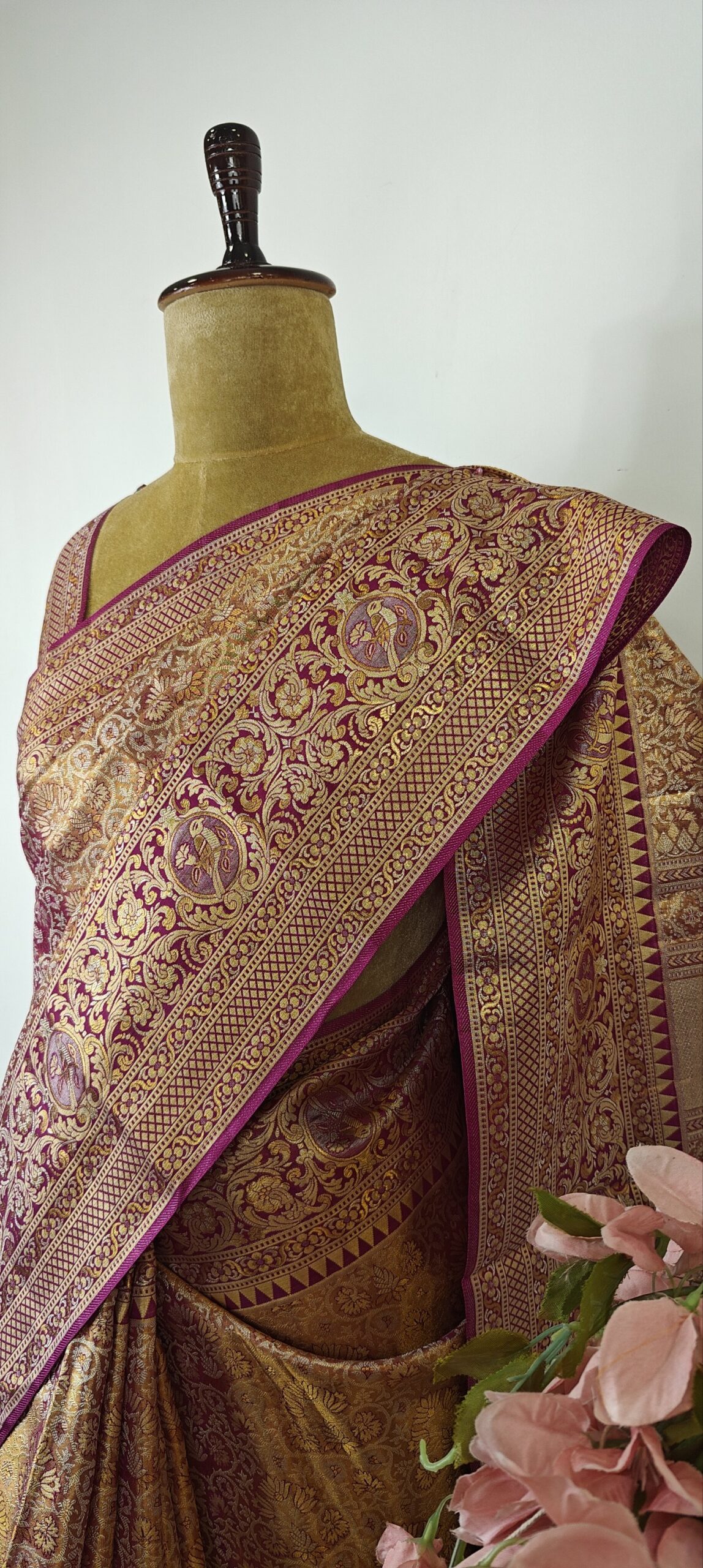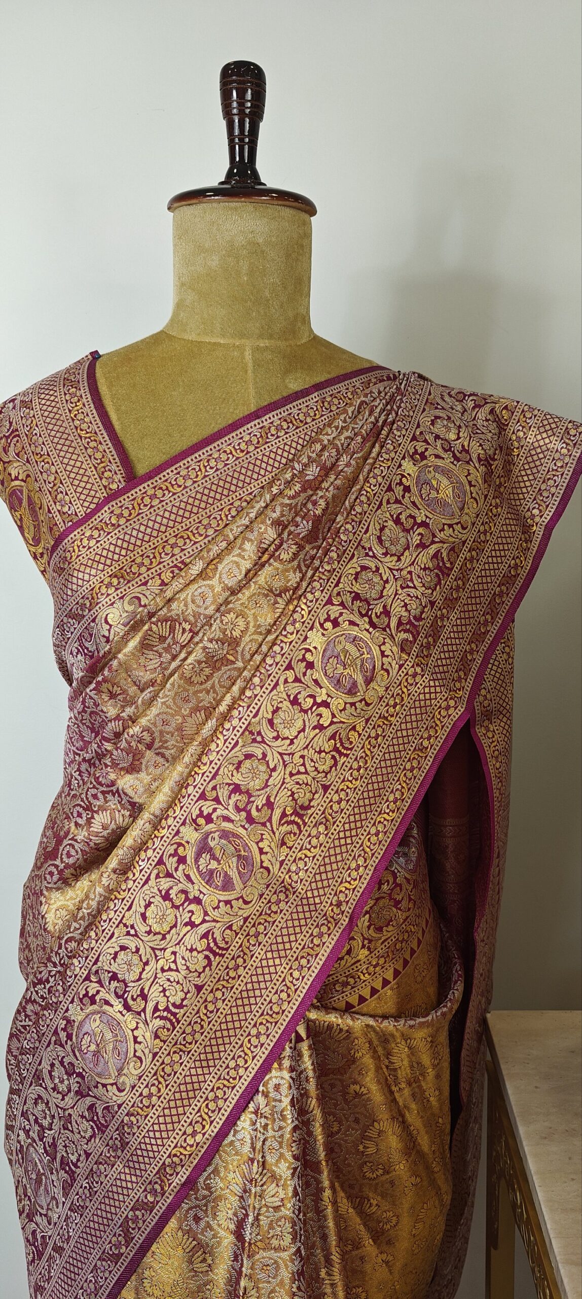 This elegant gold Kanchi silk saree is a celebration of timeless tradition and refined craftsmanship. It features an all–over intricate floral brocade weave on a rich gold base with purple zari border, traditional geometric patterns.