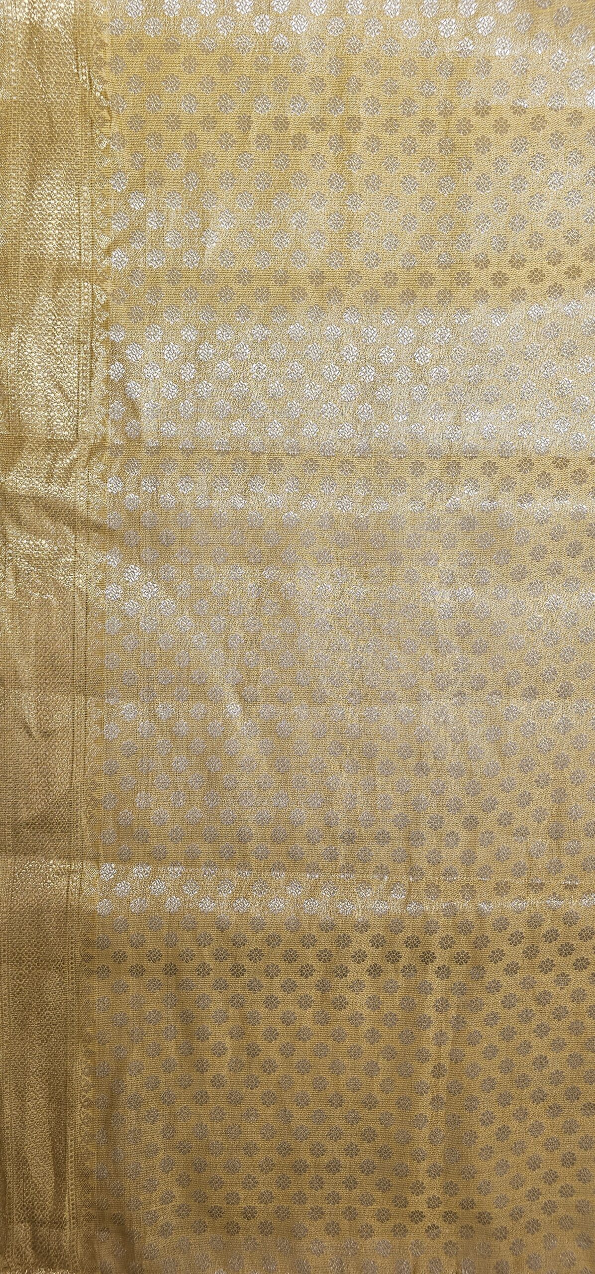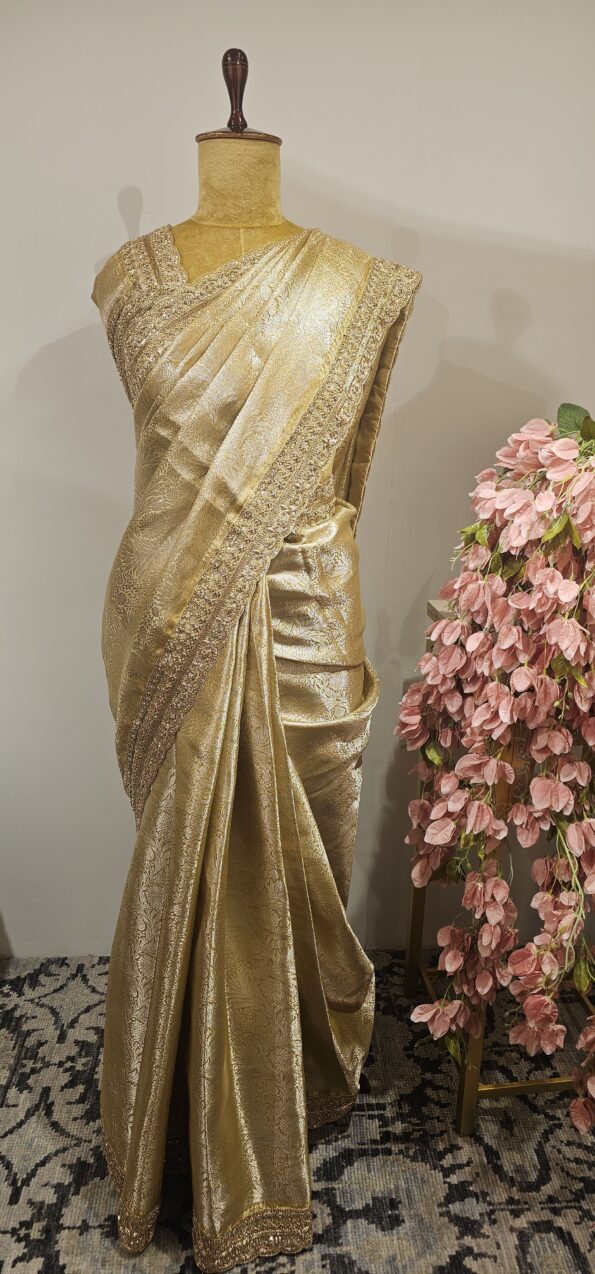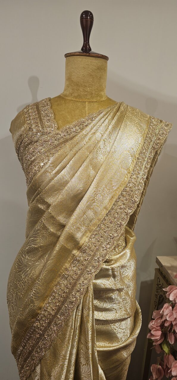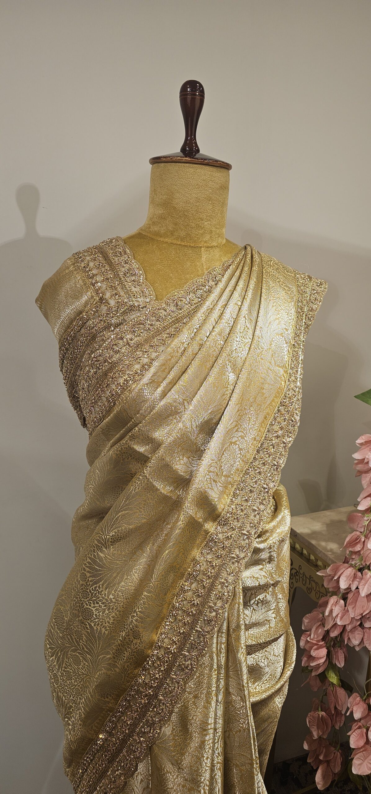 Gold colour banarasi tissue saree with all over floral weave and with beautiful hand done zardosi border