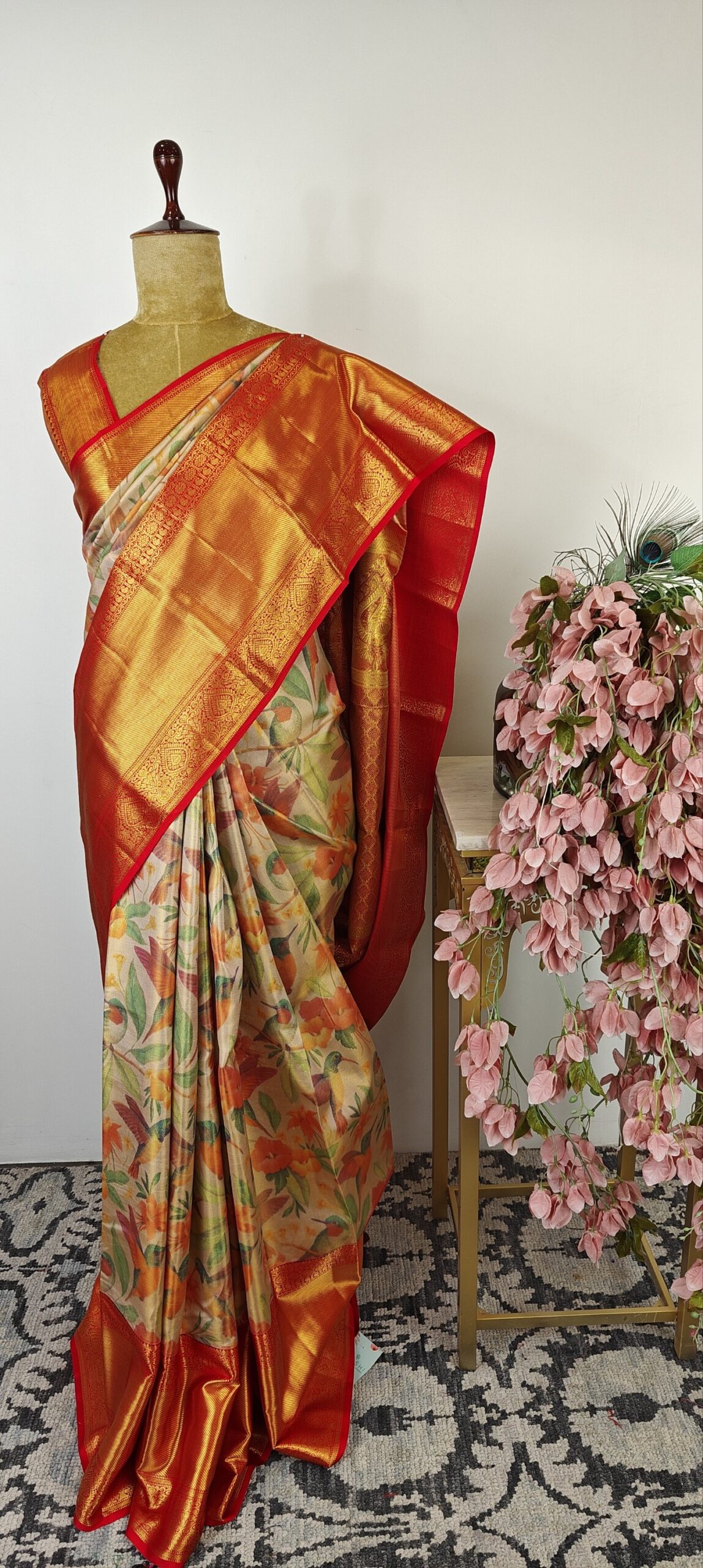 Gold Floral printed Kanchi silk saree with gold zari border and rich pallu