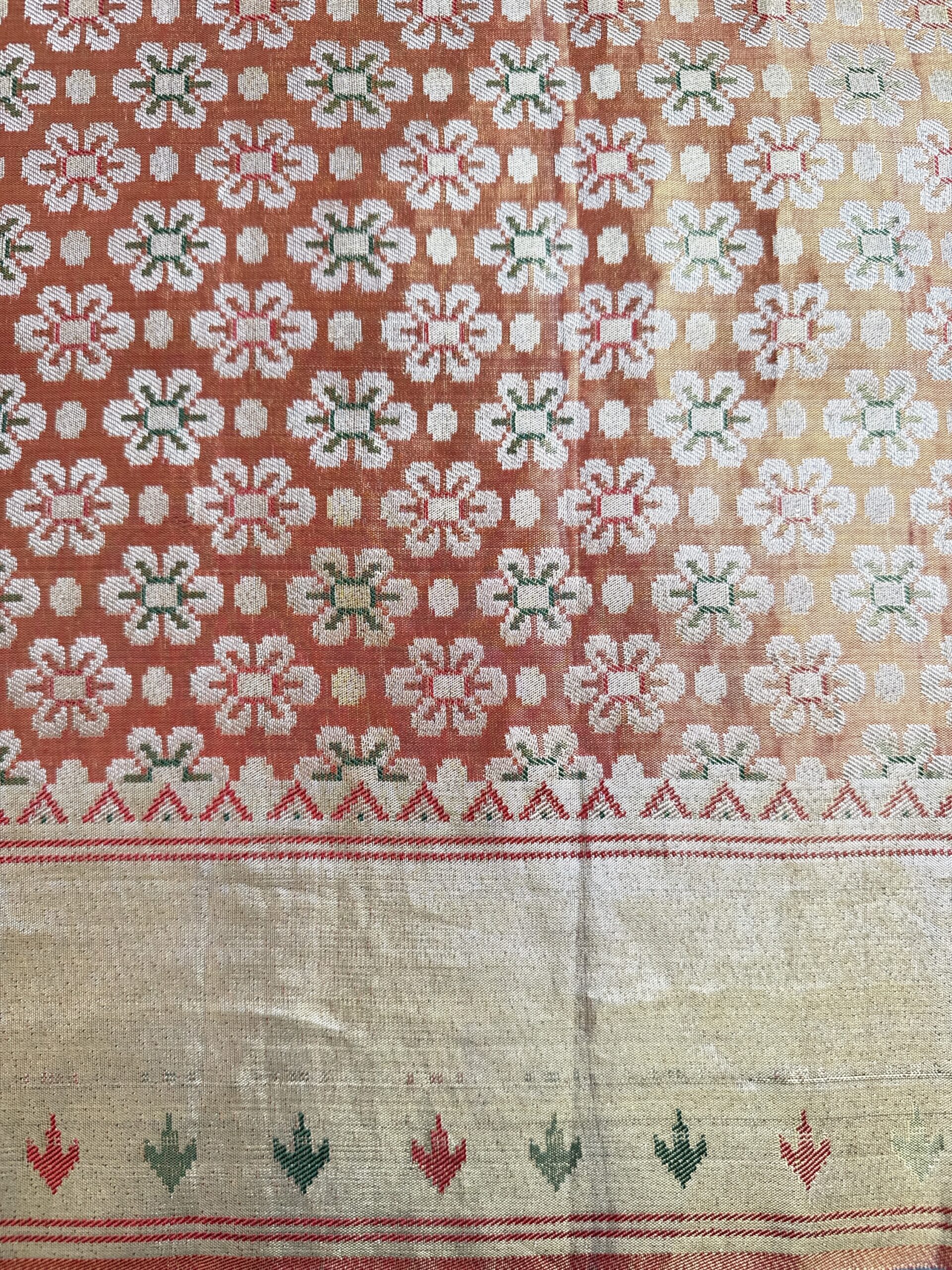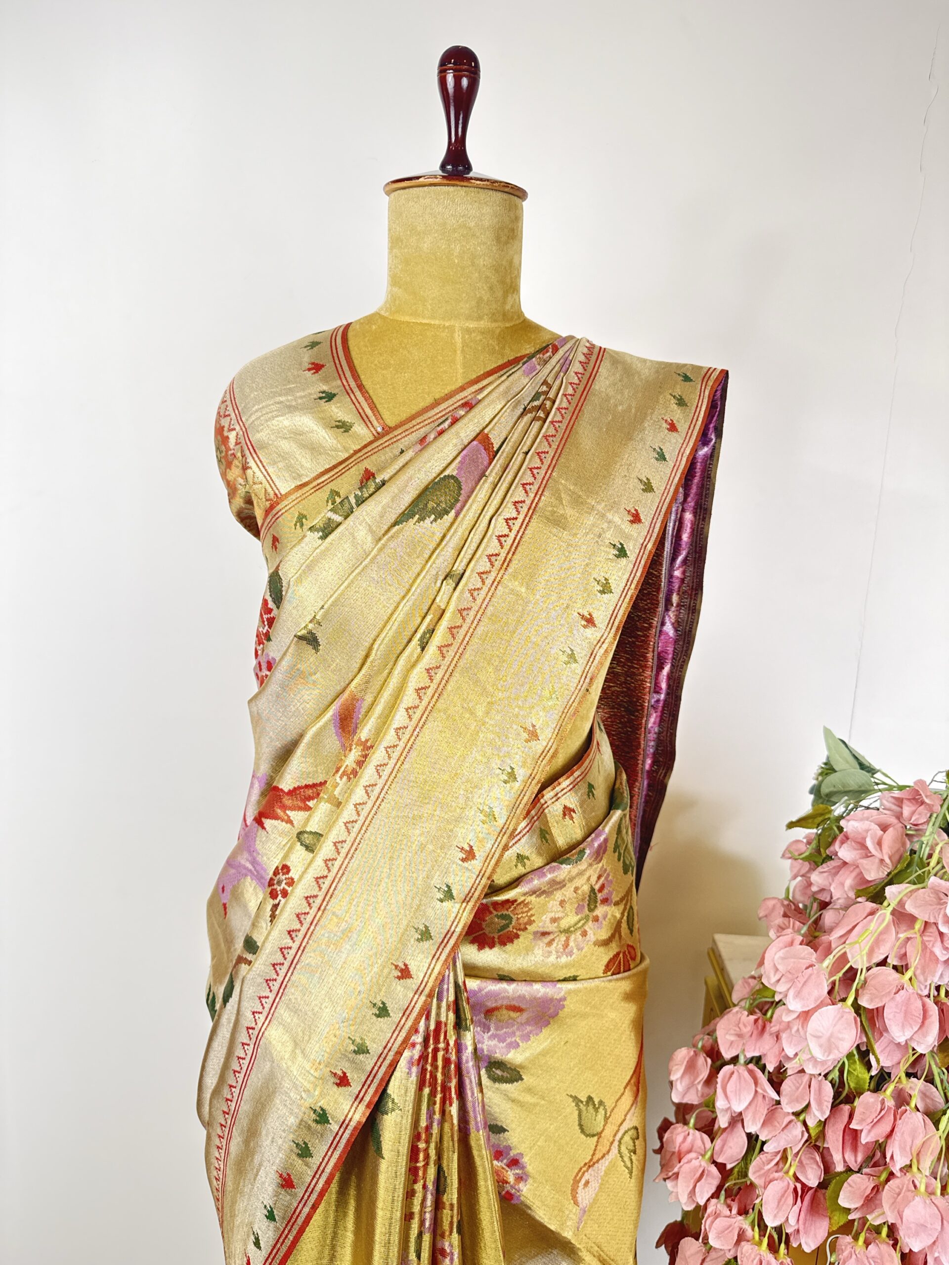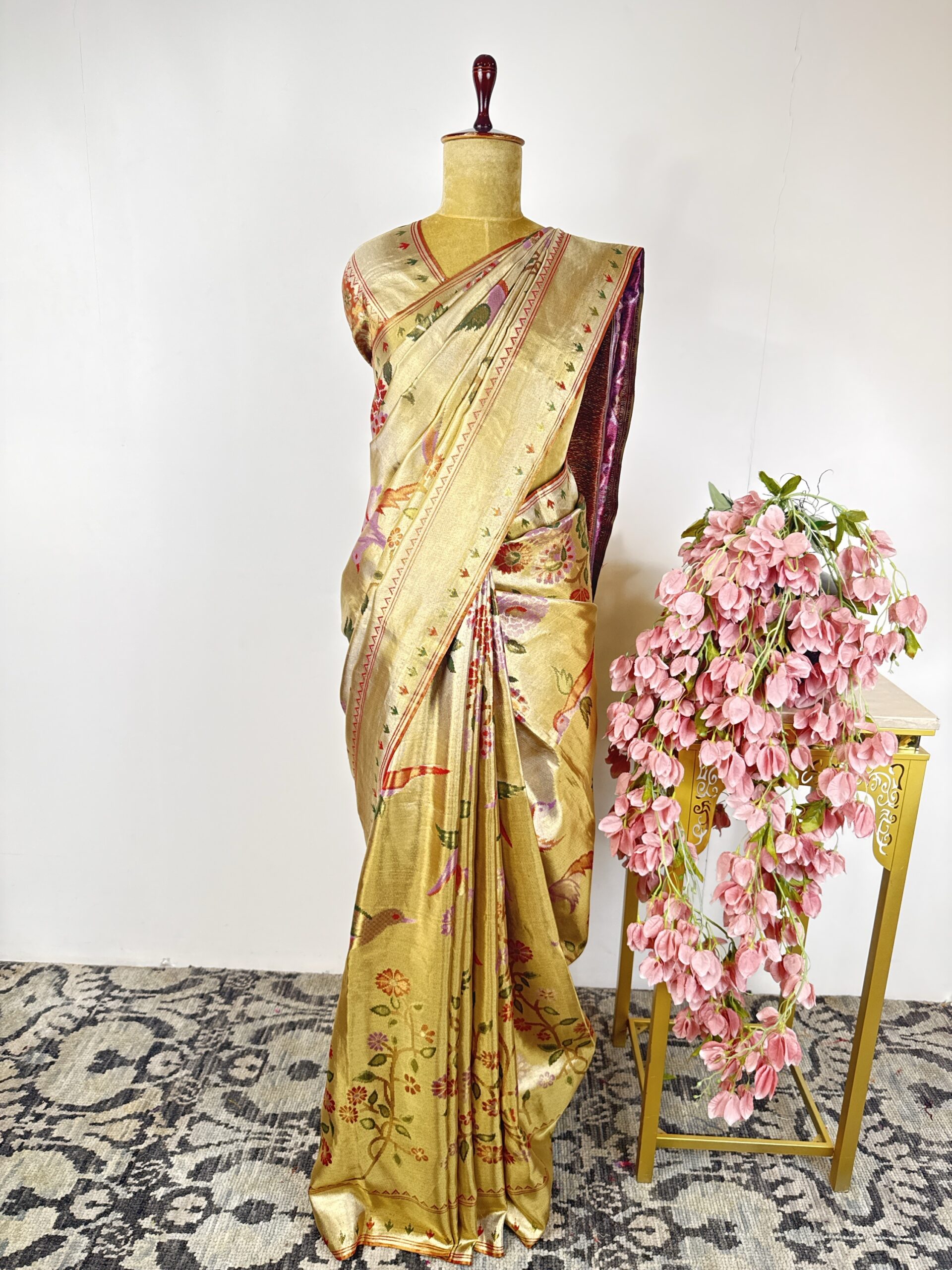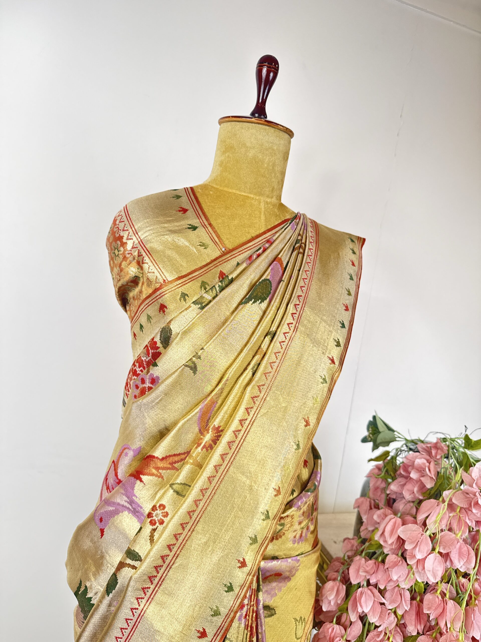 Gold Kanchi tissue saree with jamdhani weave with birds and floral motifs