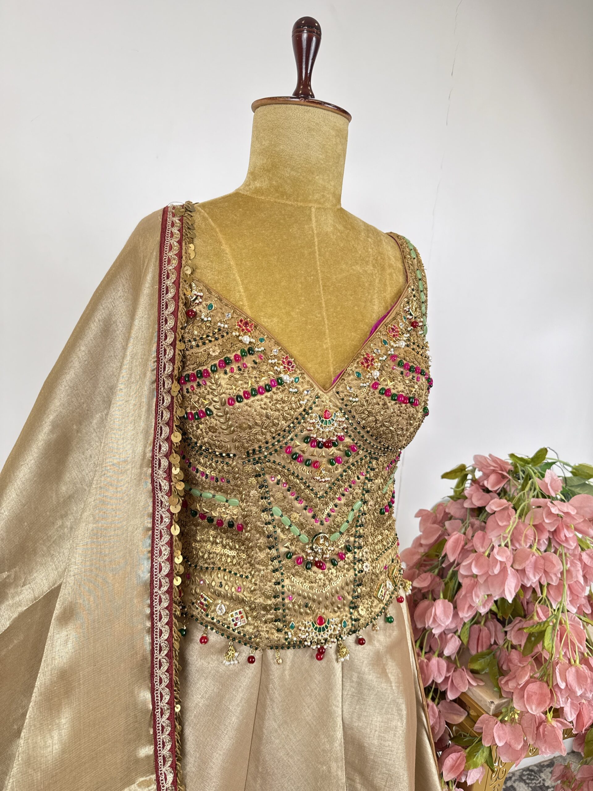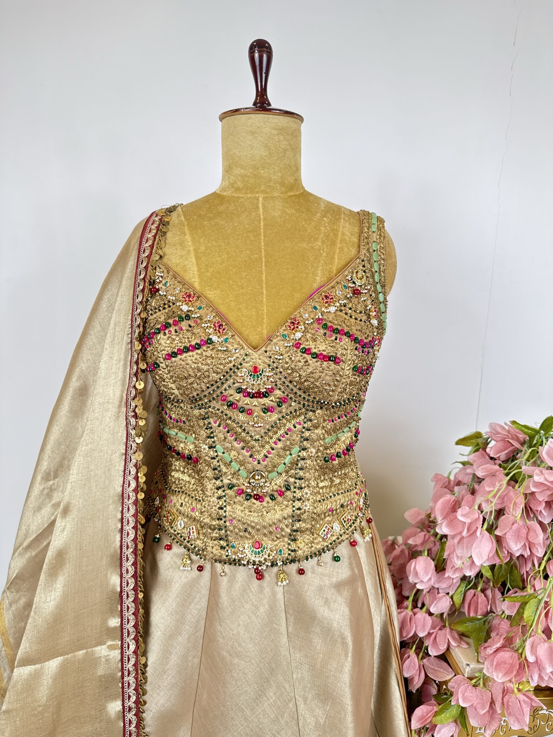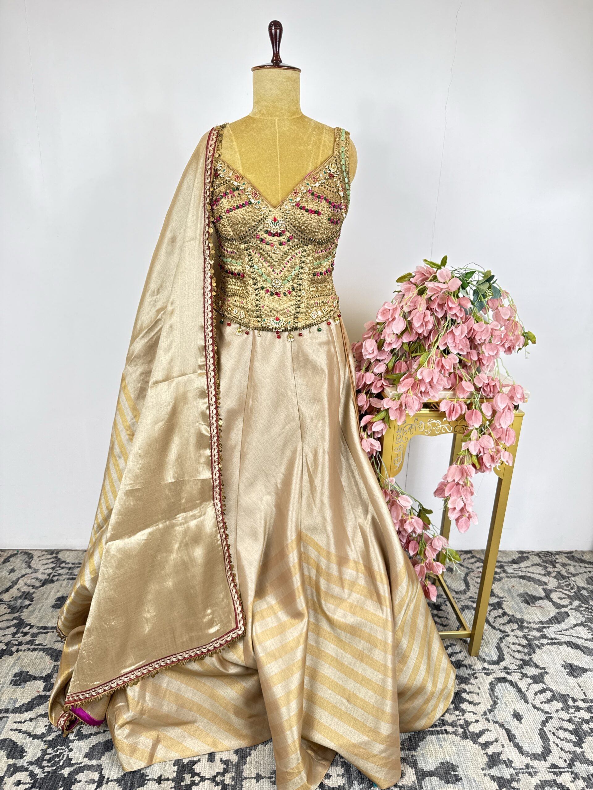 Gold tissue lehenga with highly embroidered corset with beads, pearls,pendants and thread embroidery paired with tissue duppatta with tassels border
