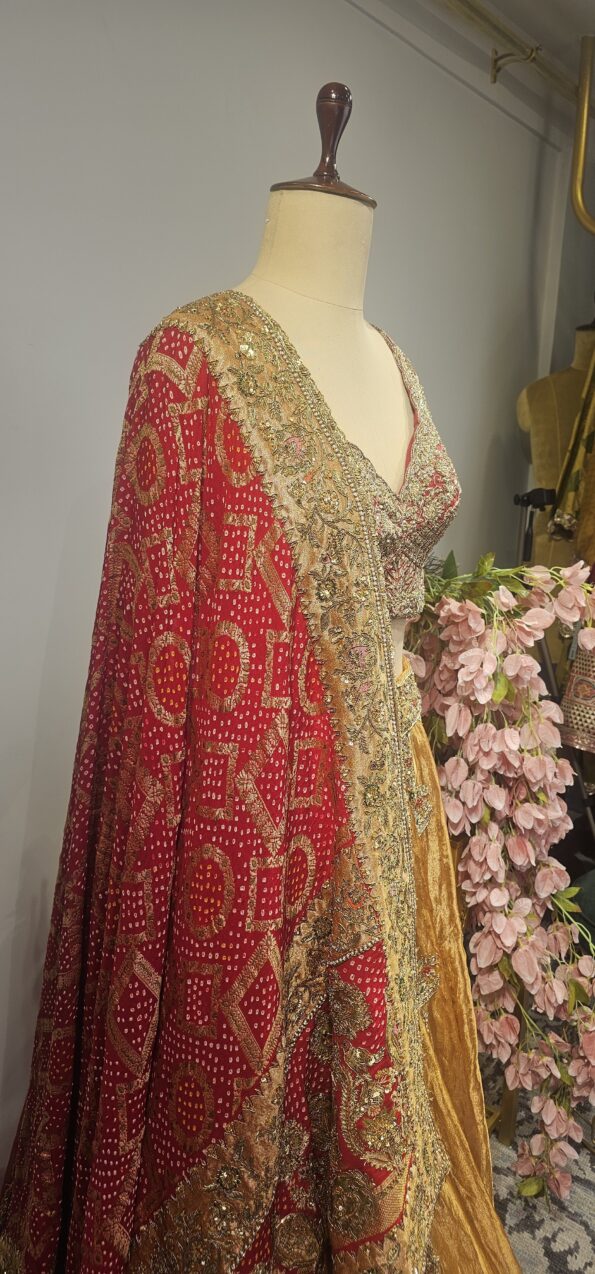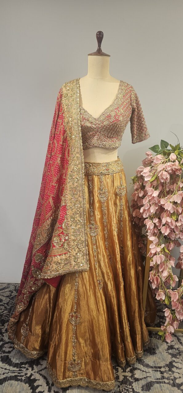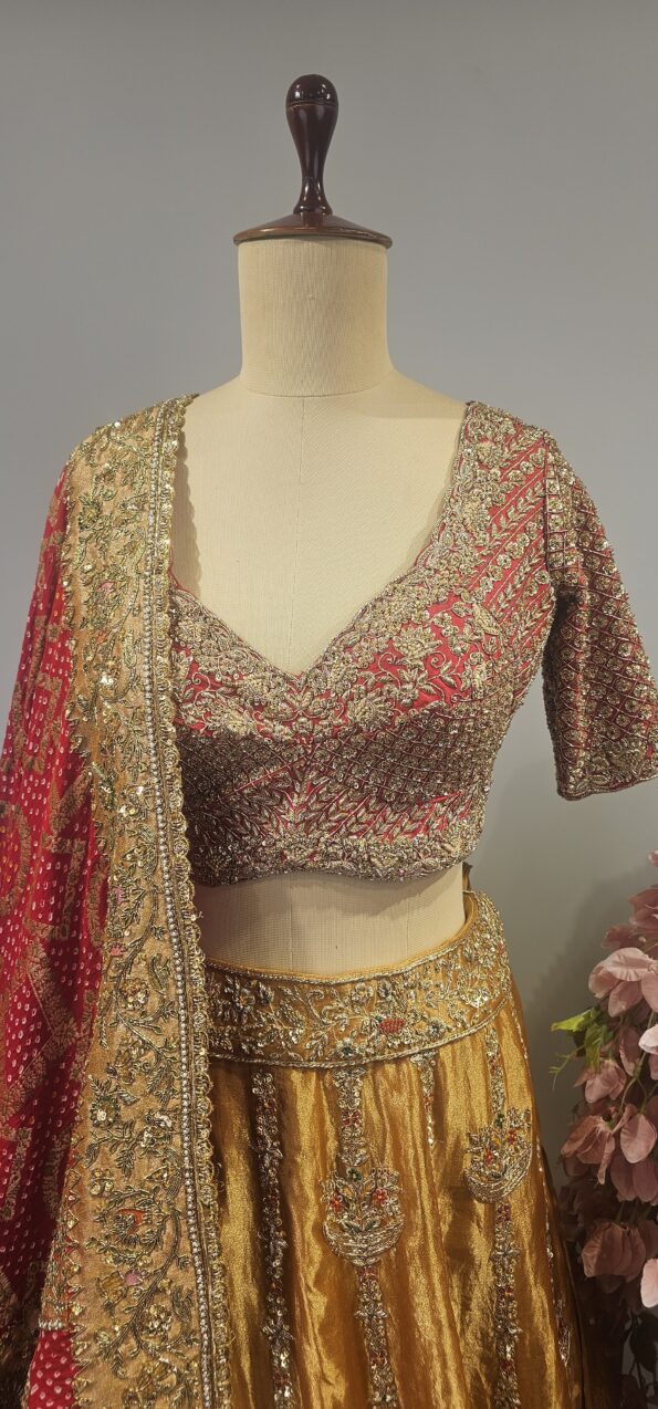 • Gold Tissue lehanga with red blouse and bandhani duppatta