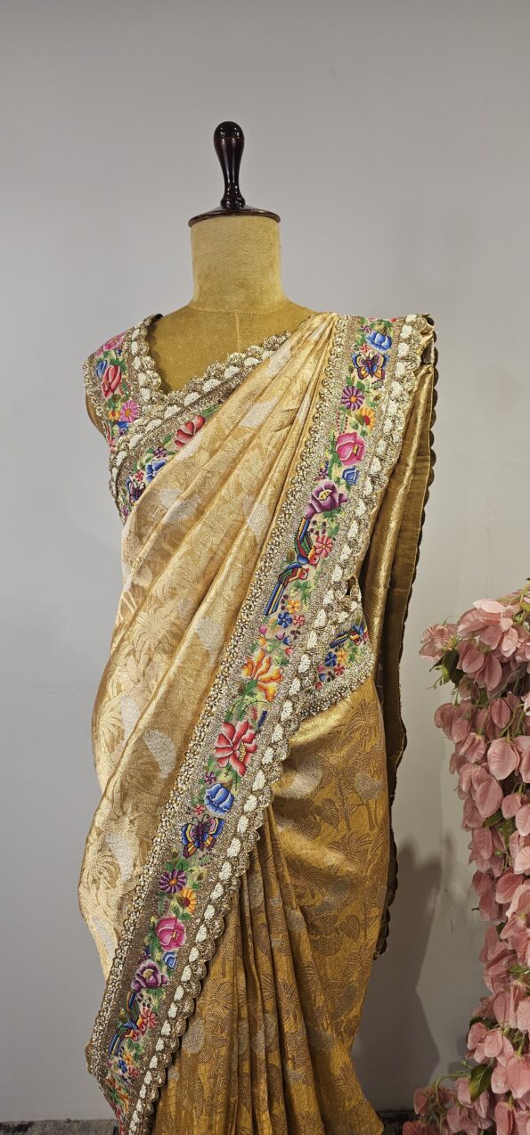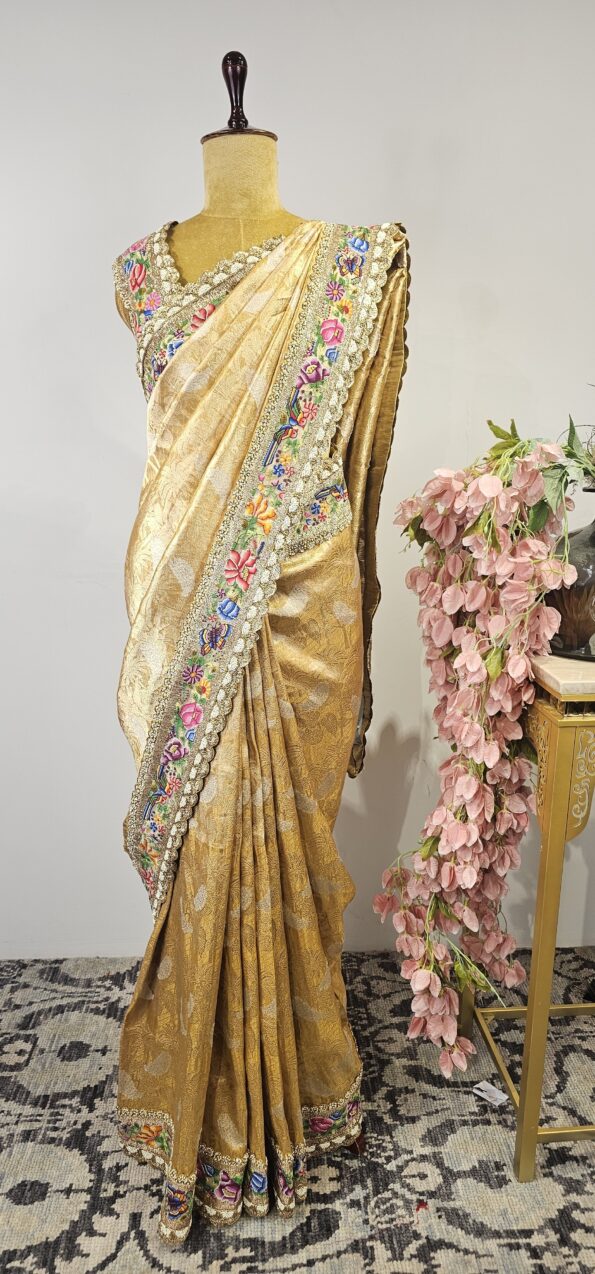 Golden banarasi tissue with petit point embroidery