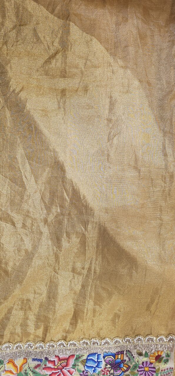 Golden banarasi tissue saree with petit point embroidery border.