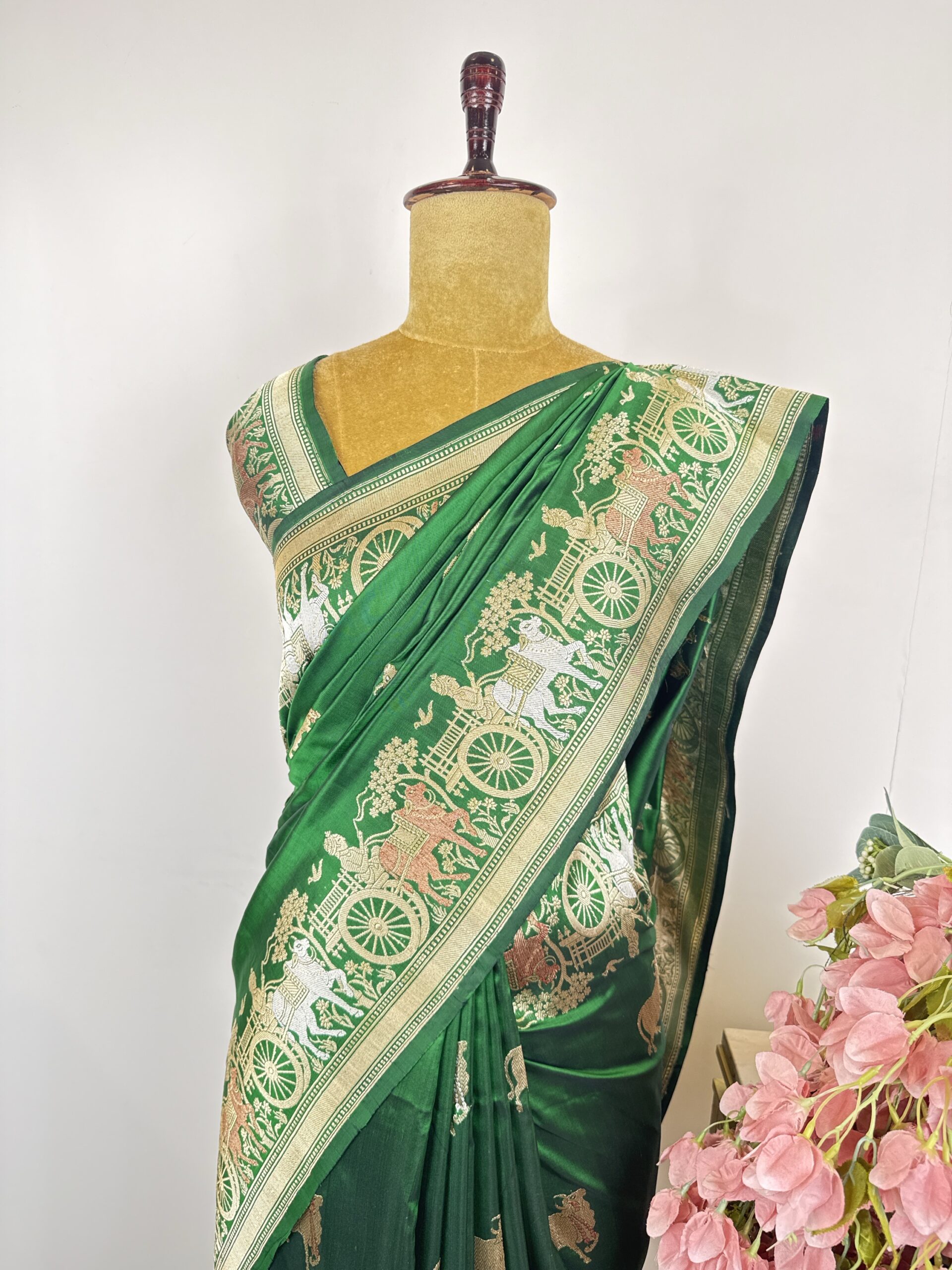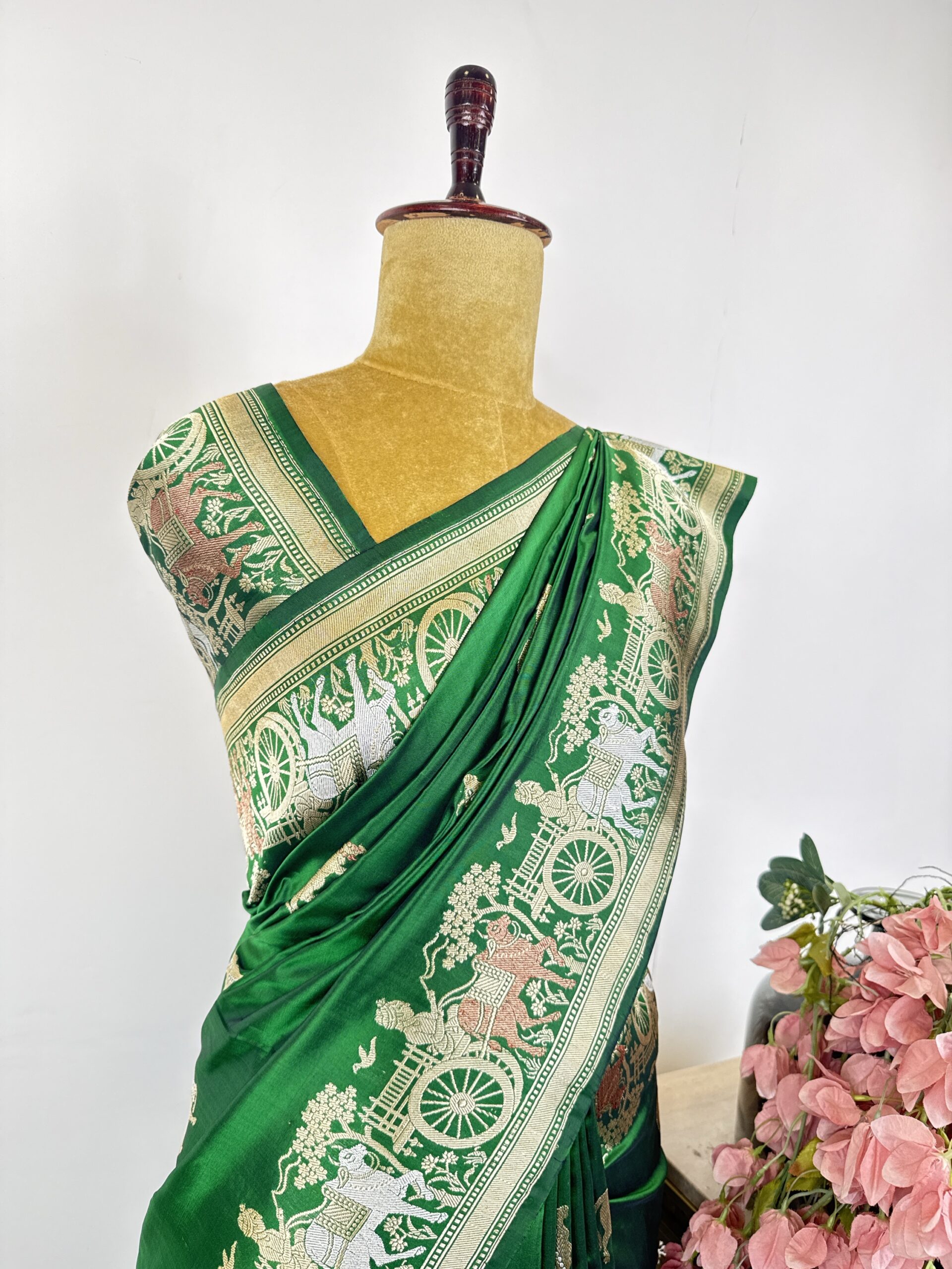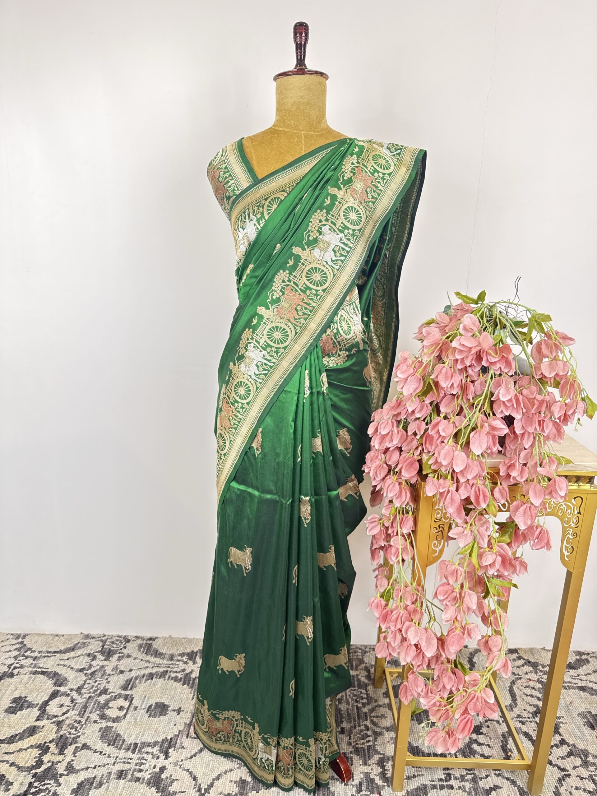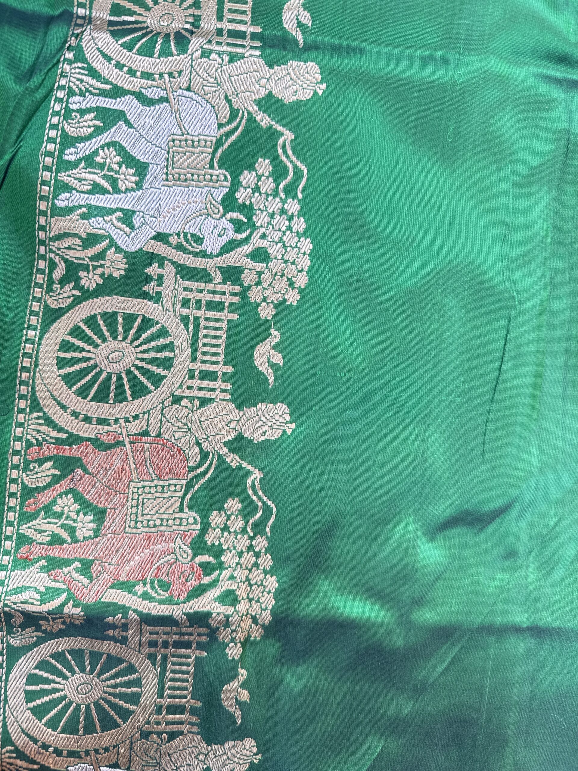 Green colour Banarasi silk saree with cows motifs and village theme border