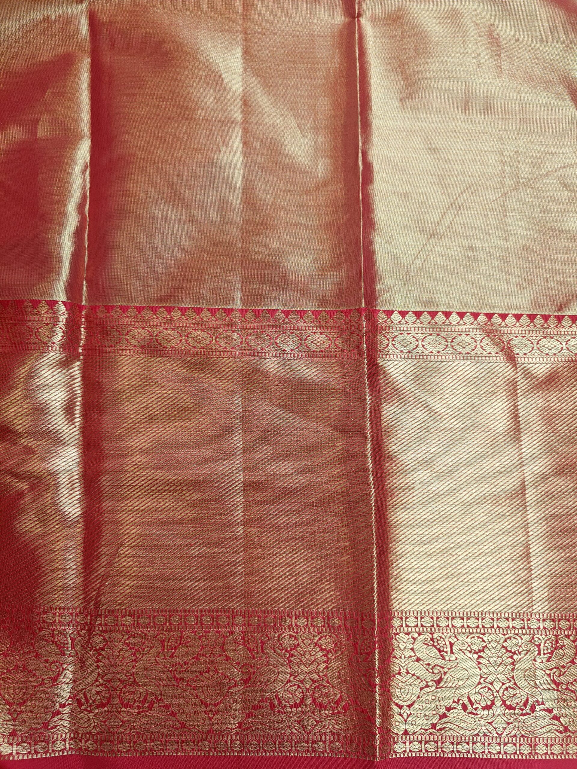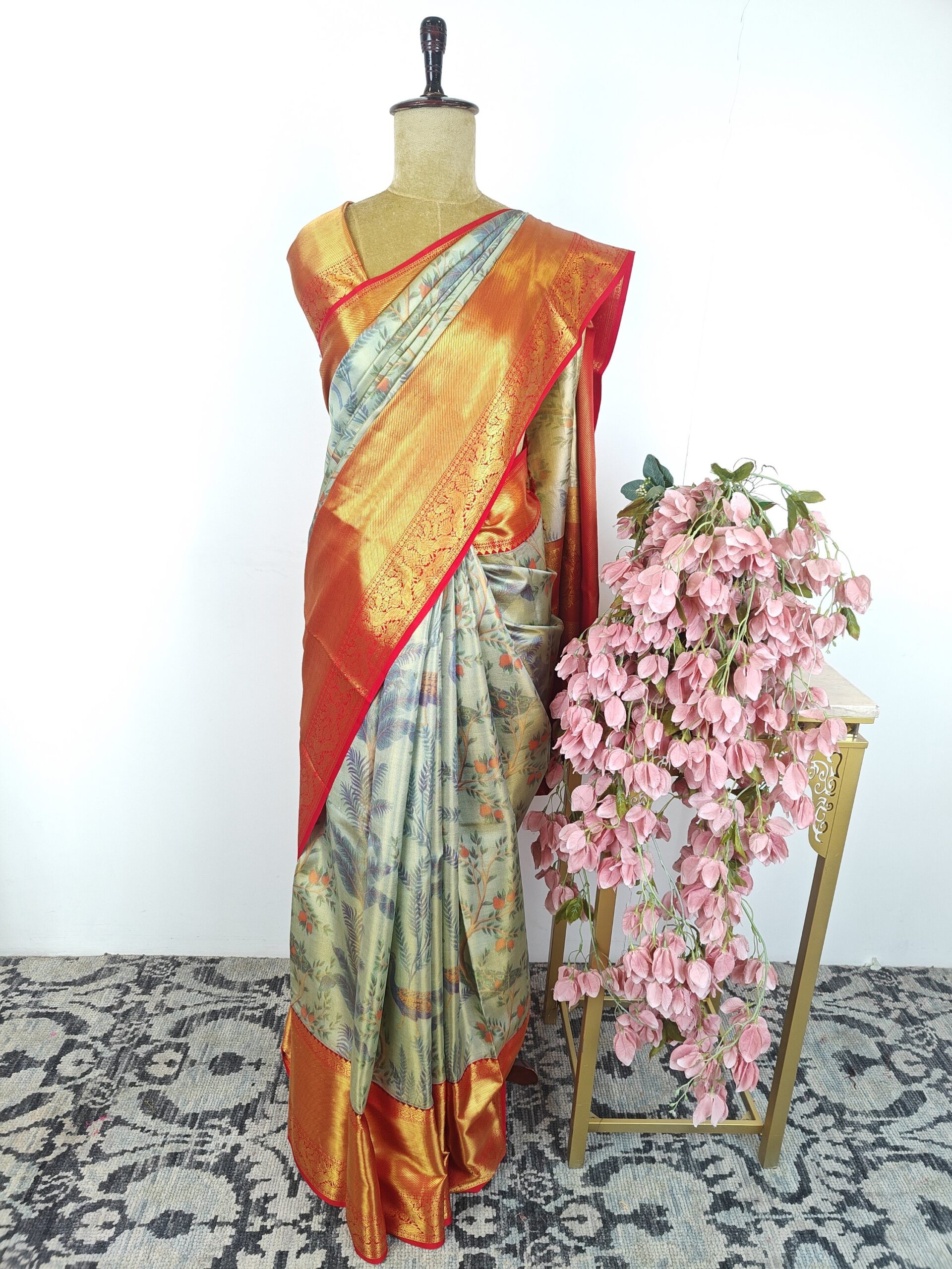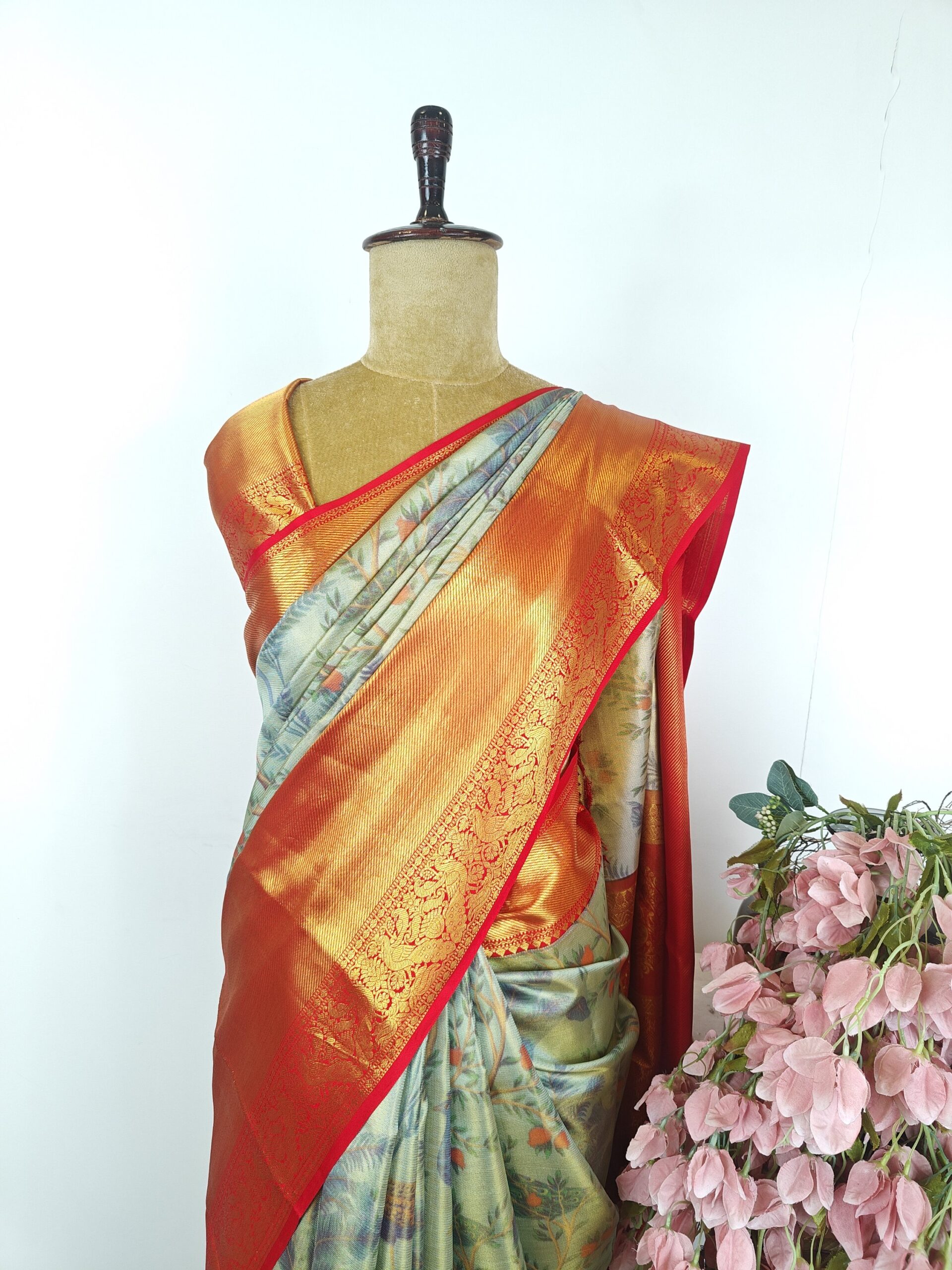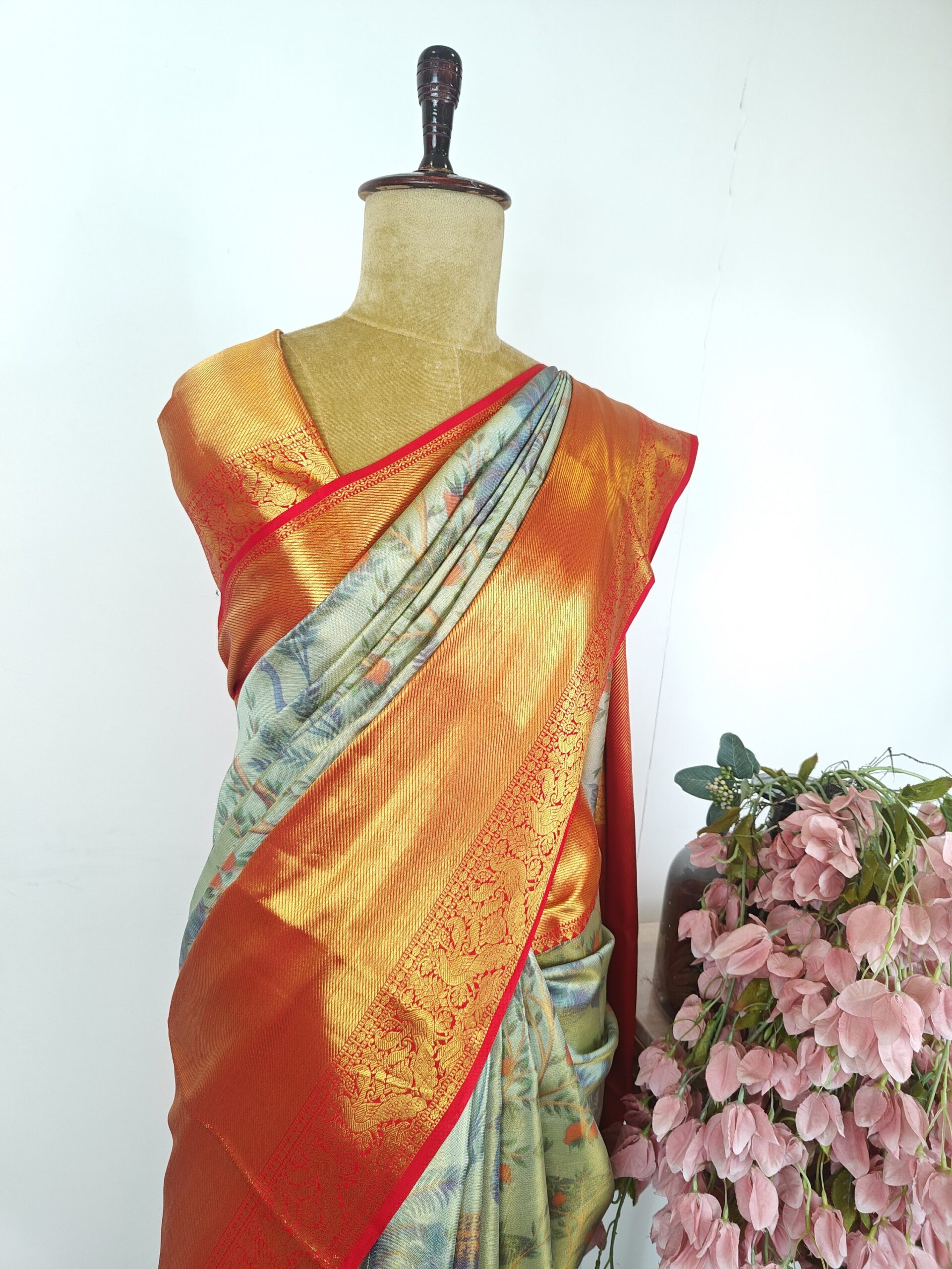 Green colour kanchi saree with peacocks and trees motifs all over the saree and red colour border