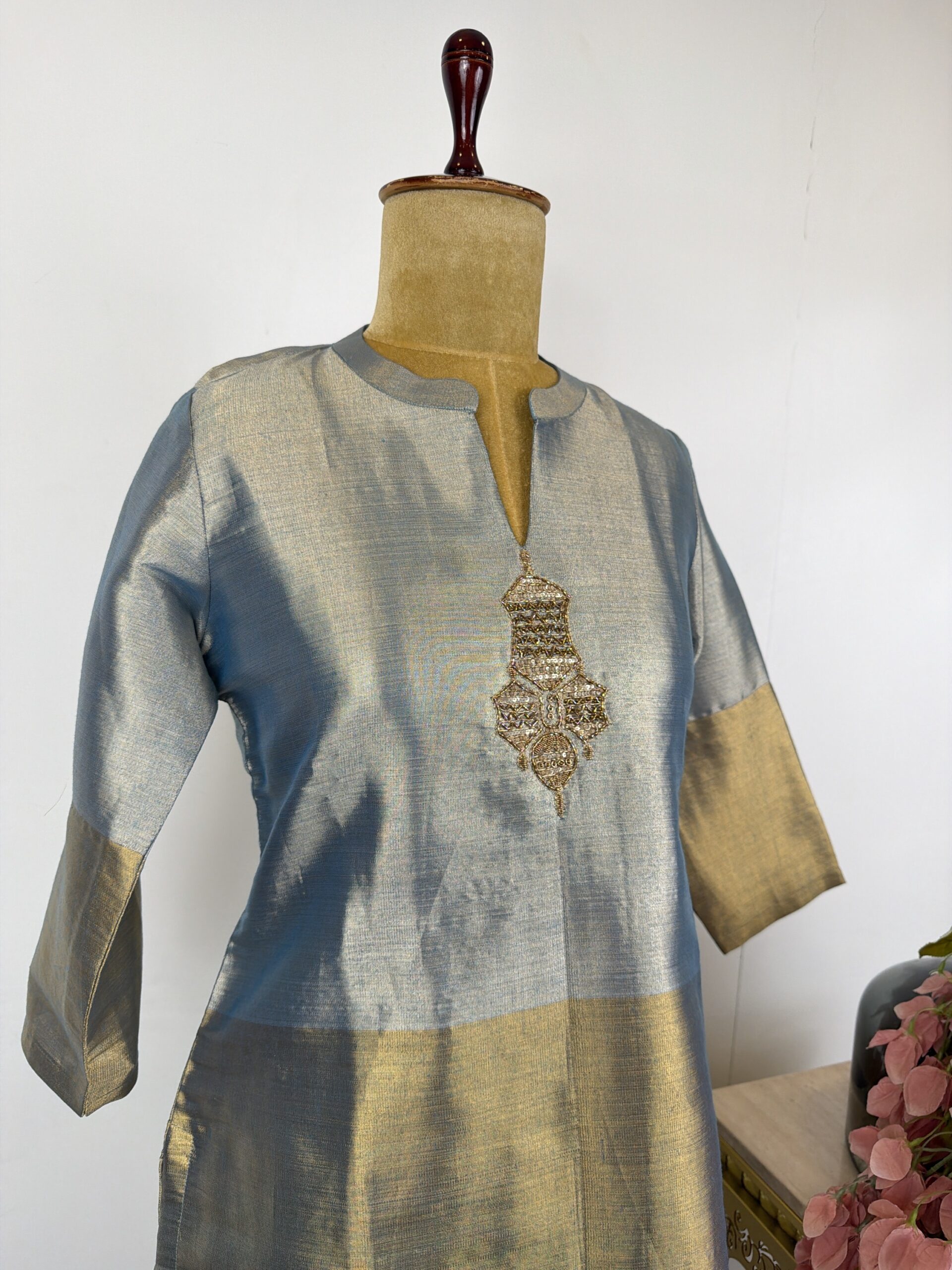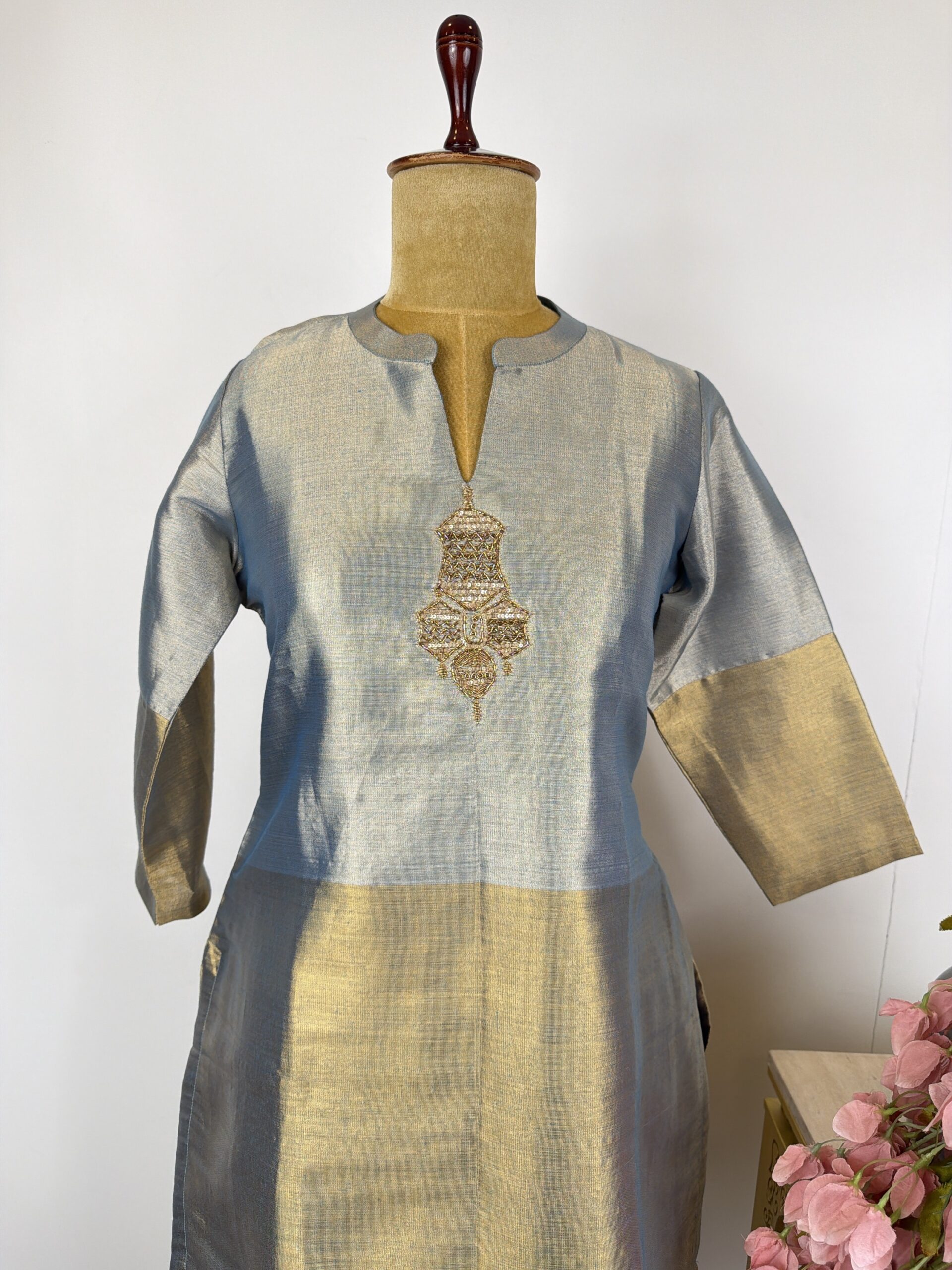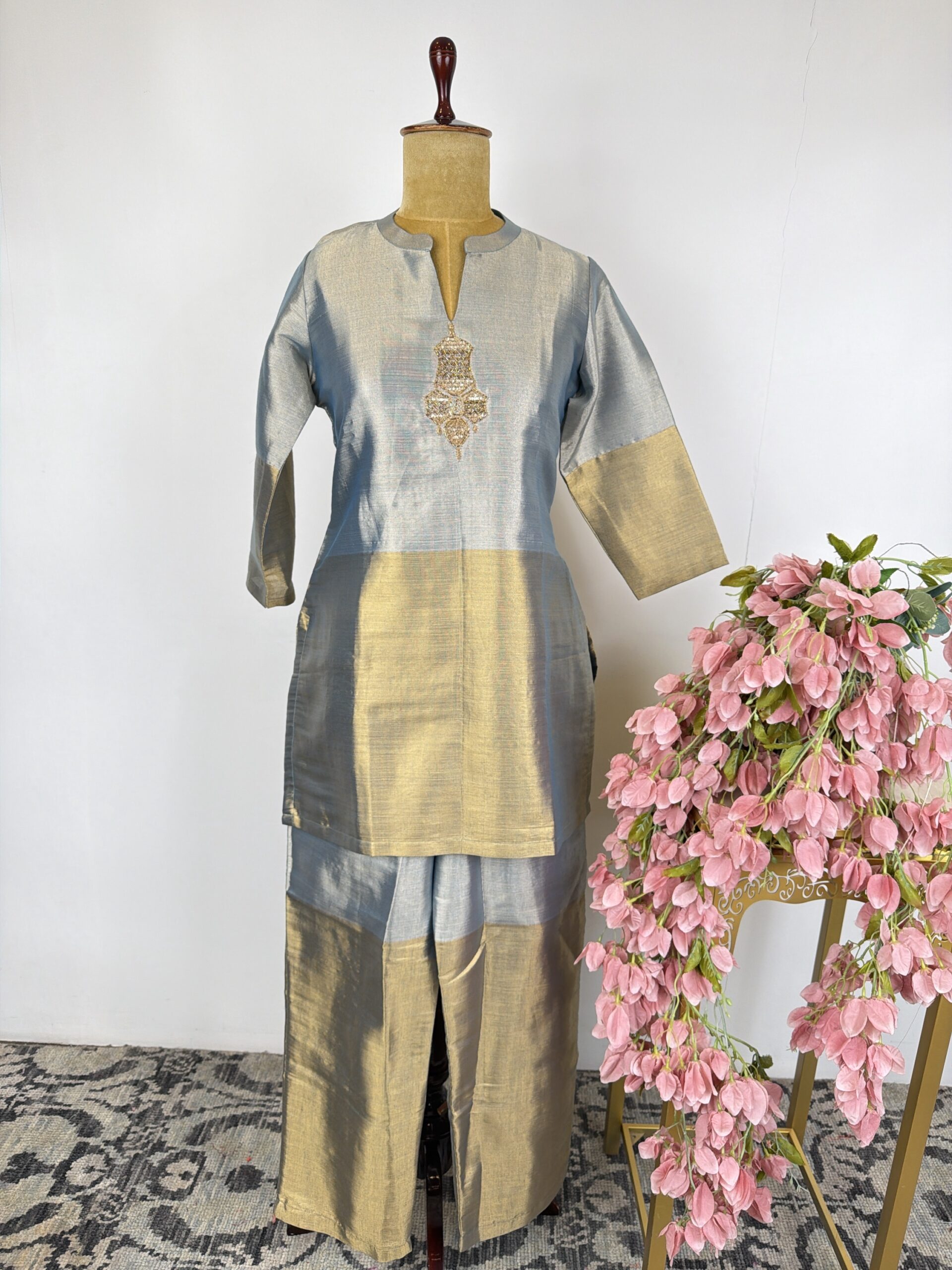 Grey and gold tissue suit with embroidered motifs at neck detailed with cut dana, sequins and zardosi