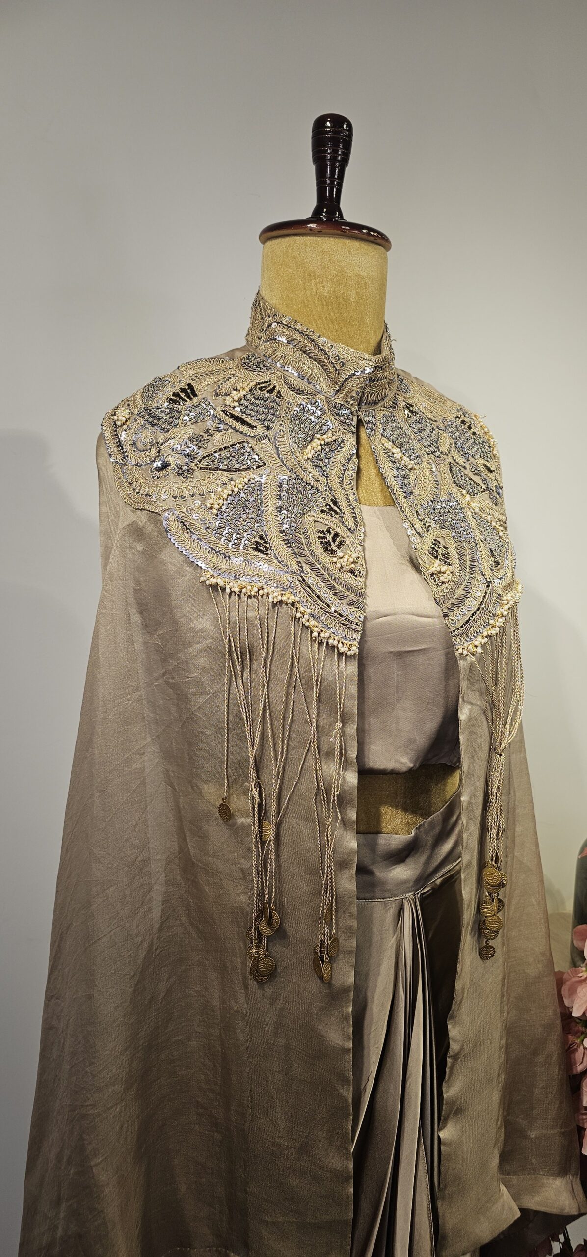 Grey colour drape skirt and it comes buster and cape with beautiful hand done dori and sequence work