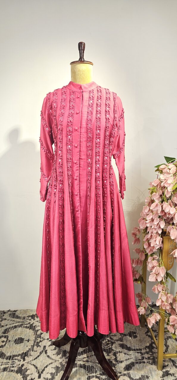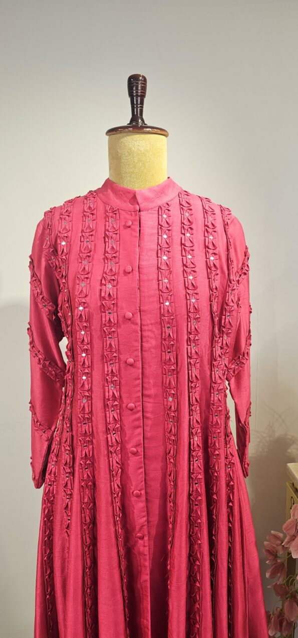 Hot pink colour kurthi with beautiful pintucks design and highlighted with pearls and it comes with straight pant