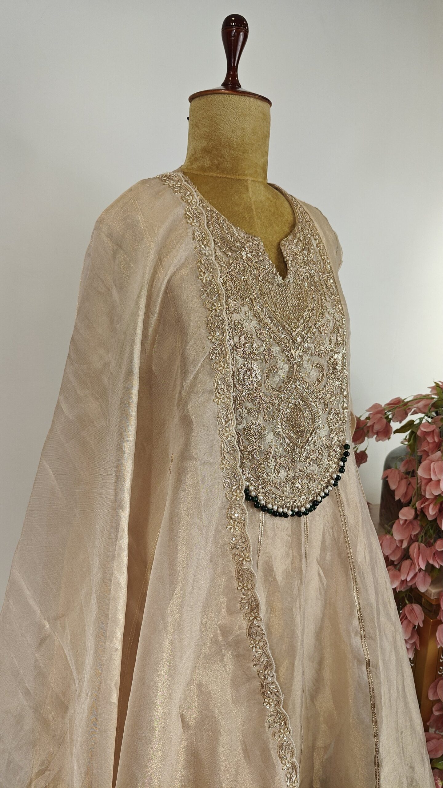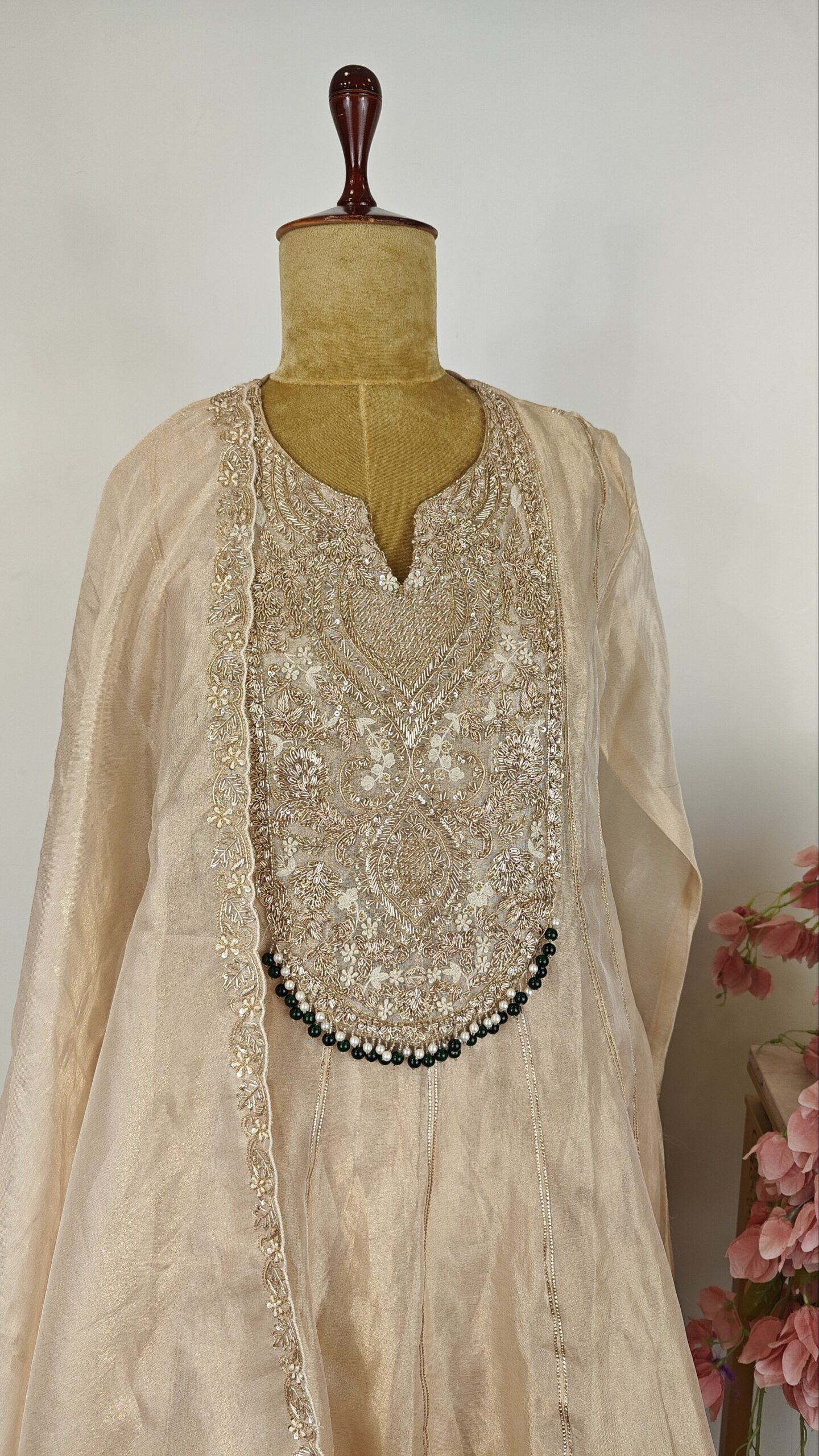 Ivory color tissue kurthi set with top and straight pant and comes with duppata and top has beautiful hand done sequence and zardosi work