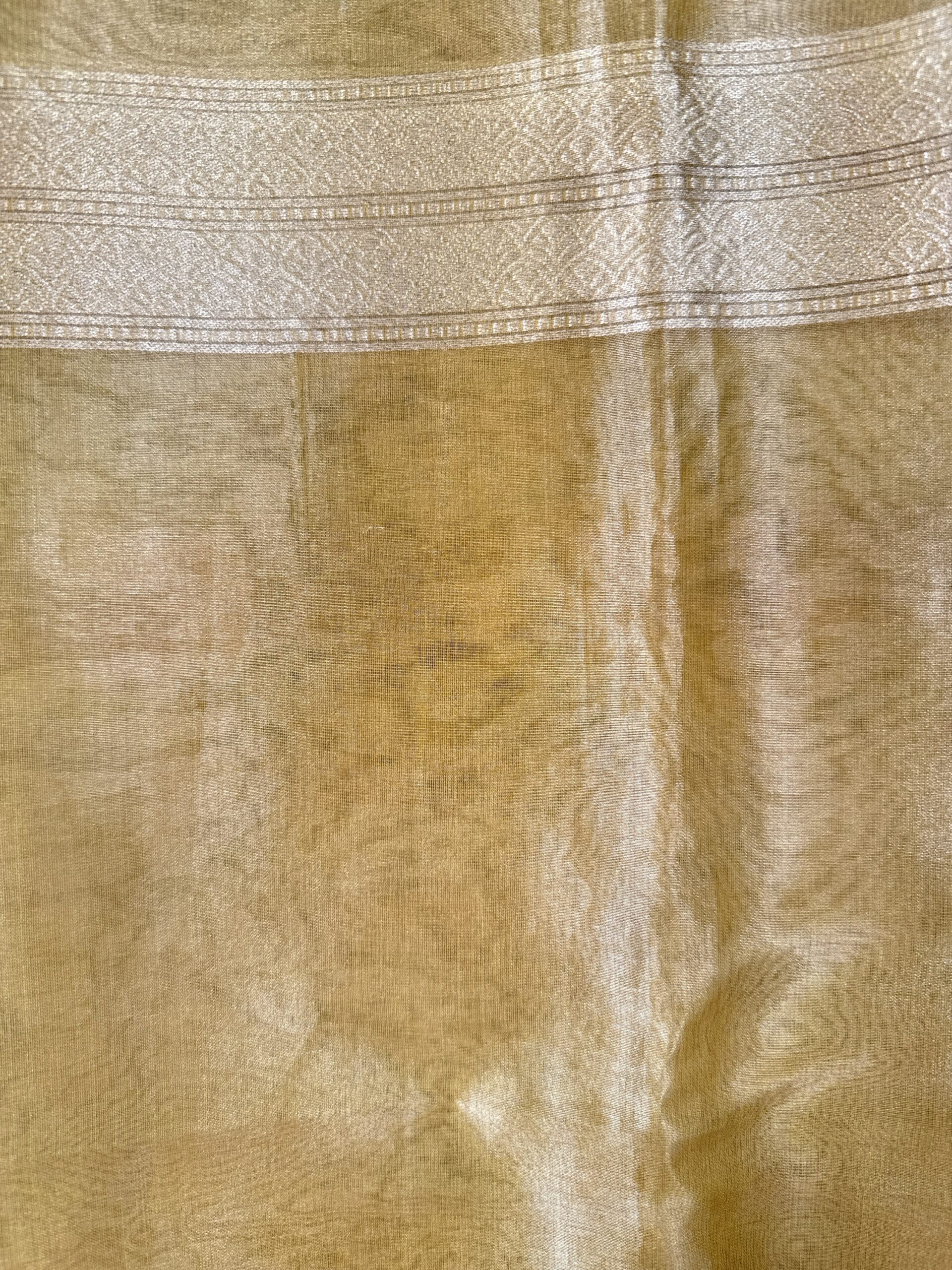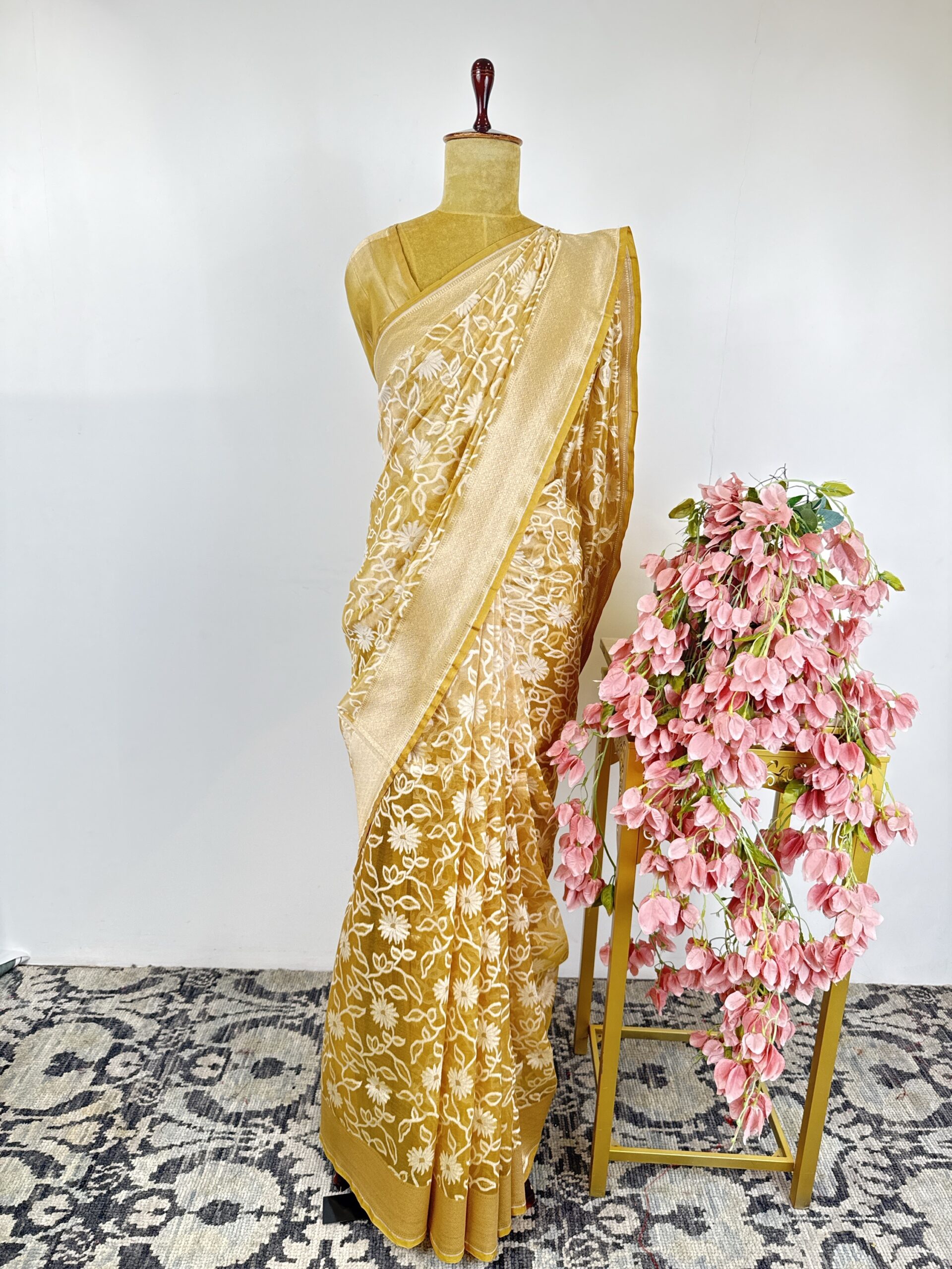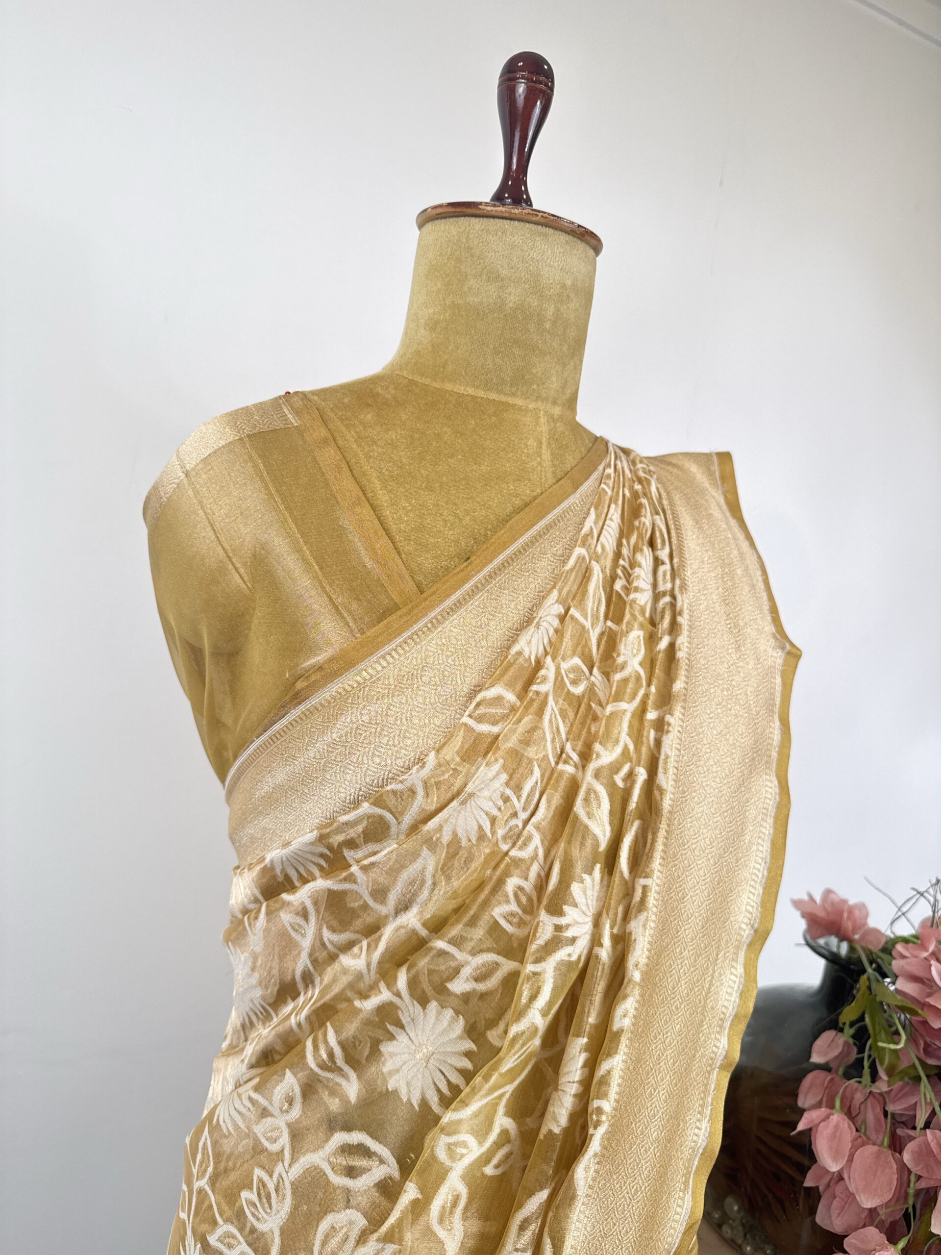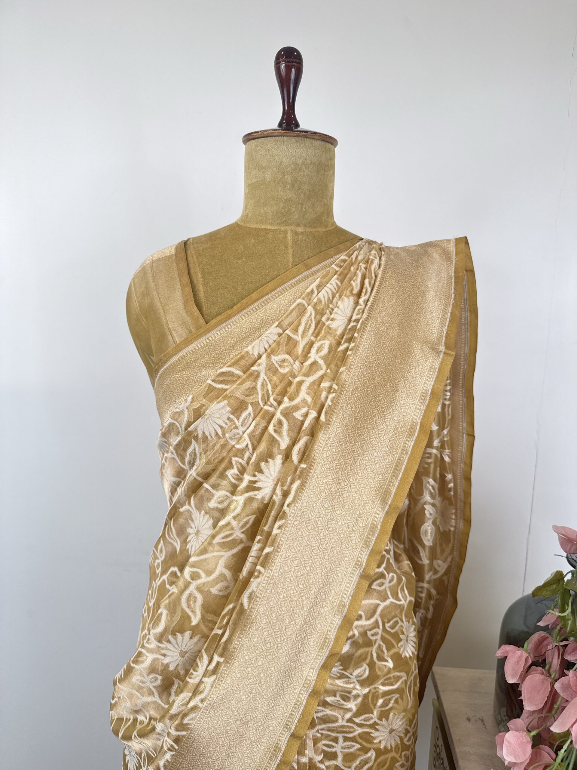 Light mehendi green colour Kora Banaras saree with floral motifs all over jaal