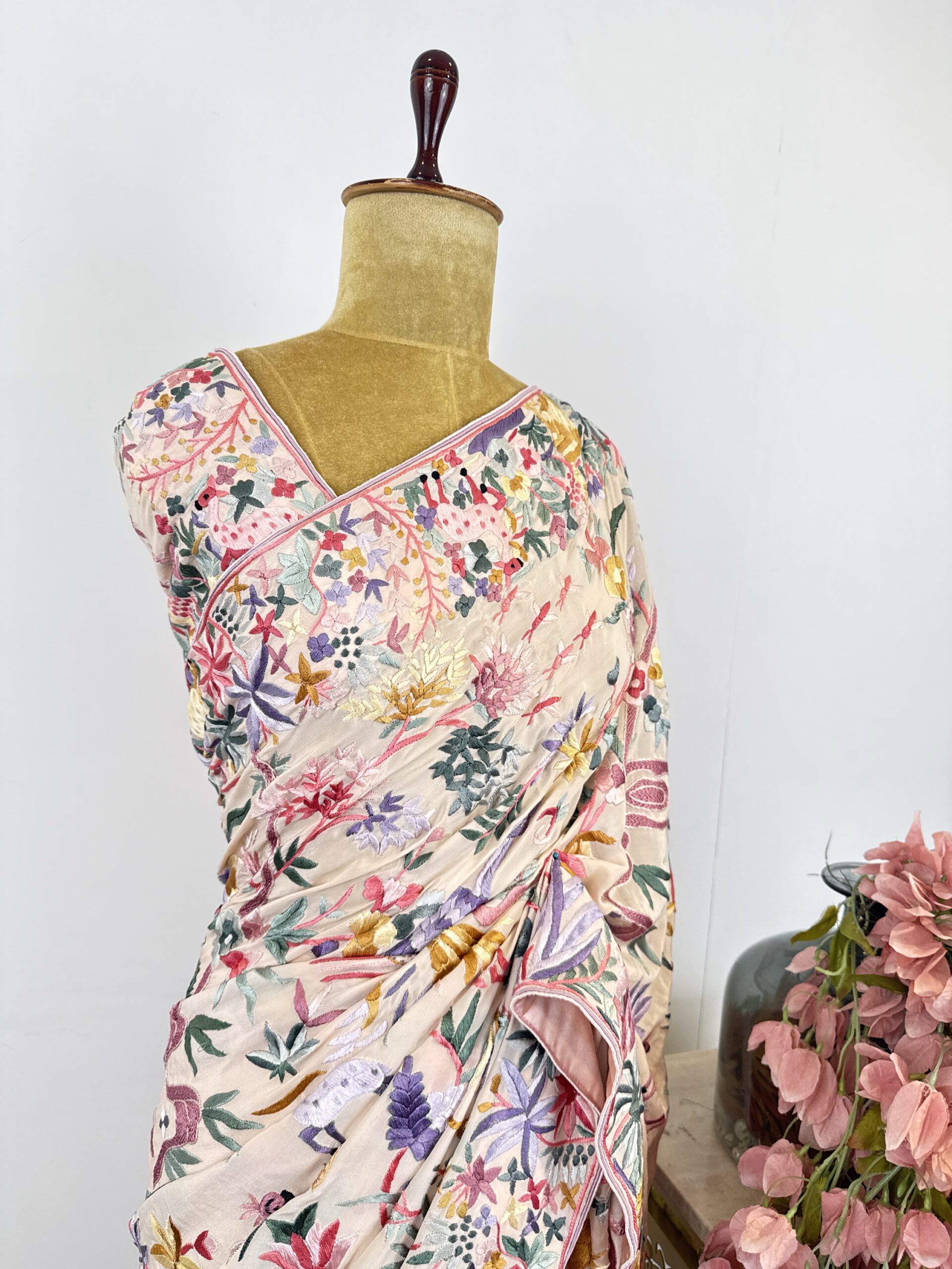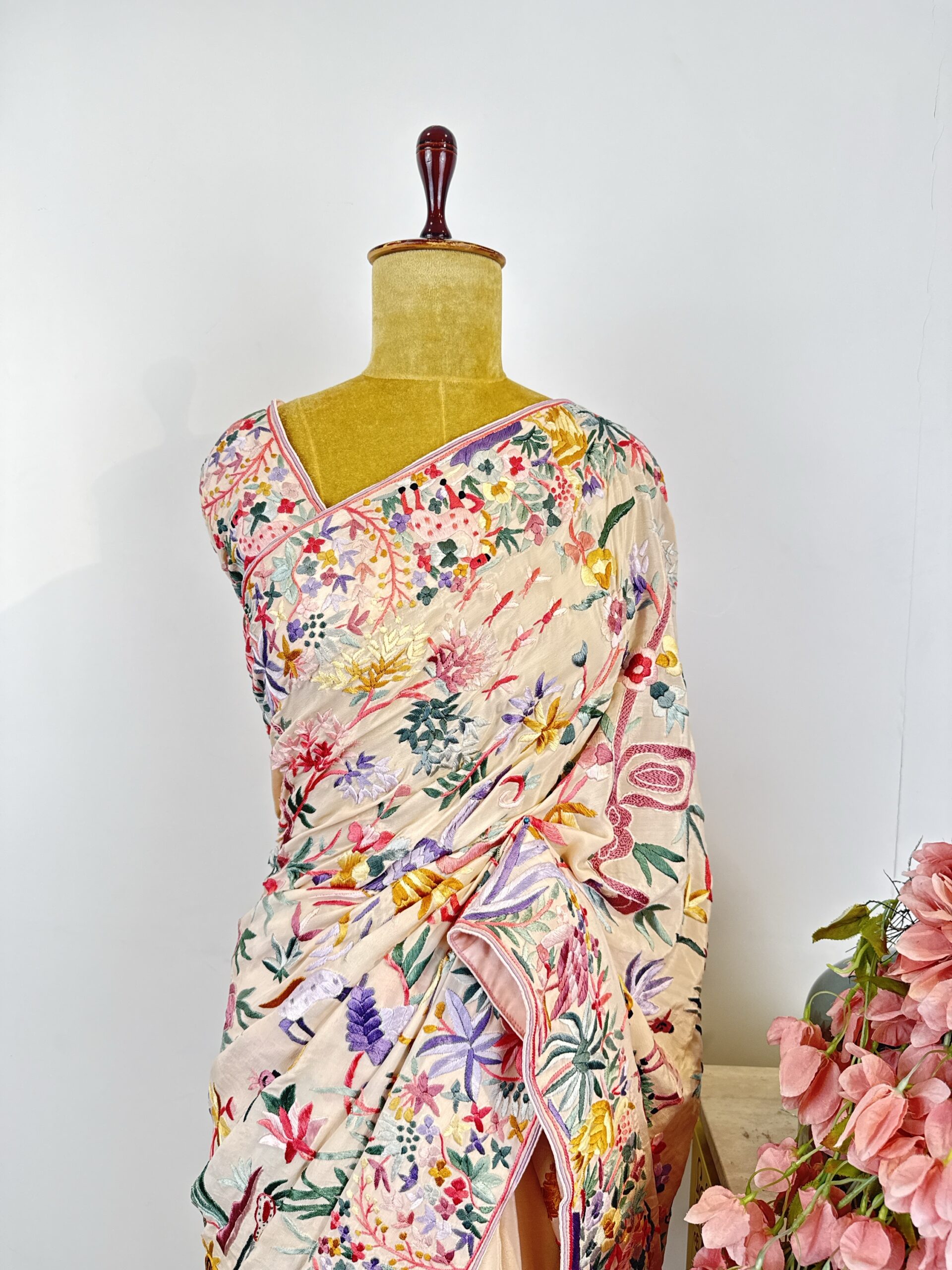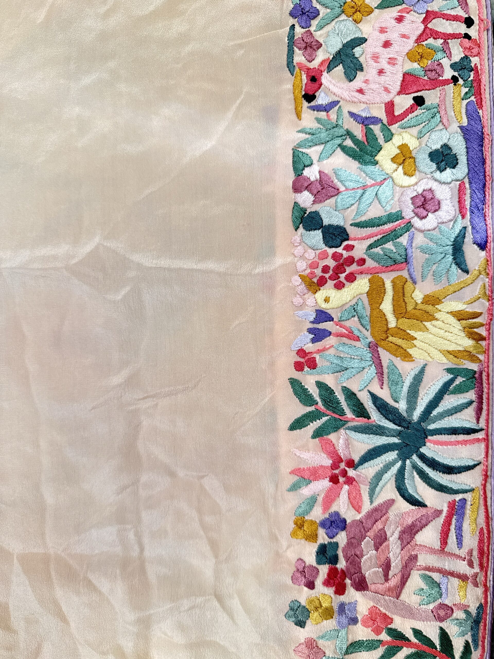 Light peach parsi gara saree with jungle theme detailed with multicoloured thread gara all over the saree