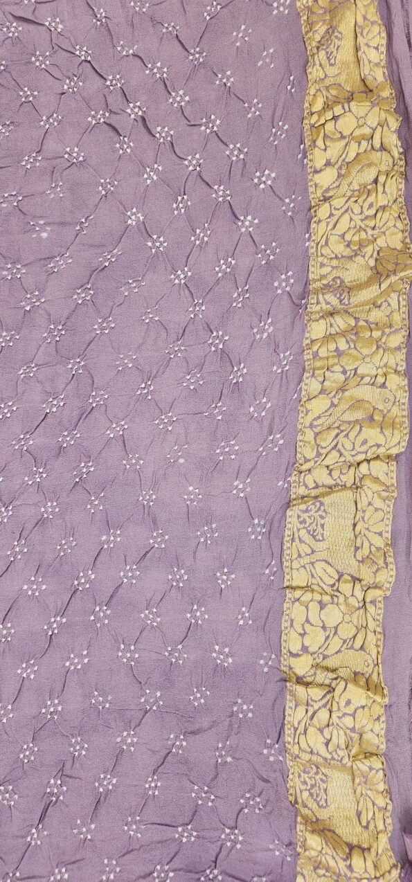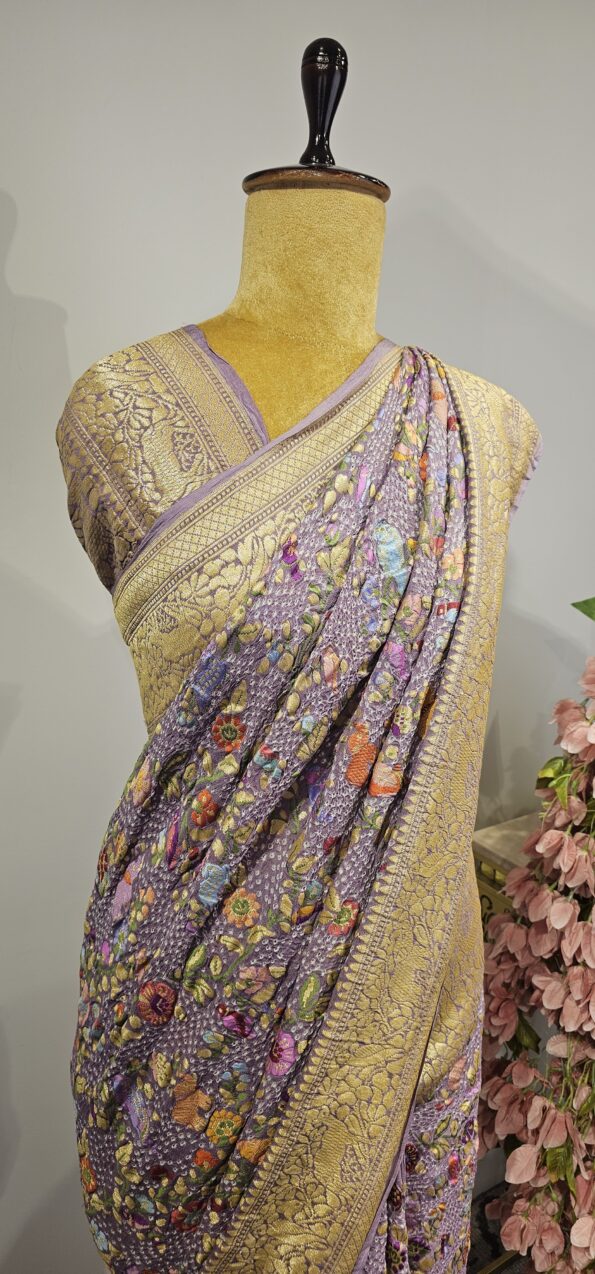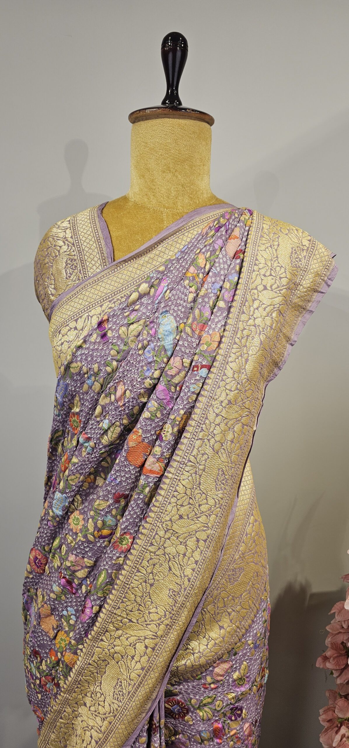 Lilac colour bandhani saree with Shikara concept in meenakari and Zari weave