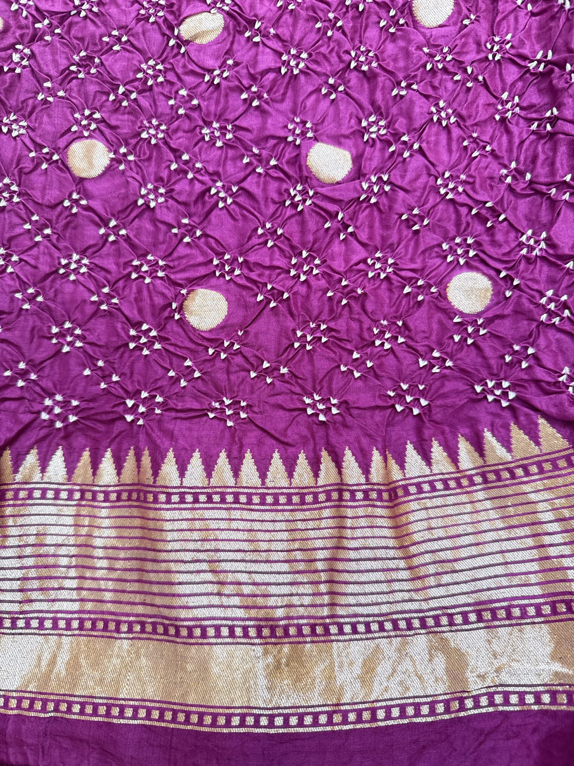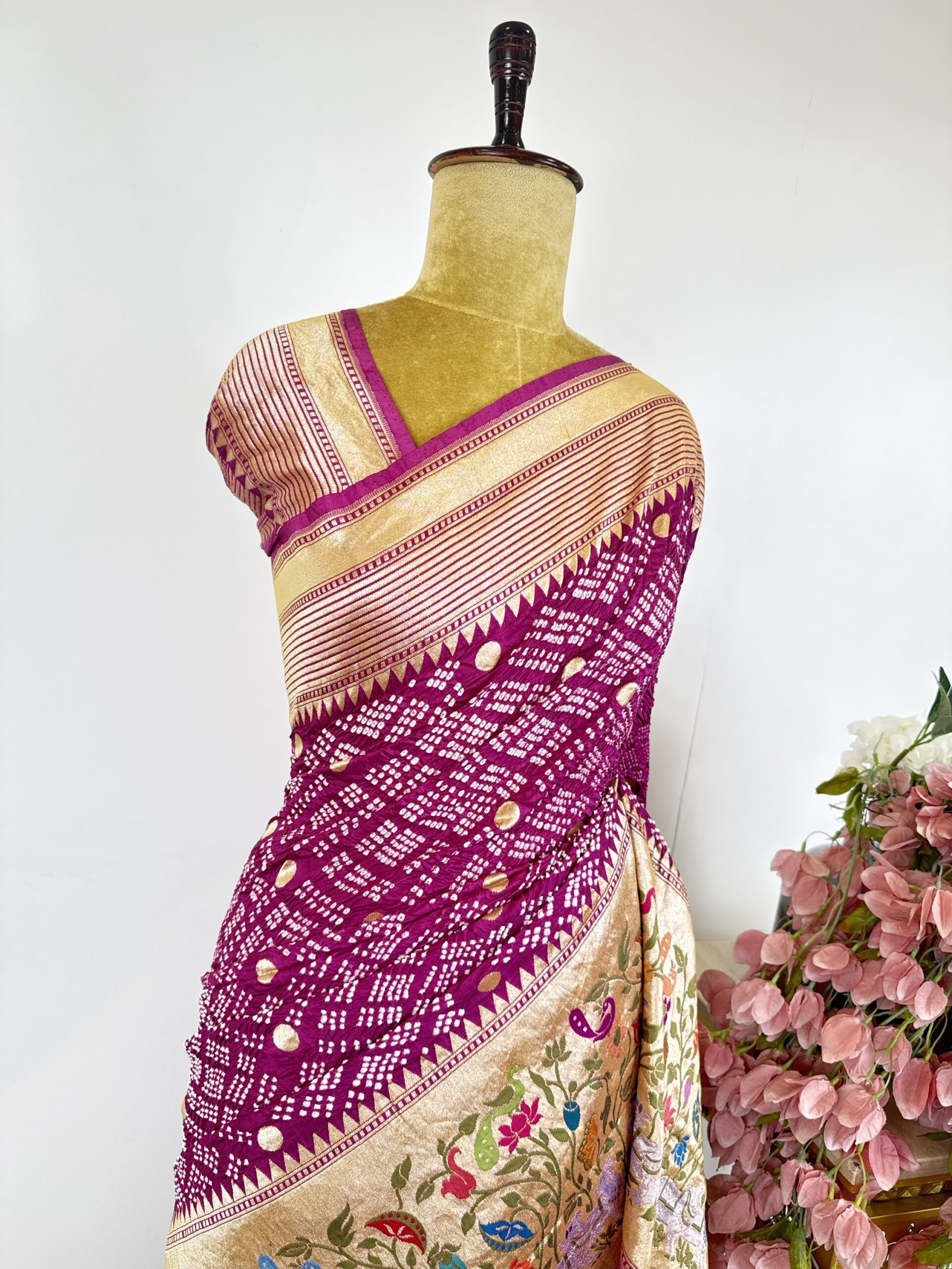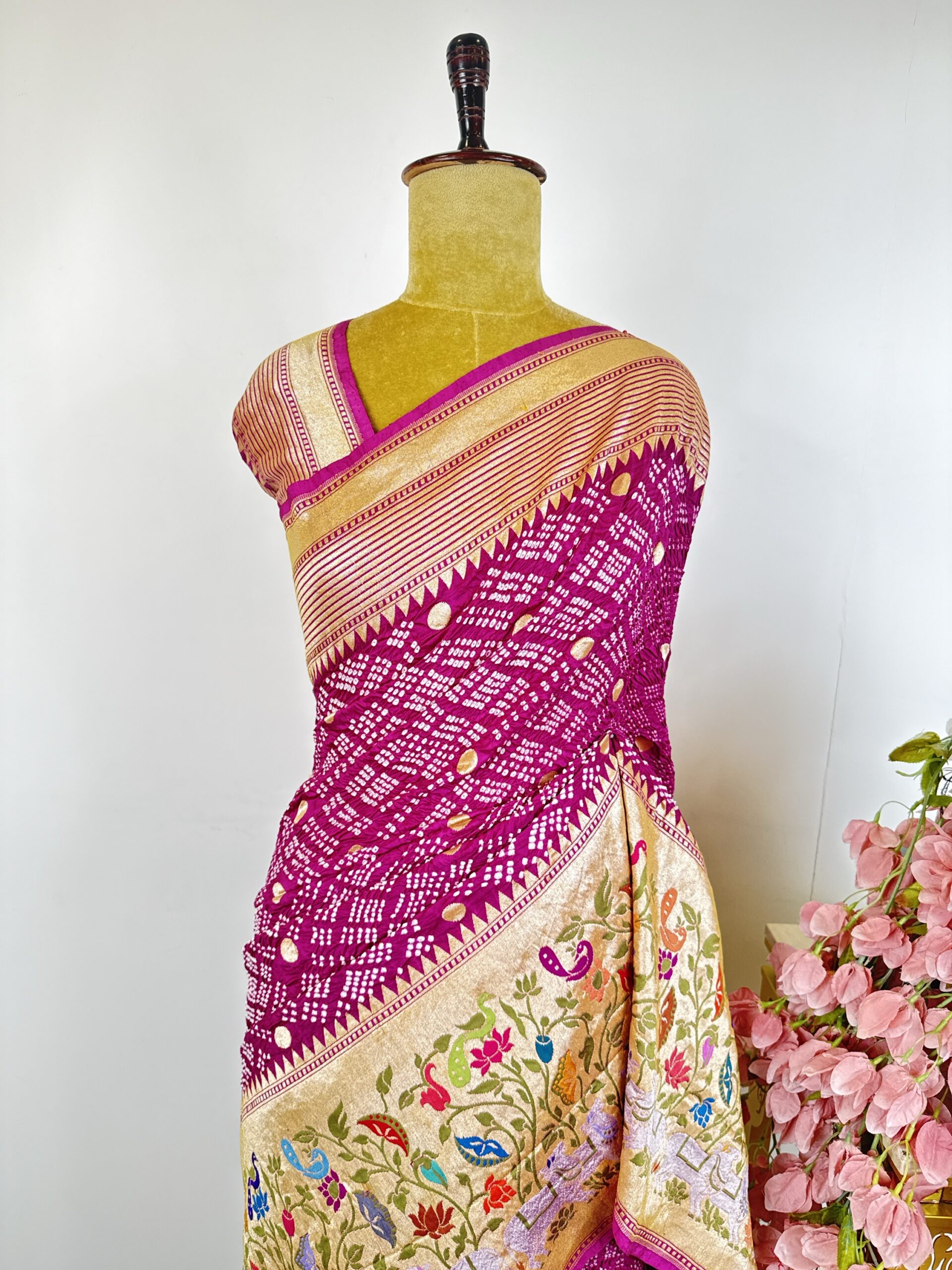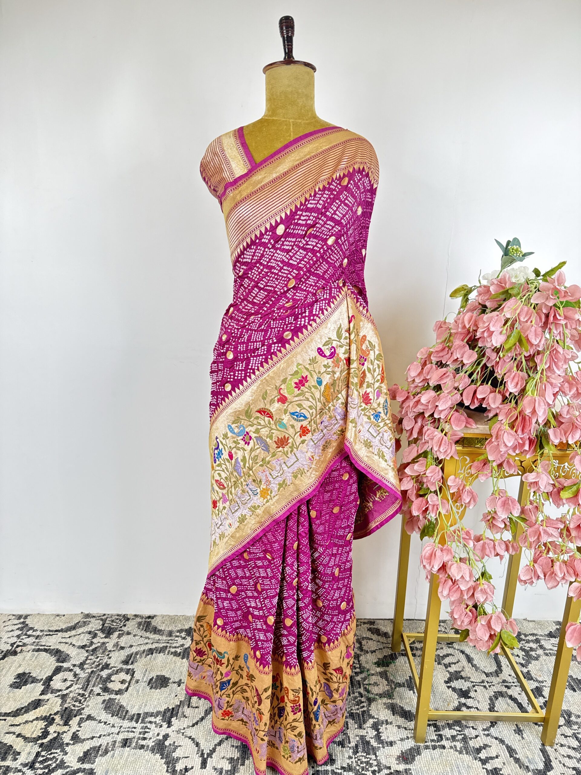 Magenta colour bandhani saree with paithani border concept detailed with meenakari and gold zari on georgette