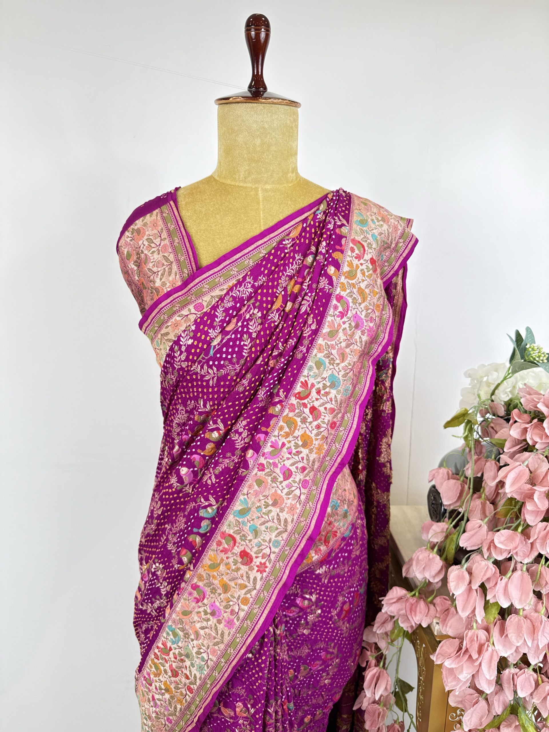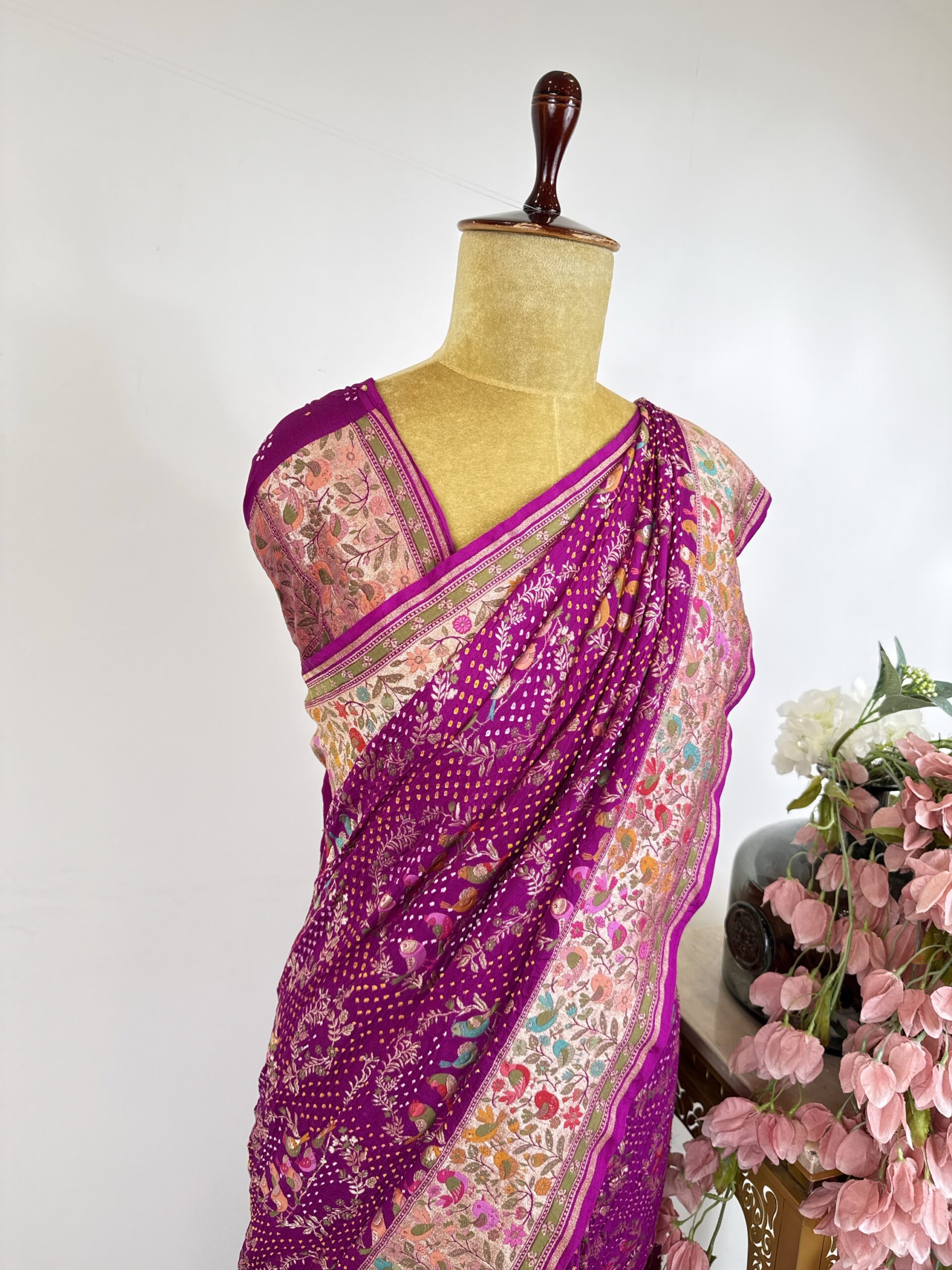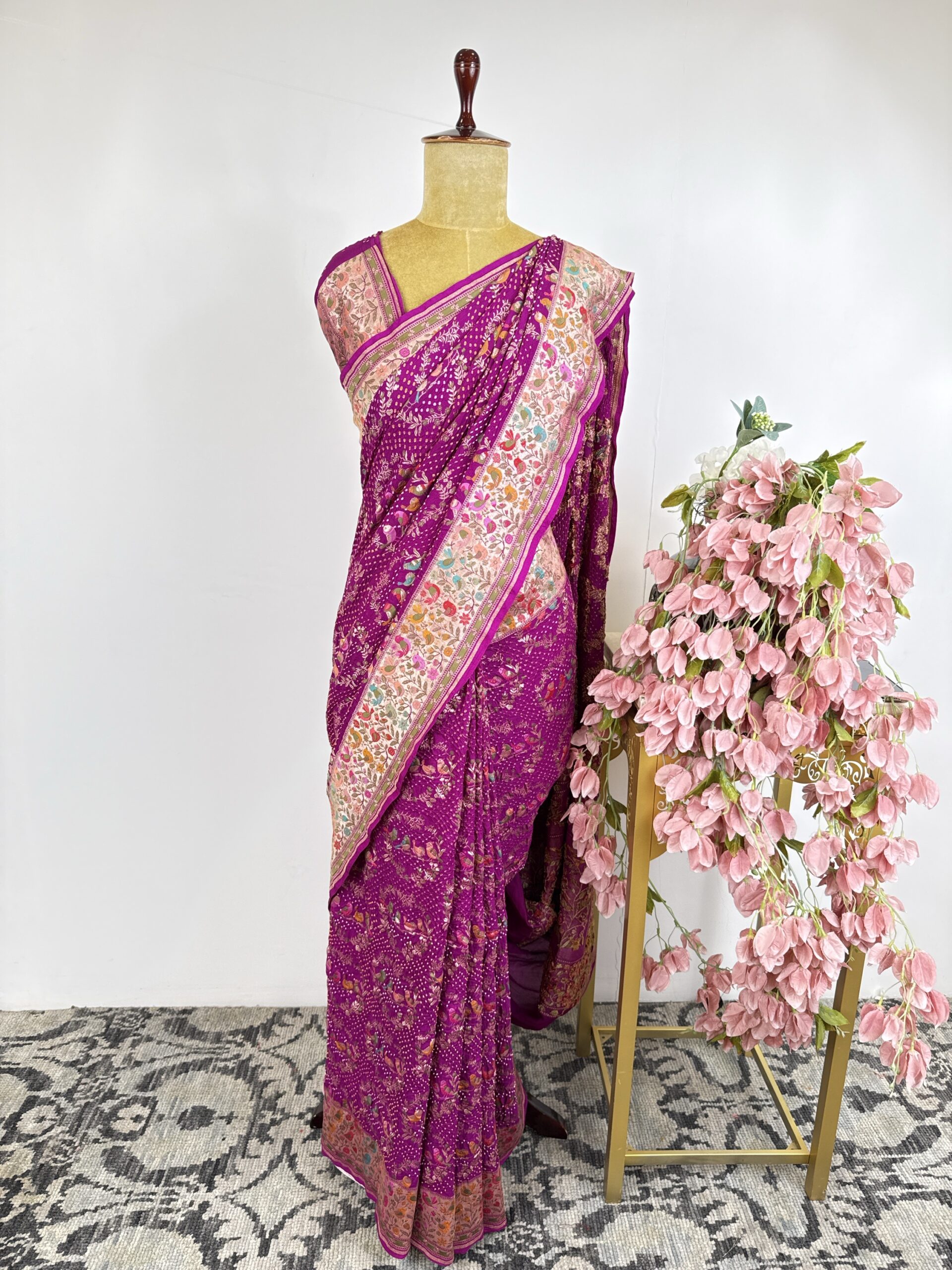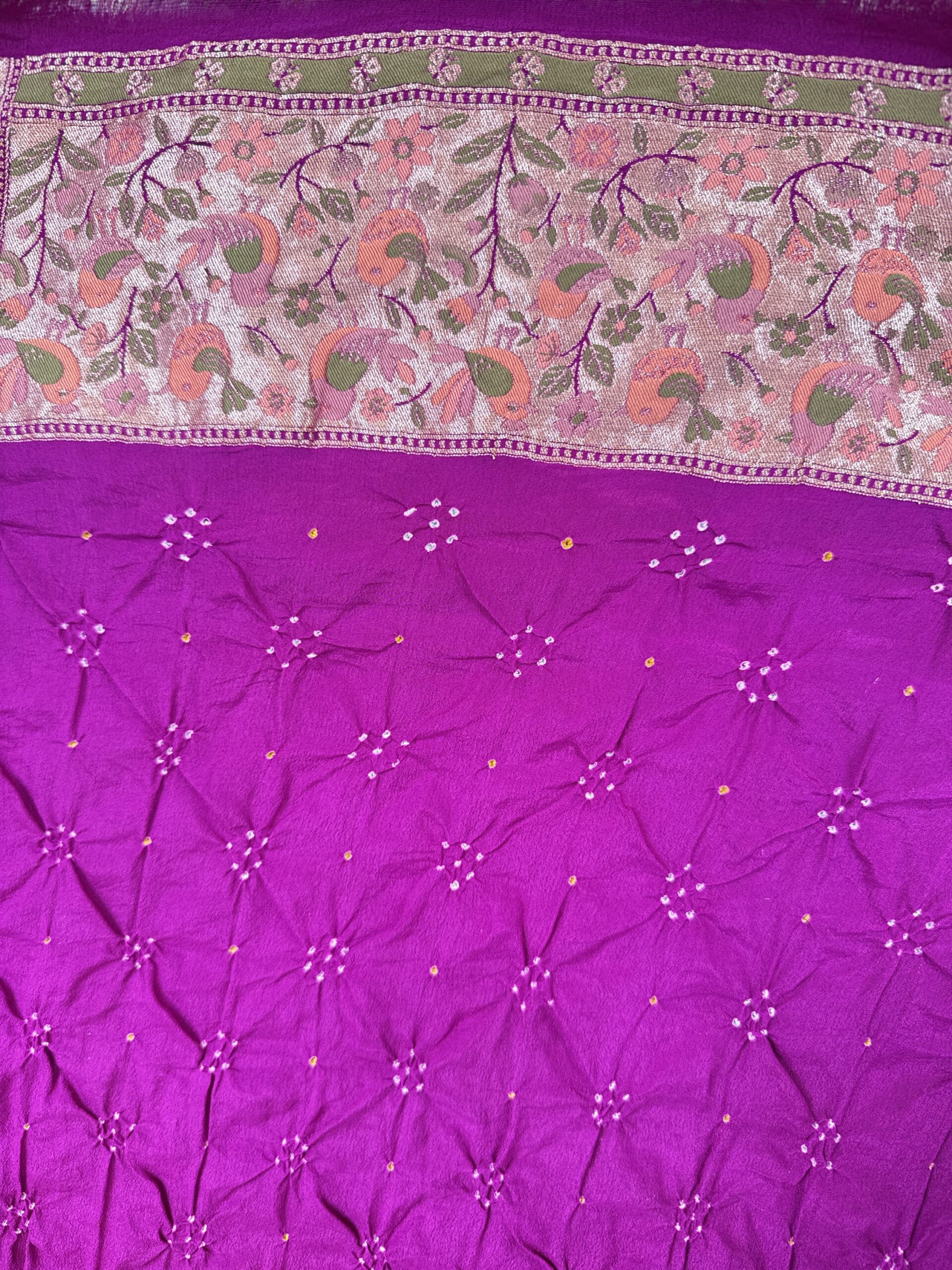 Magenta colour bandhani saree with birds motifs detailed with meenakari and gold zari