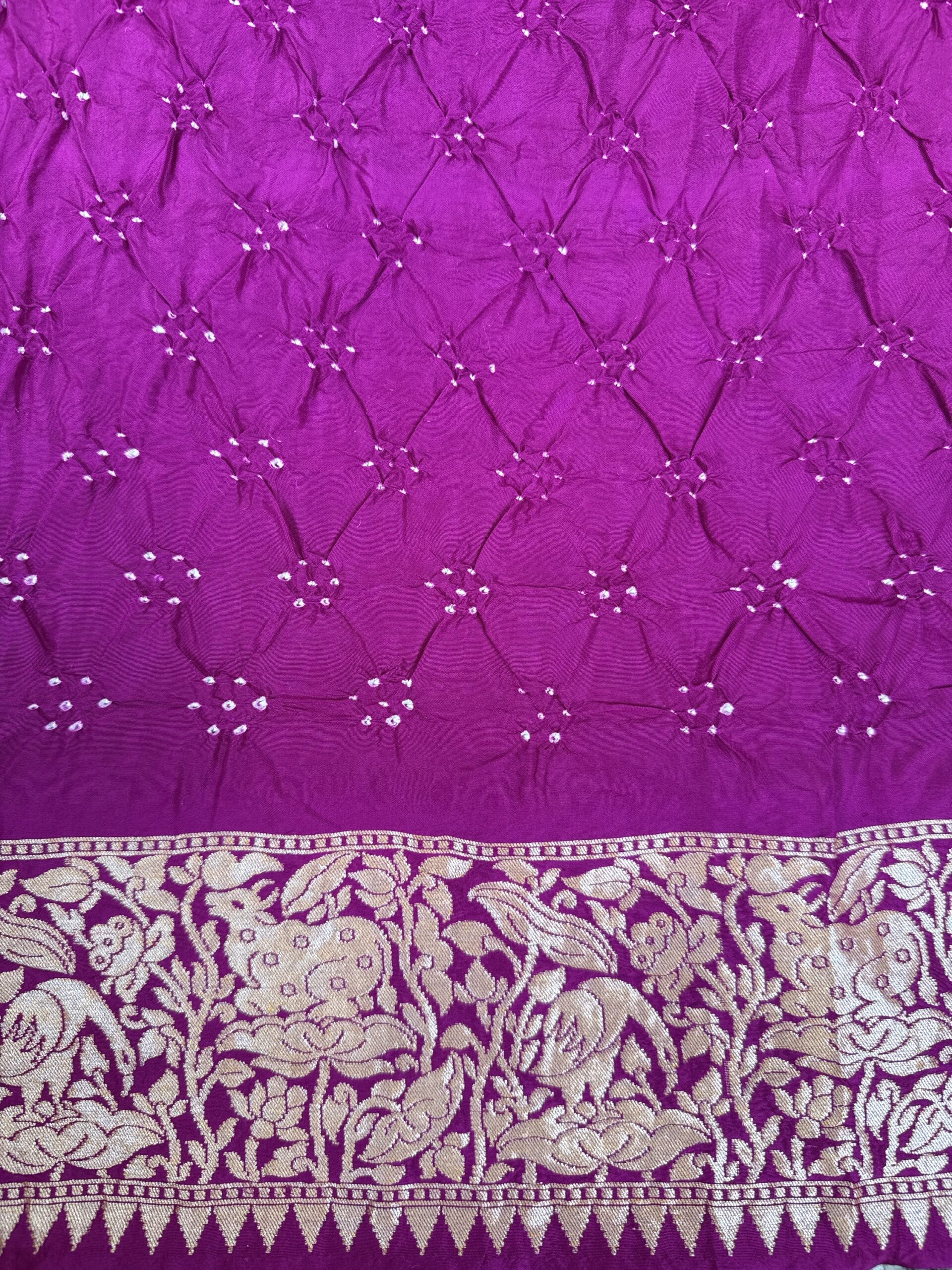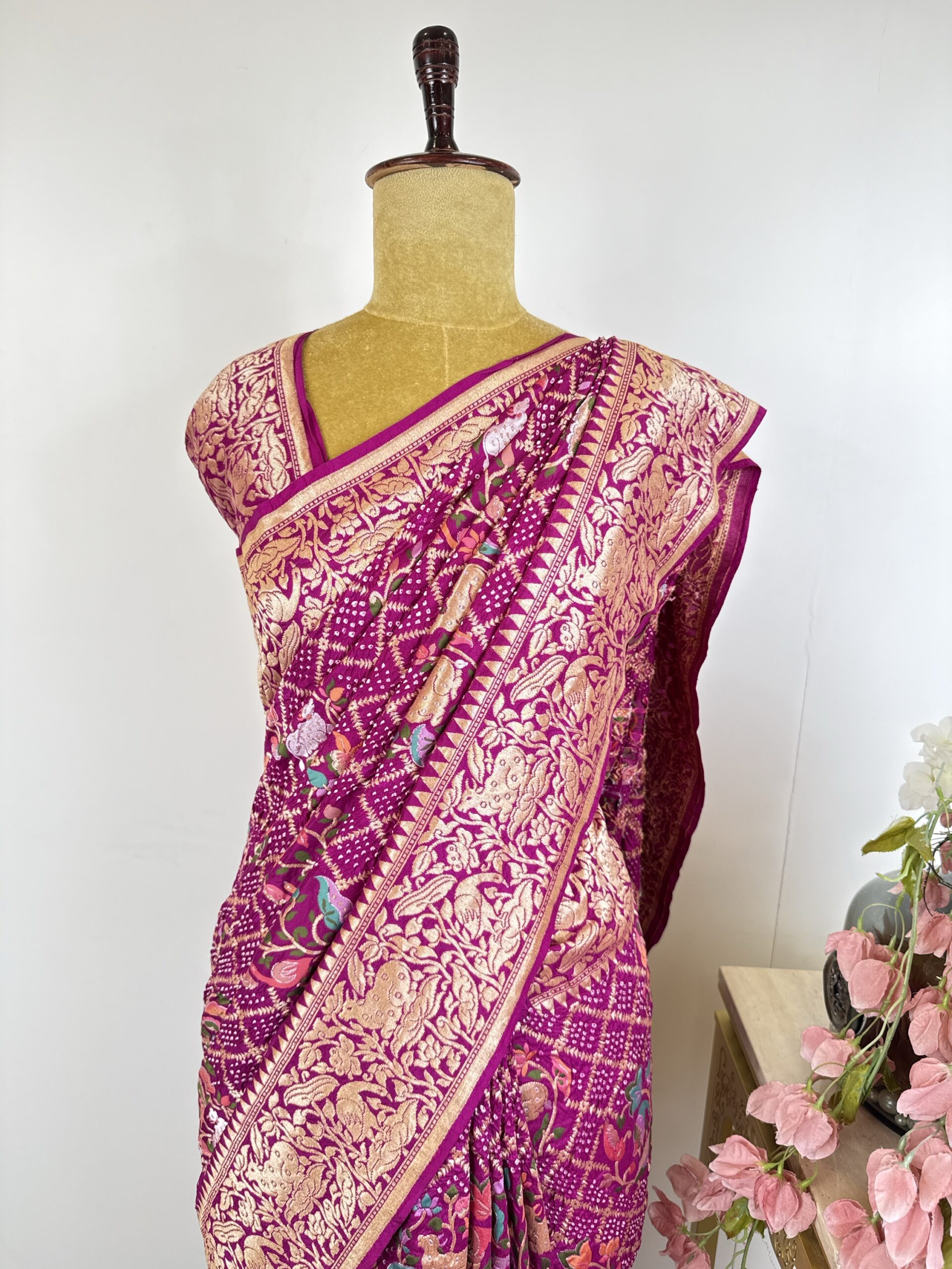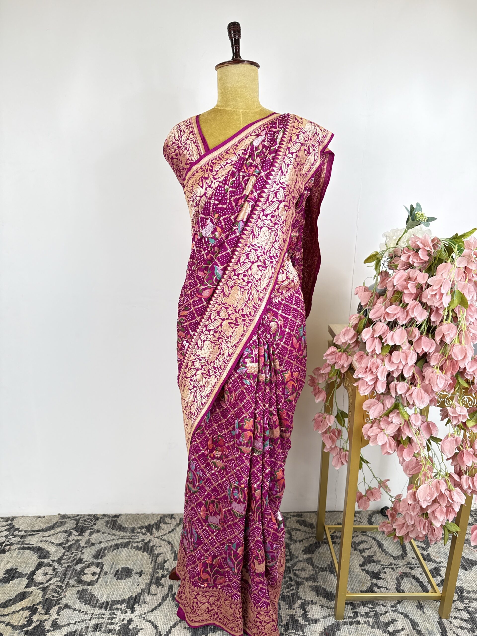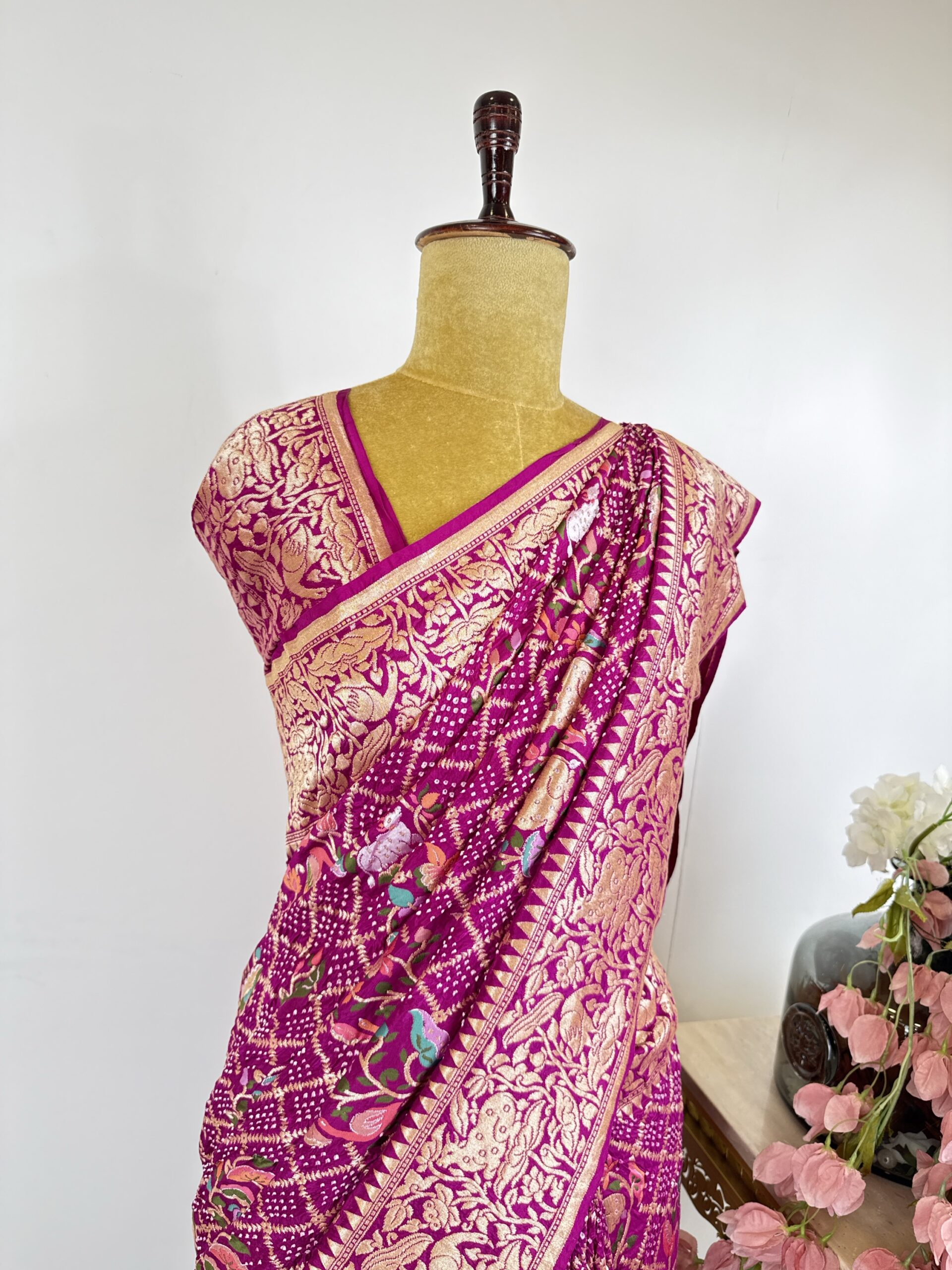 Magenta colour bandhani saree with pichwai concept detailed with meenakari and gold zari