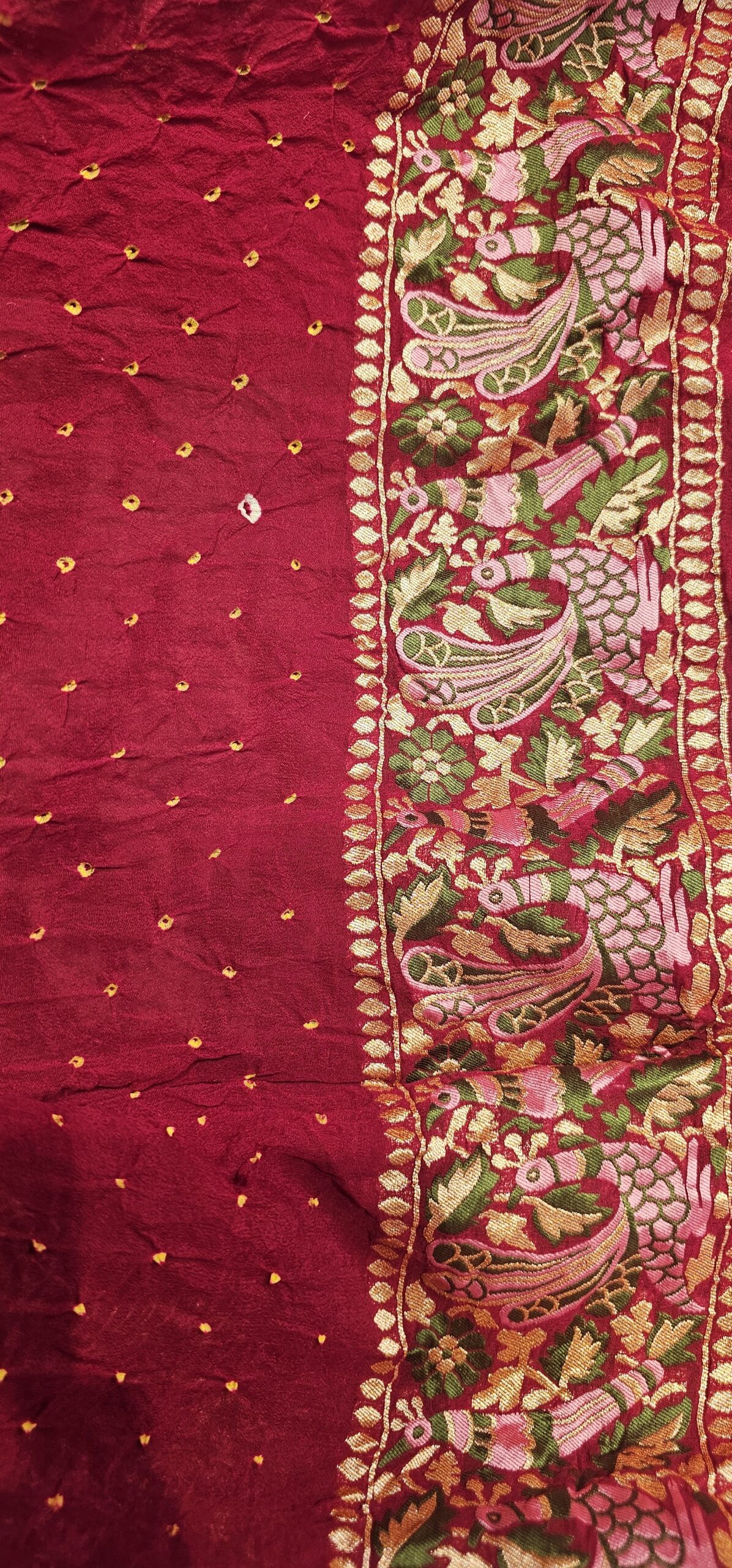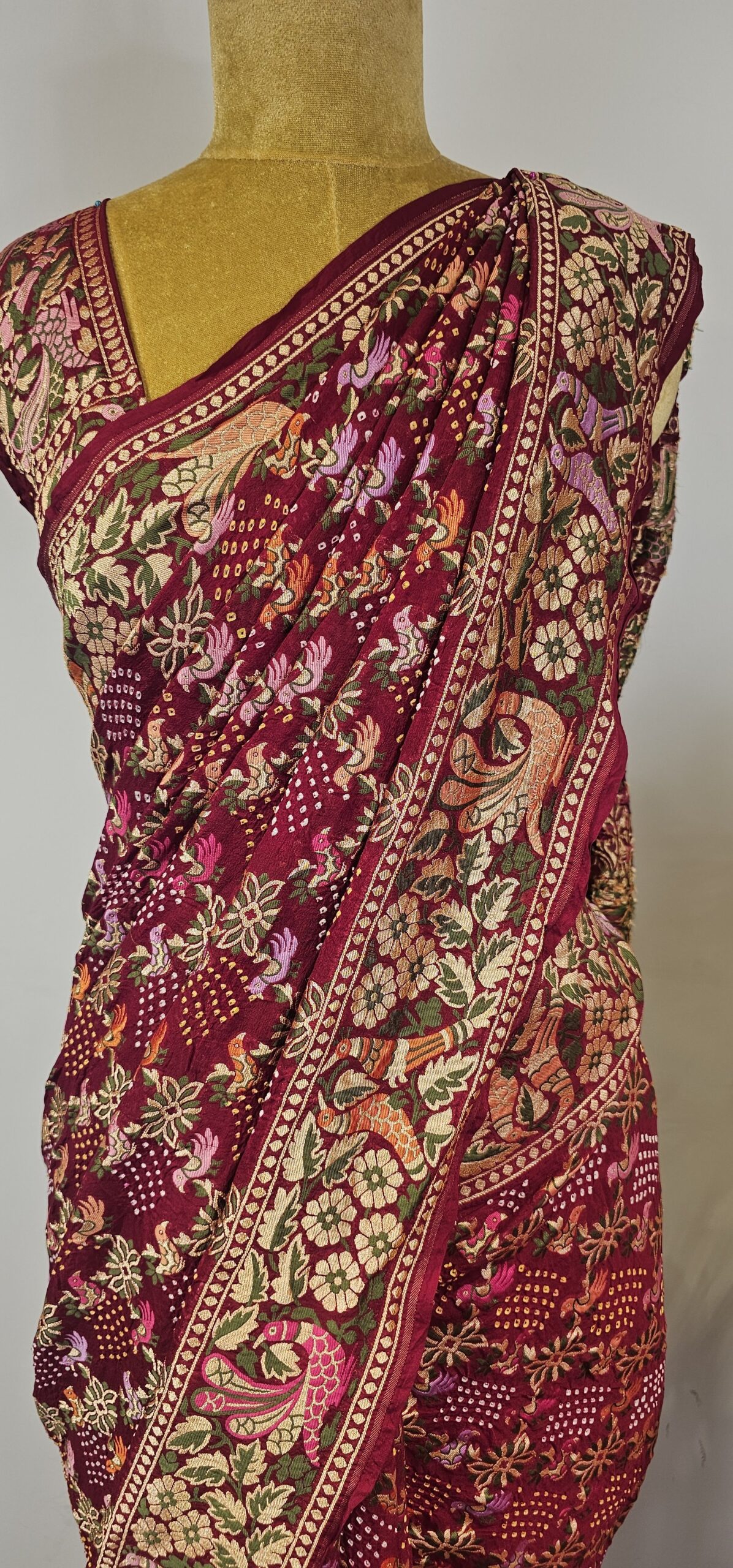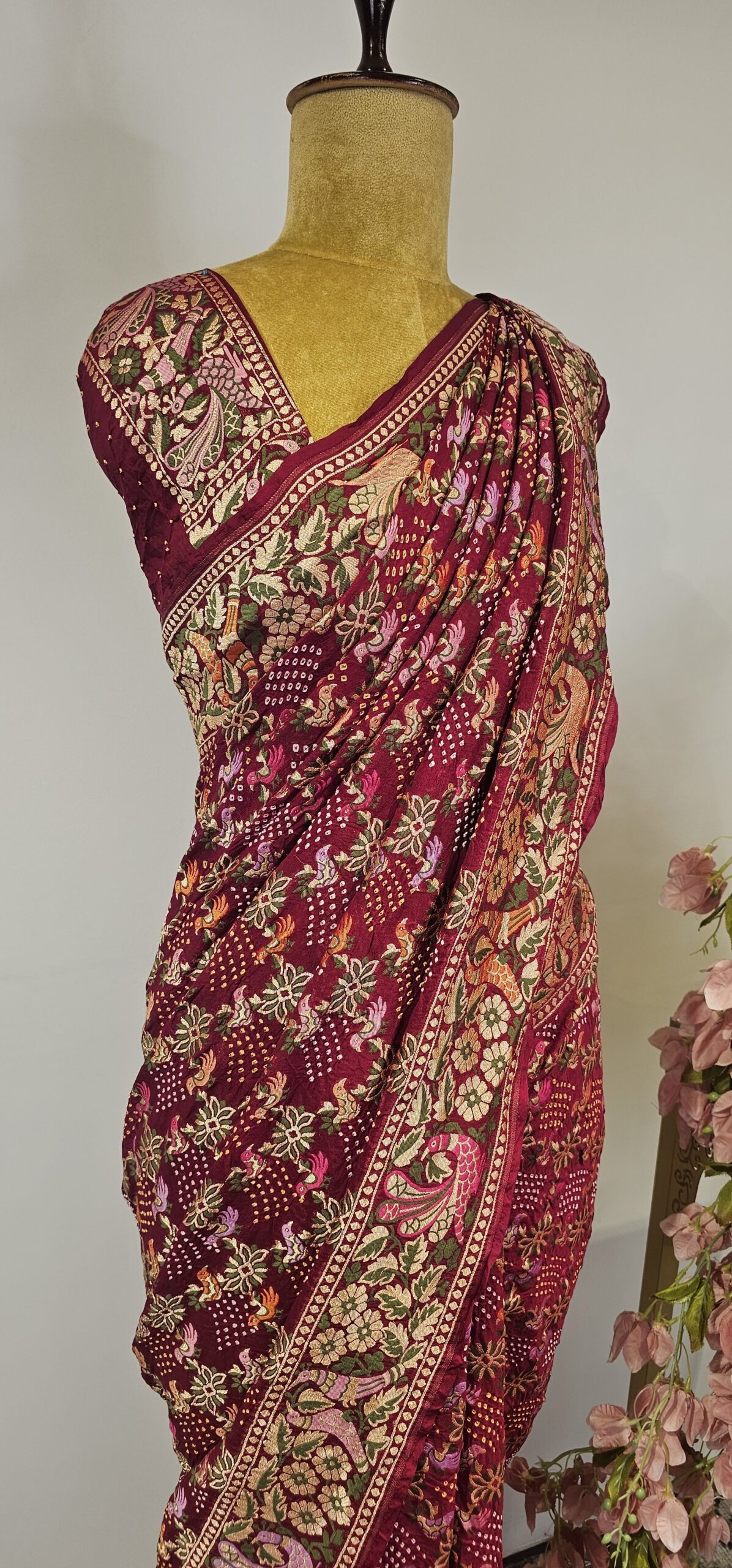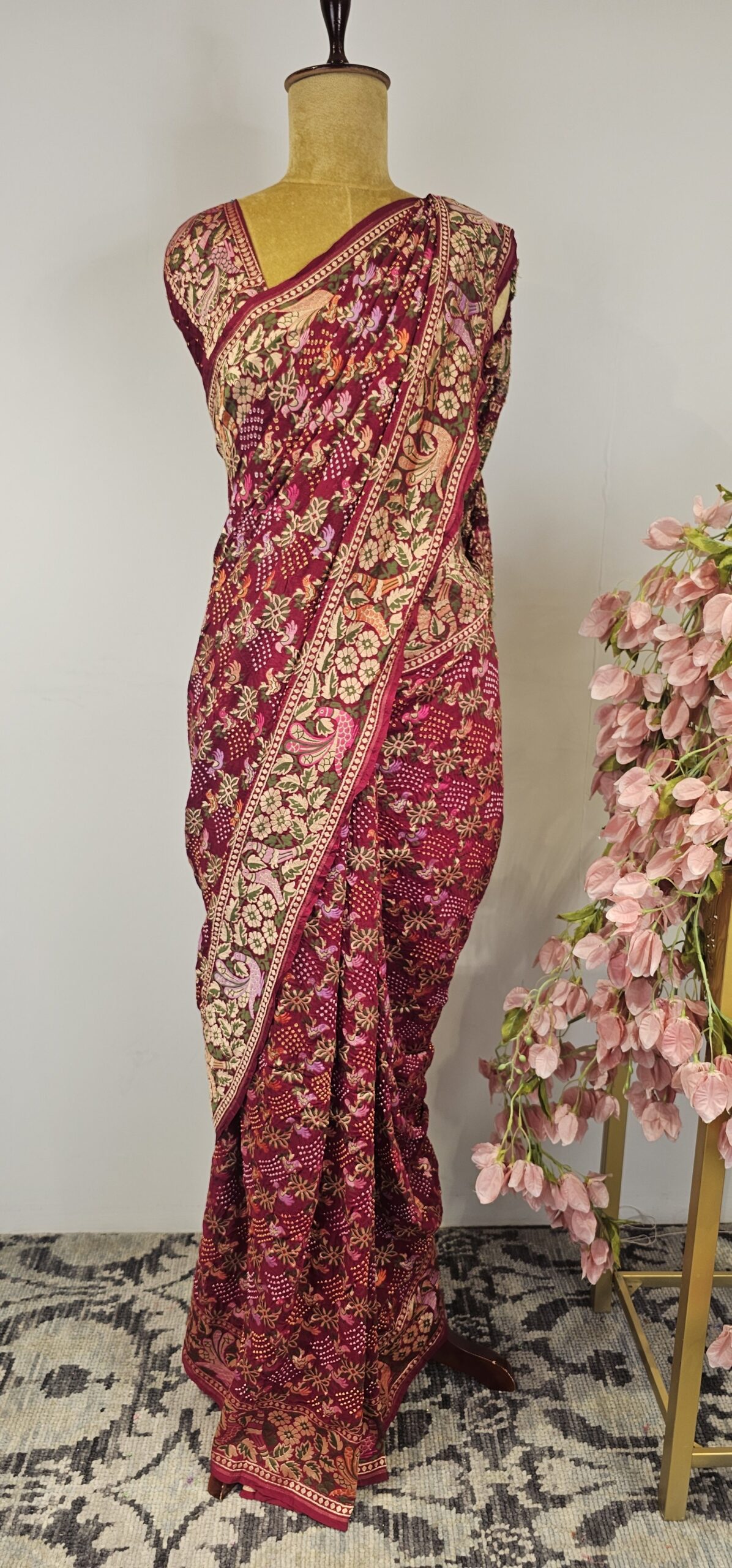 Maroon georgette bandhani saree with all over jal concept with floral and birds motifs
