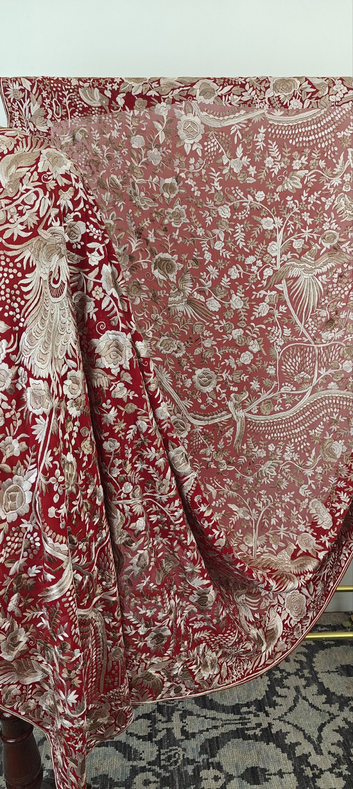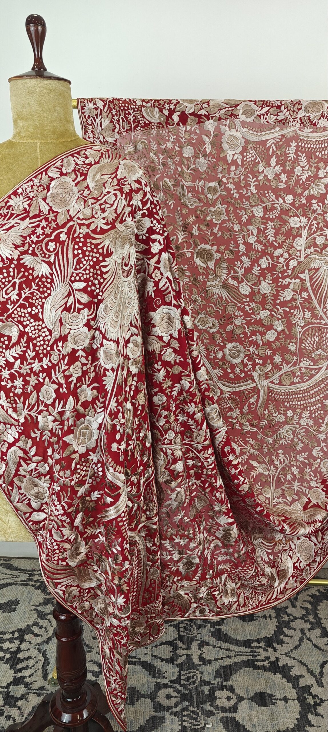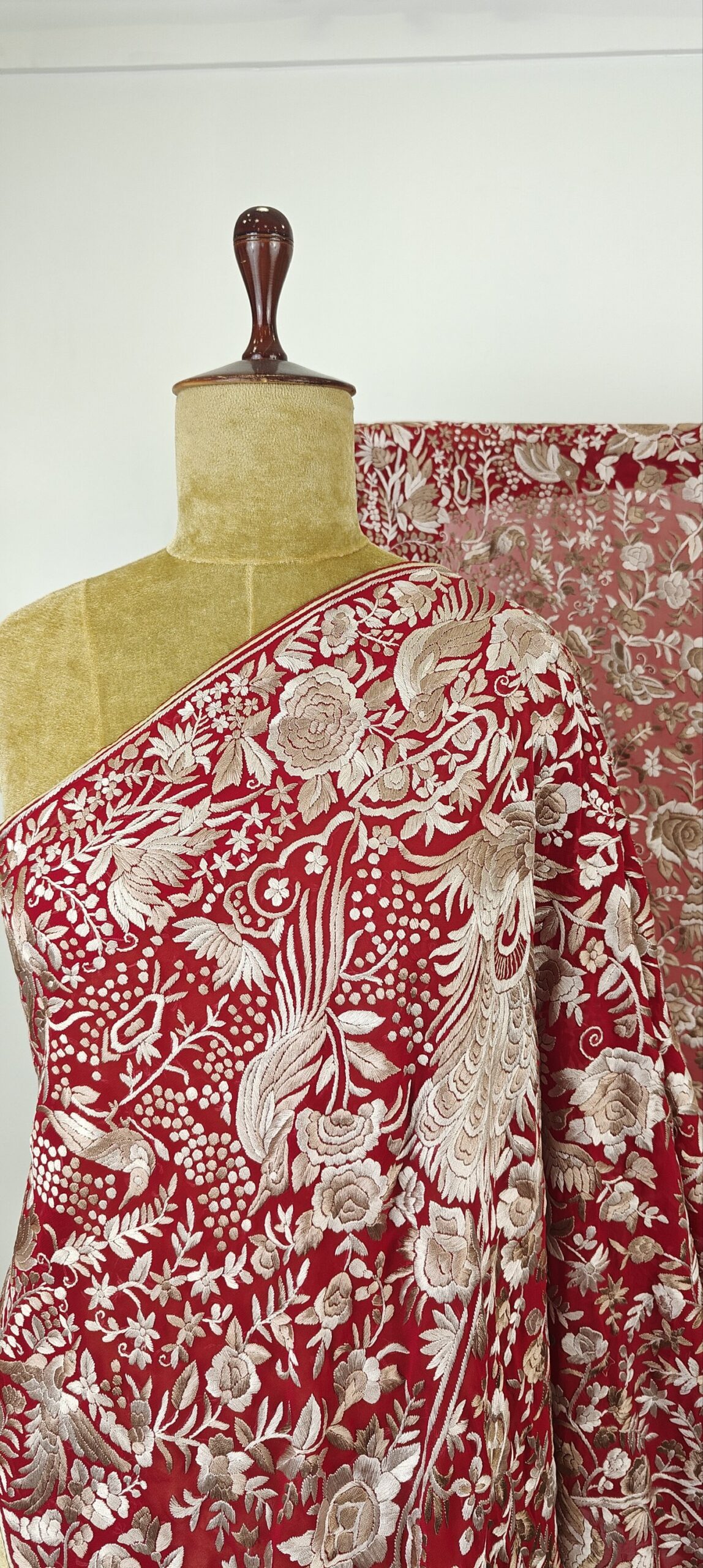 Maroon color parsi gara duppatta with light brown and white color thread embroidery all over duppatta with floral and birds motifs and tha fabric is pure georgette