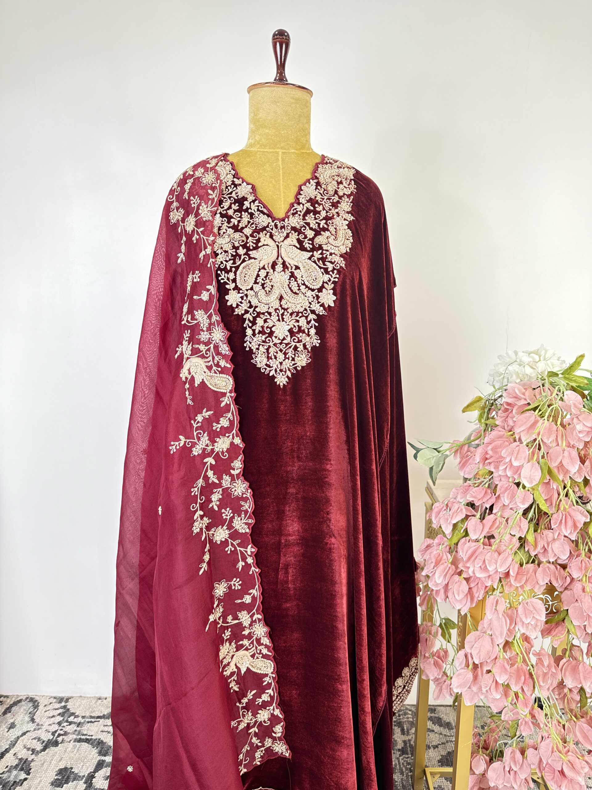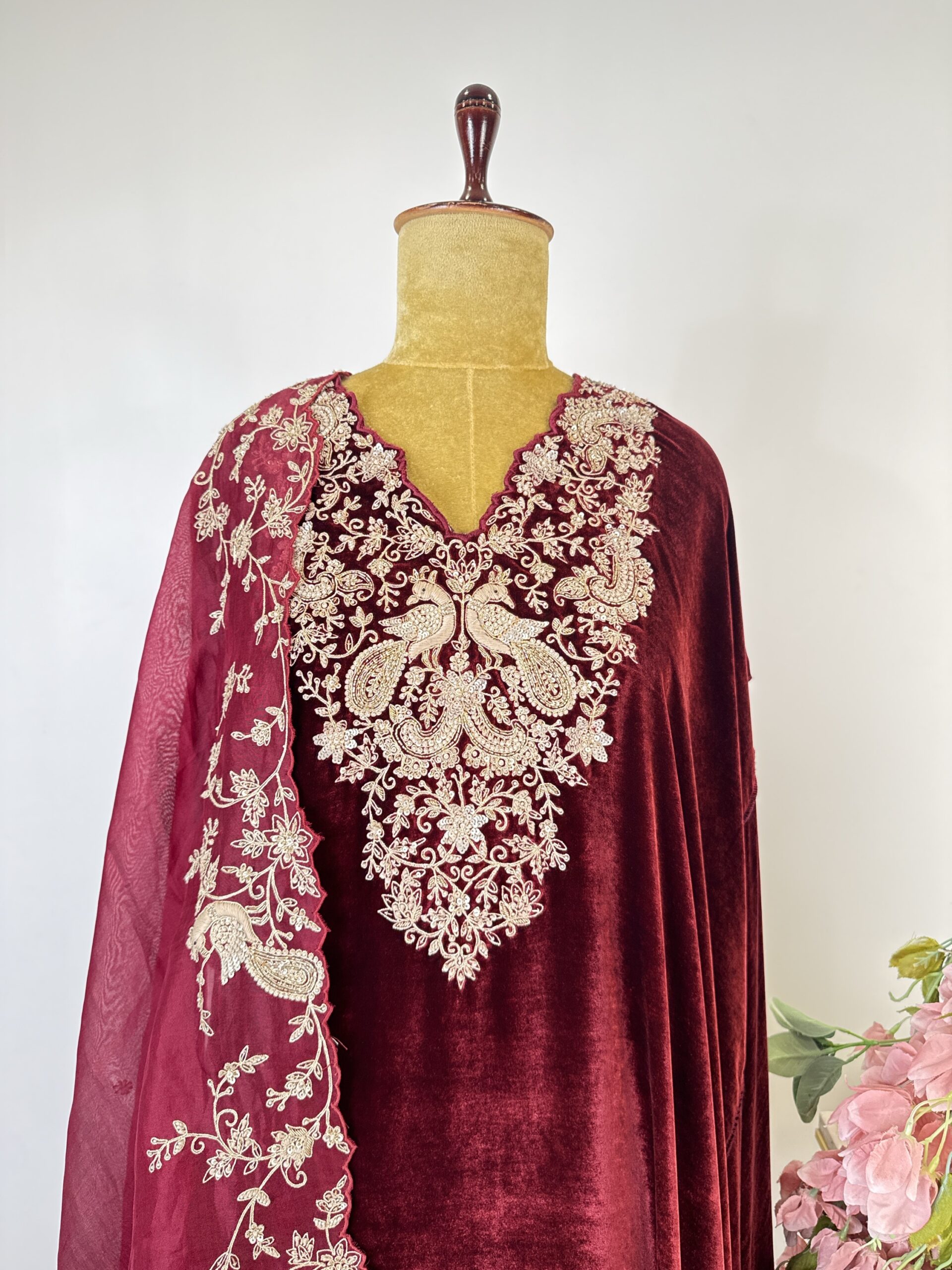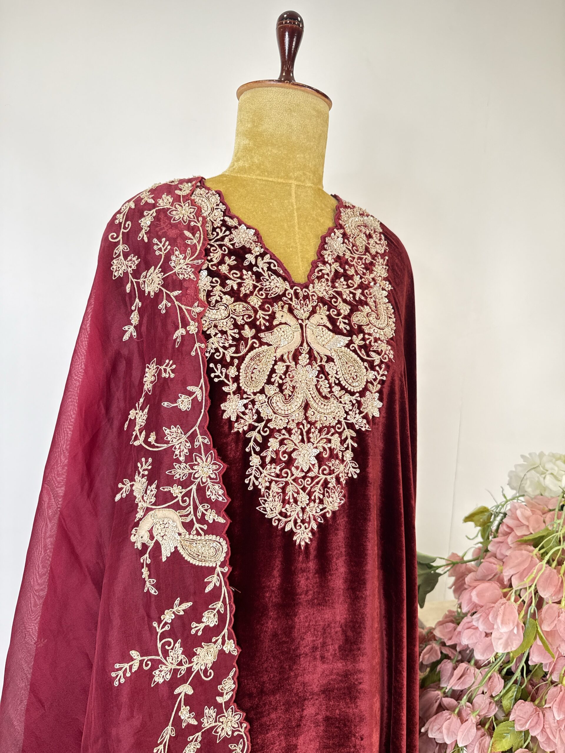 Maroon colour welvet semi stitched suit with embroidered neck line with zardosi and sequins paired with welvet bottom and organza embroidered dupatta