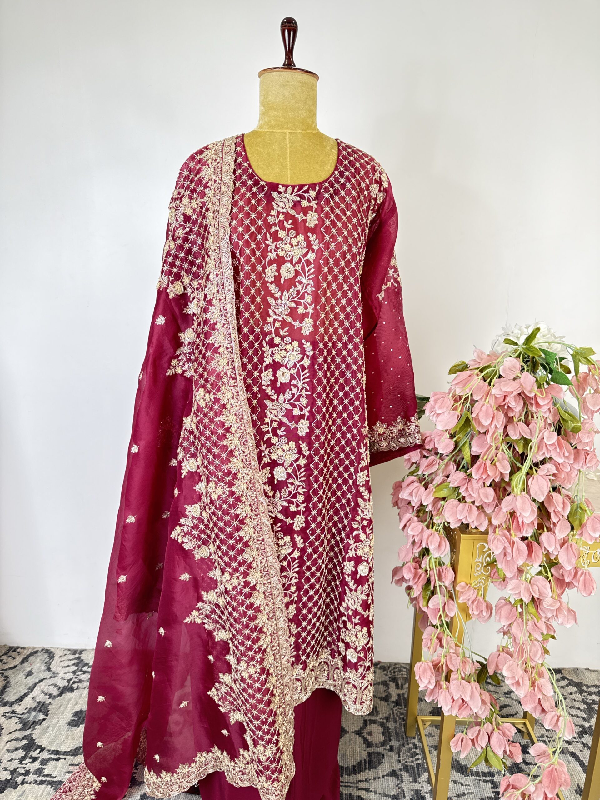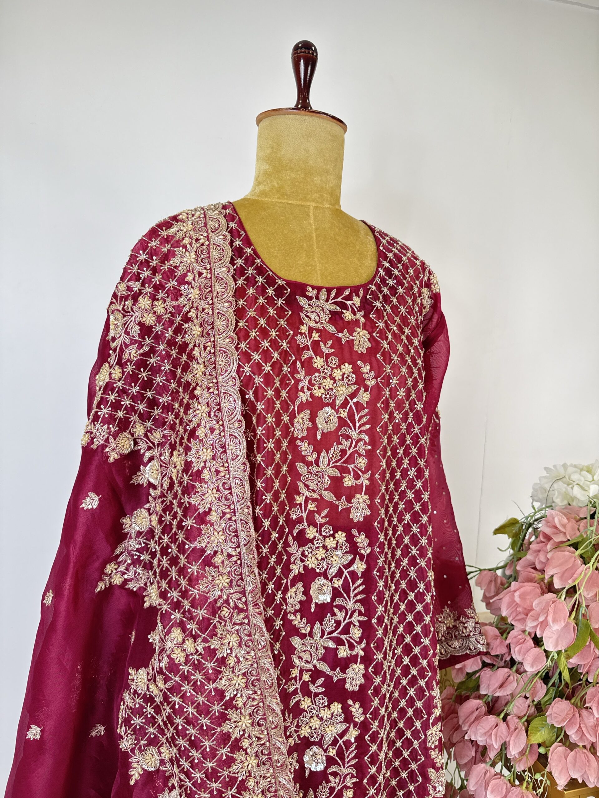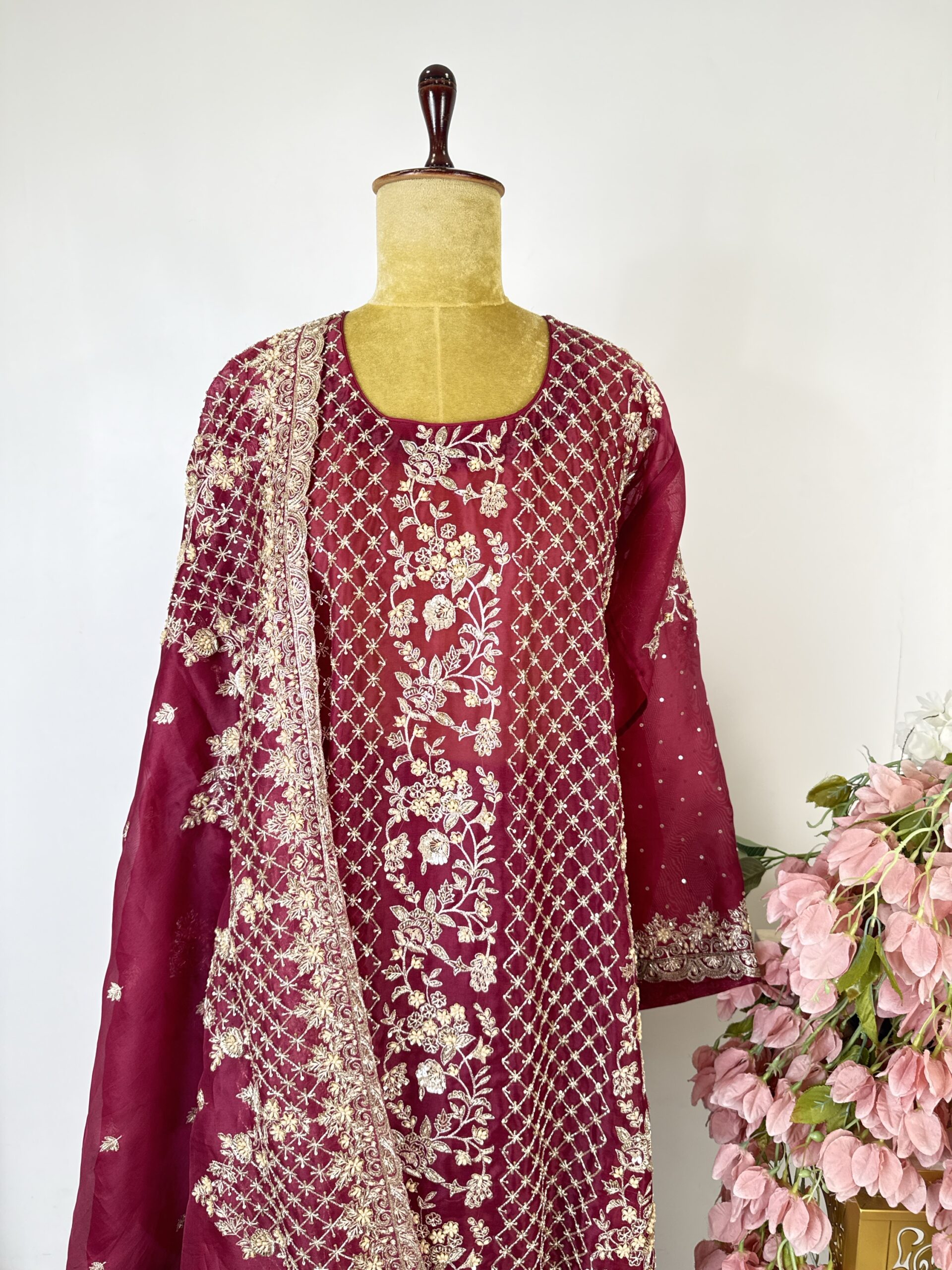 Maroon colour organza unstitched suit with embroidered neck line paired with organza dupatta and bottom