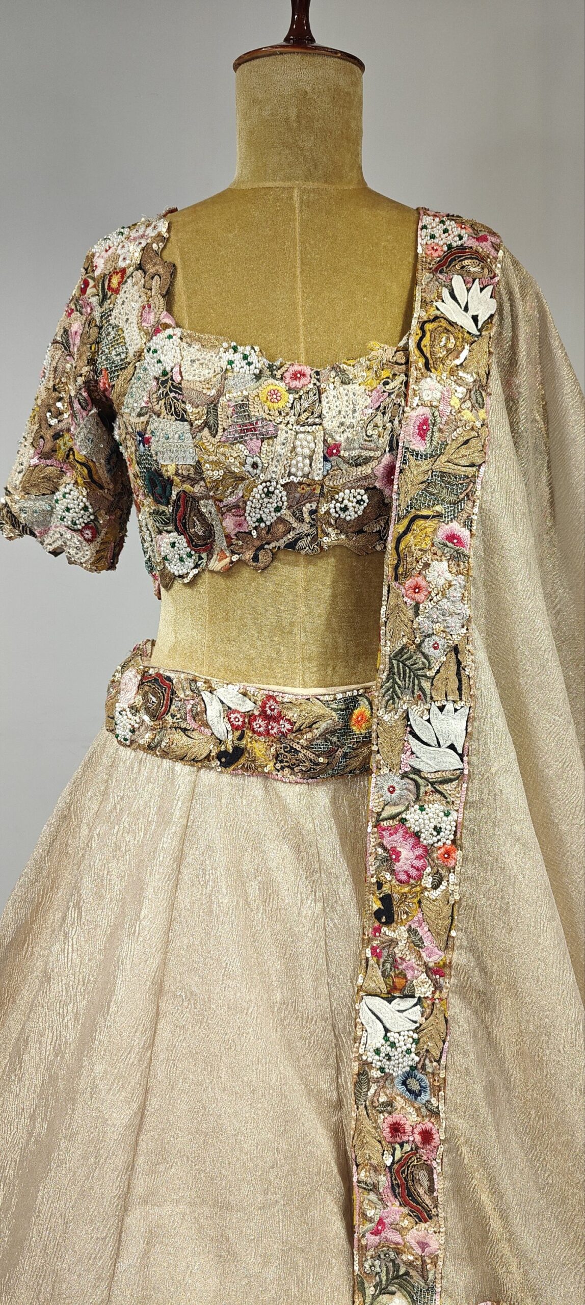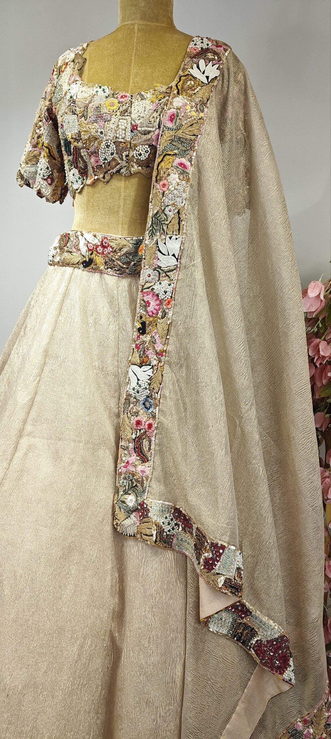 Multi colour embroidered blouse with beige crushed tissue lehenga