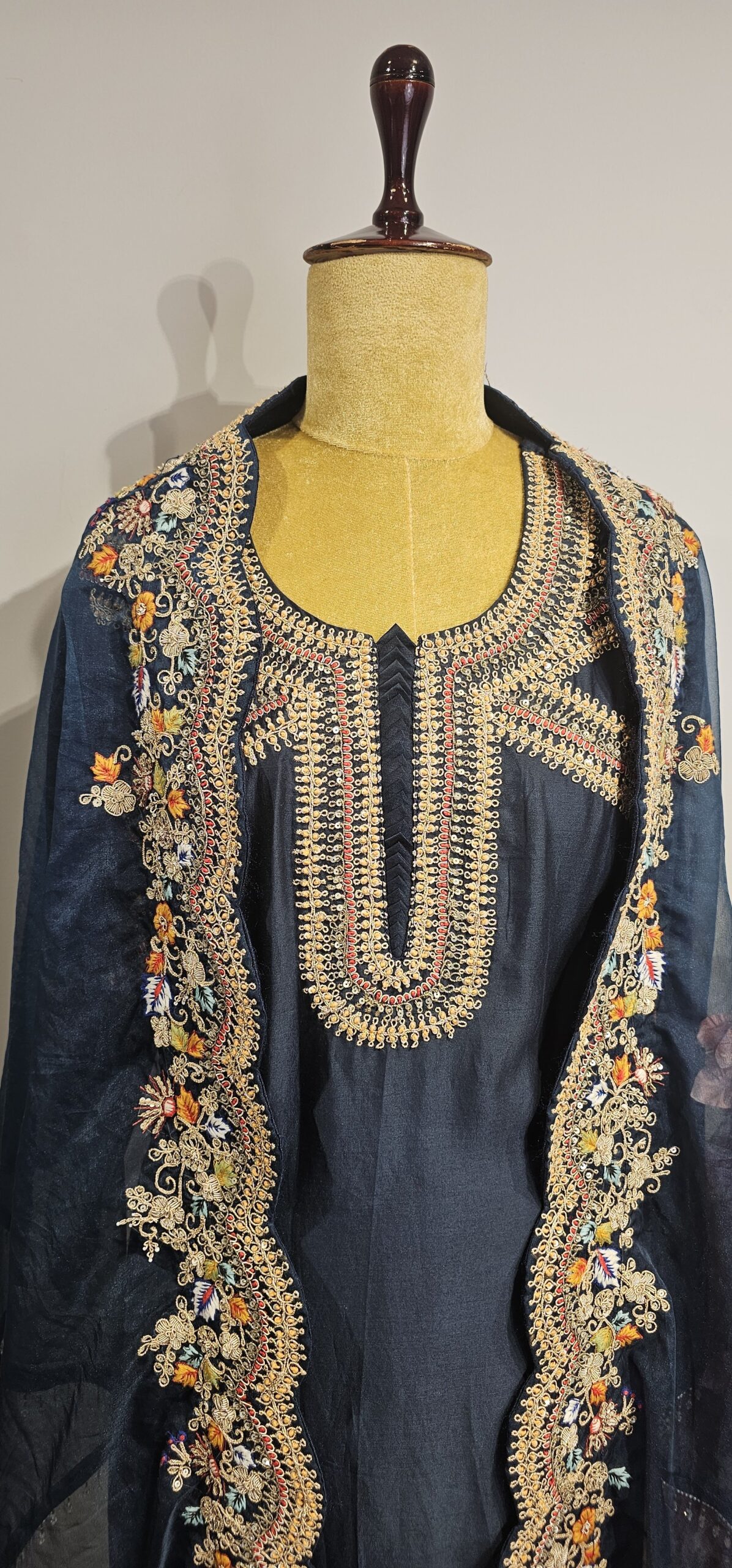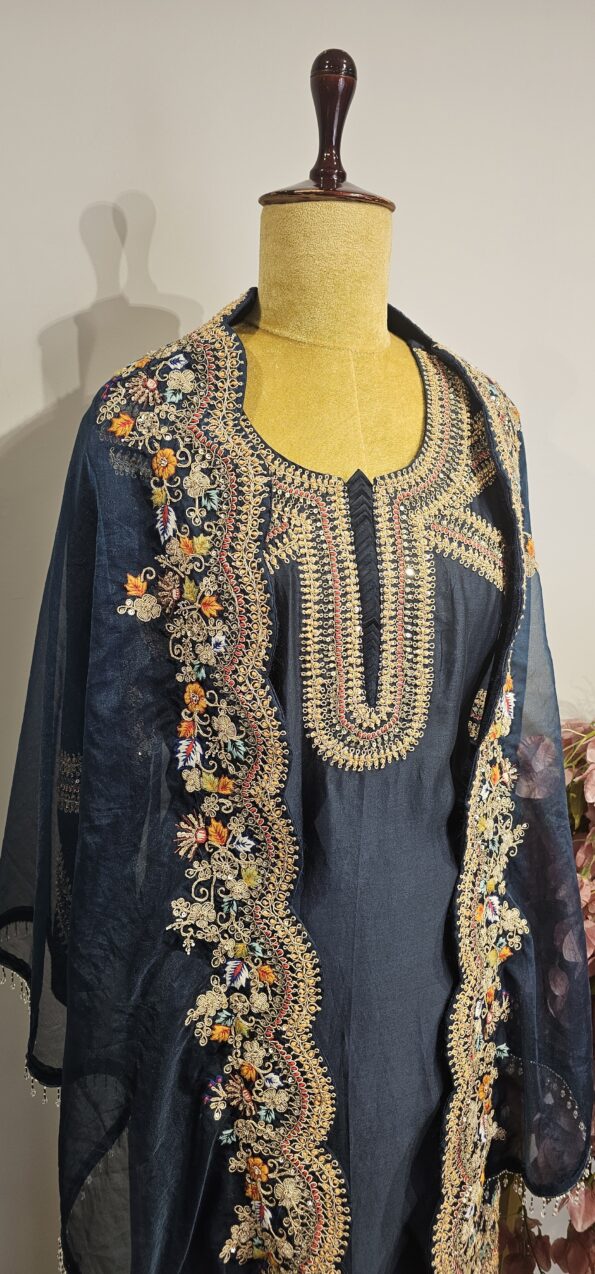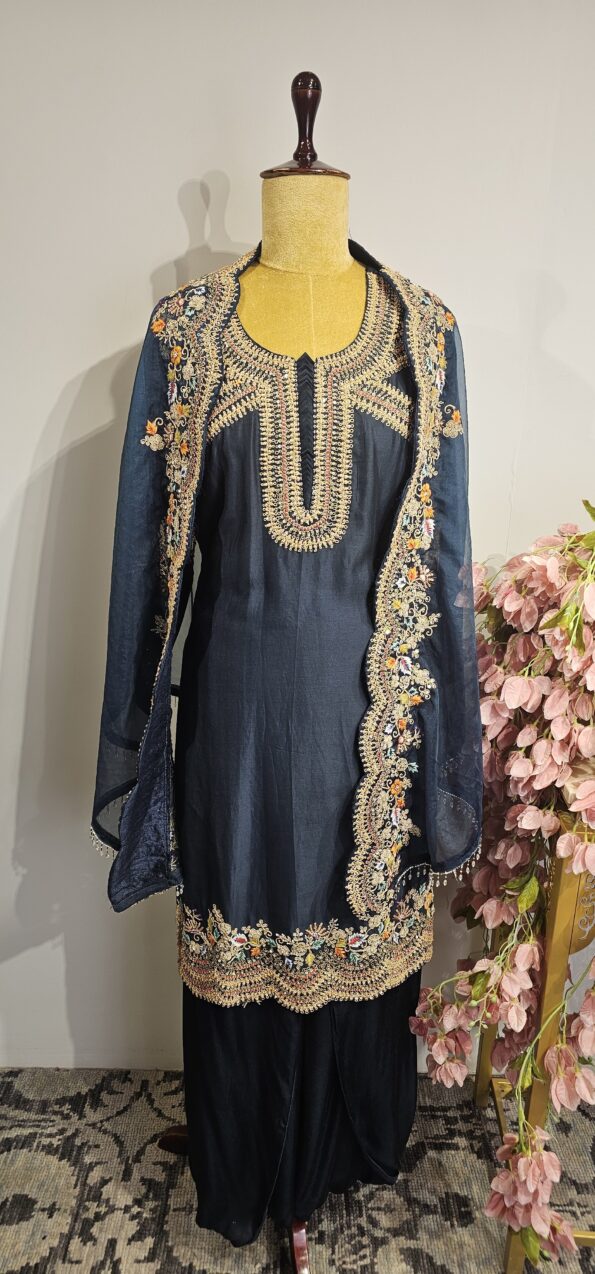 Navy blue colour kurthi set with haram pants and comes with cape with beautiful dori work and thread work