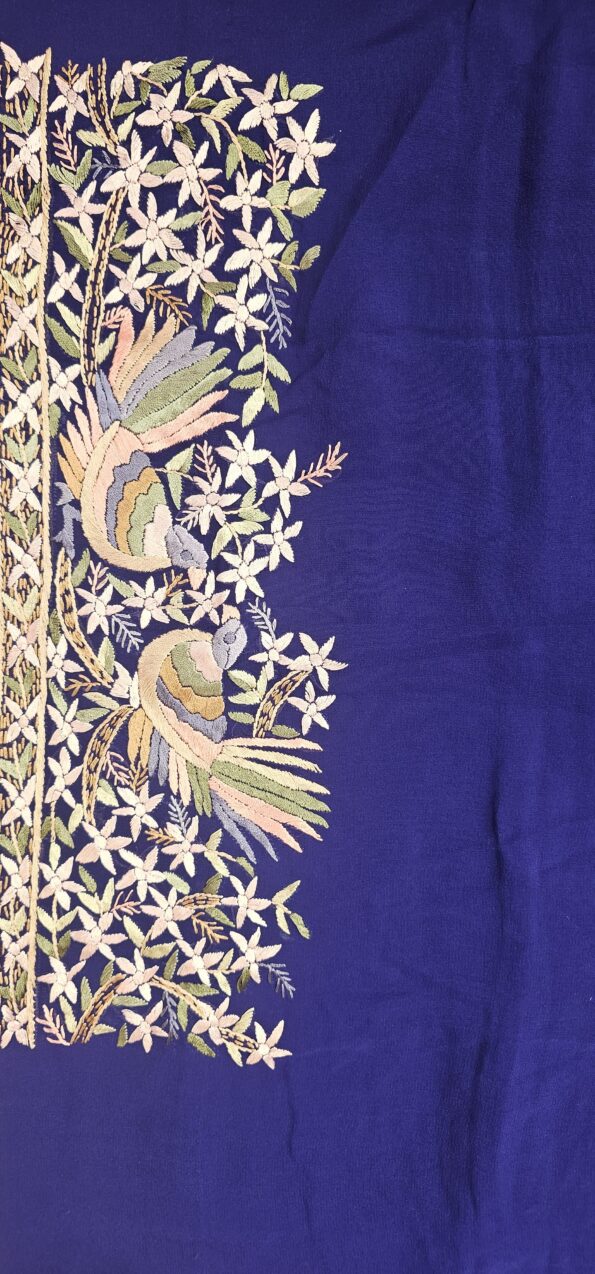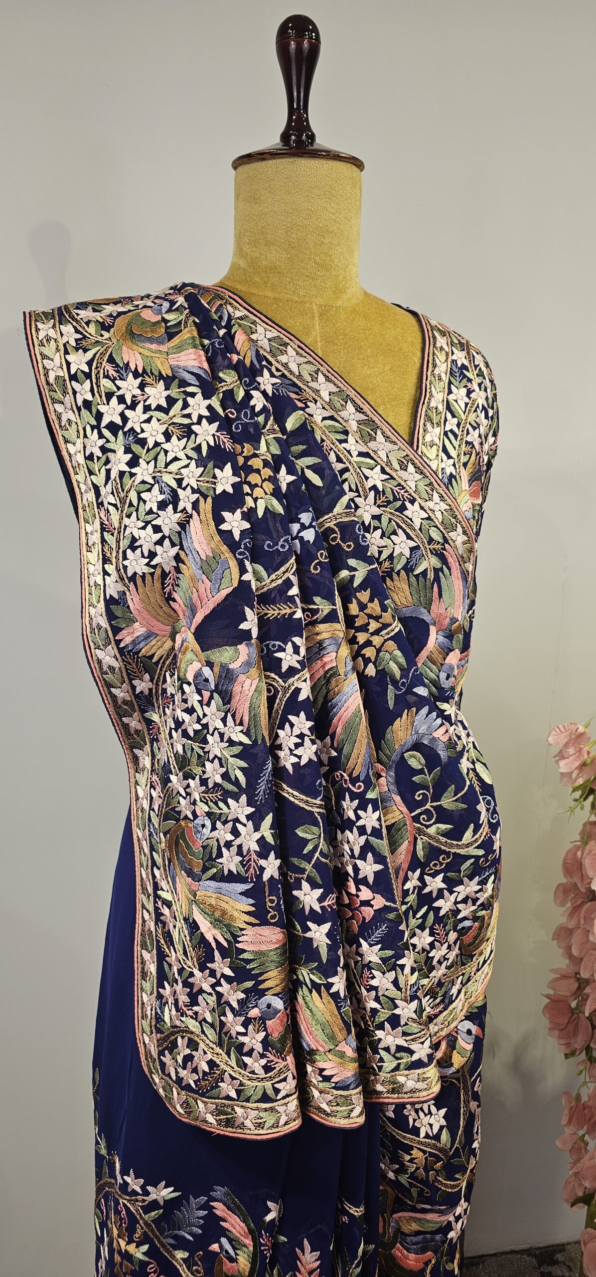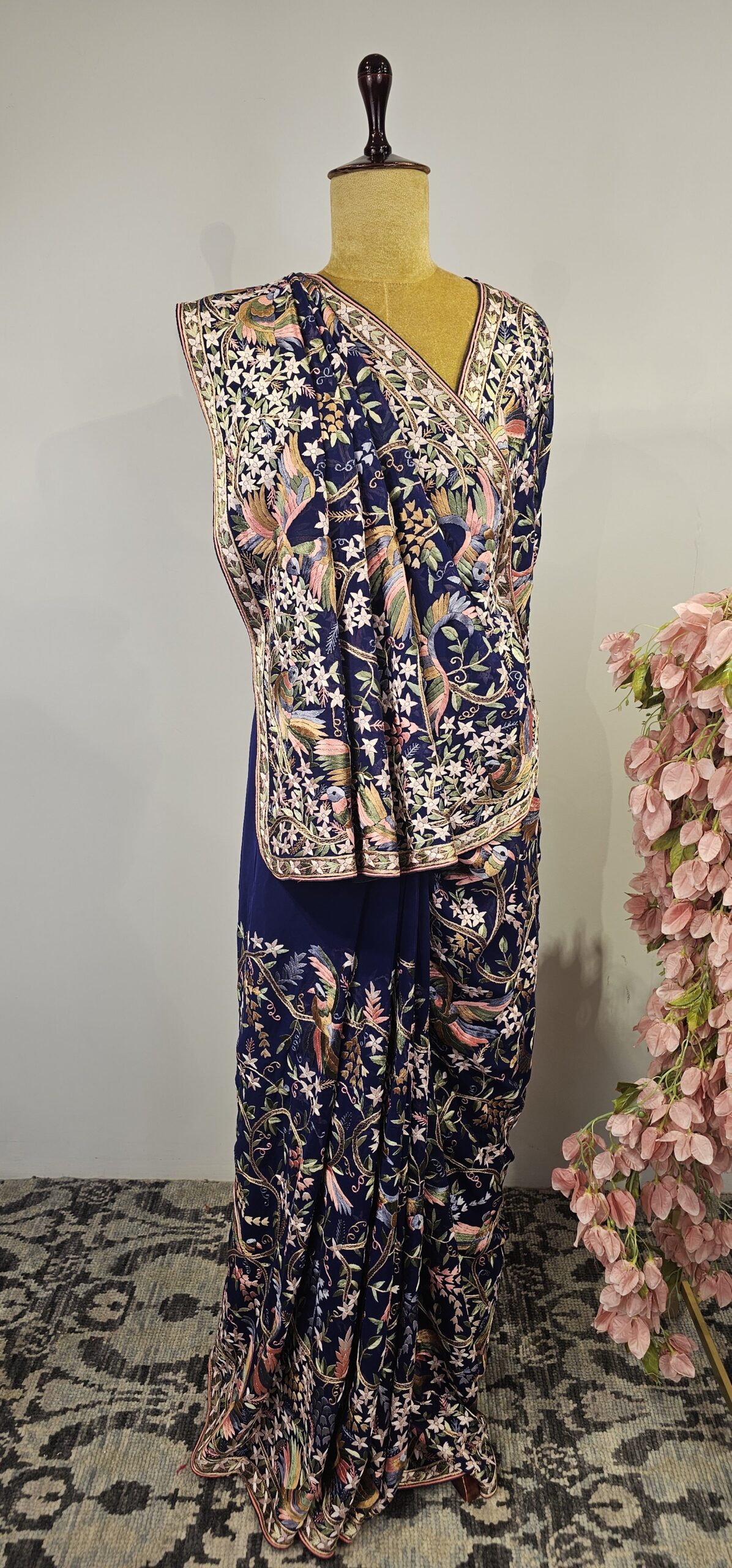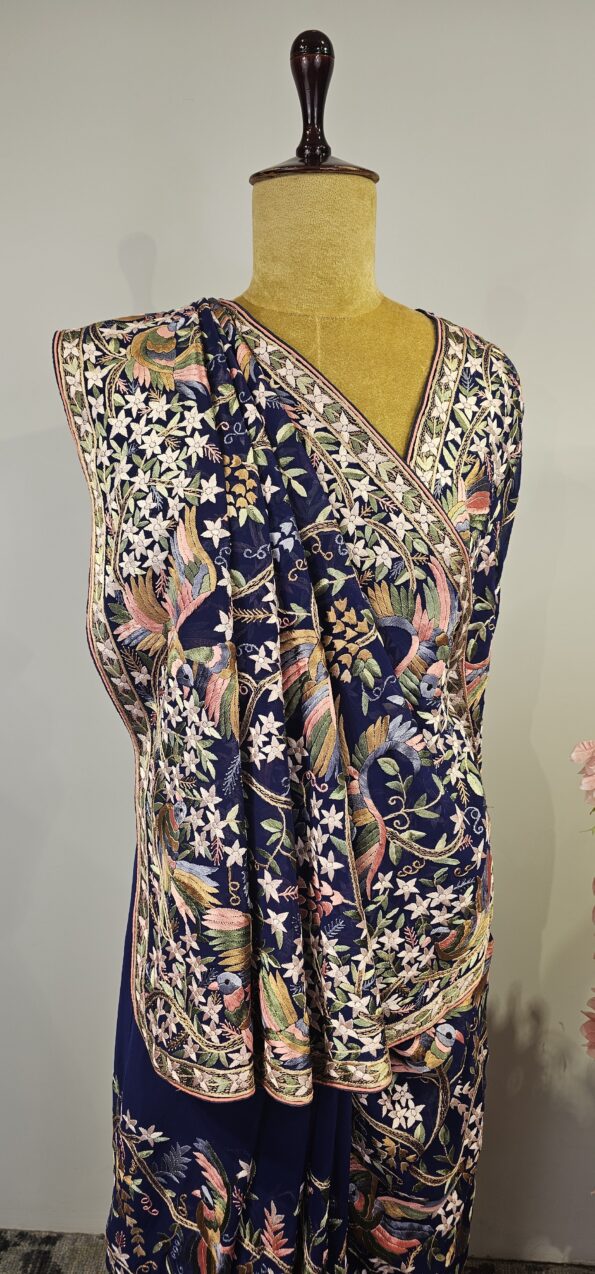 Navy blue colour georgette parsi gara saree with multi colour thread embroidery with beautiful floral and birds with all over jal concept saree