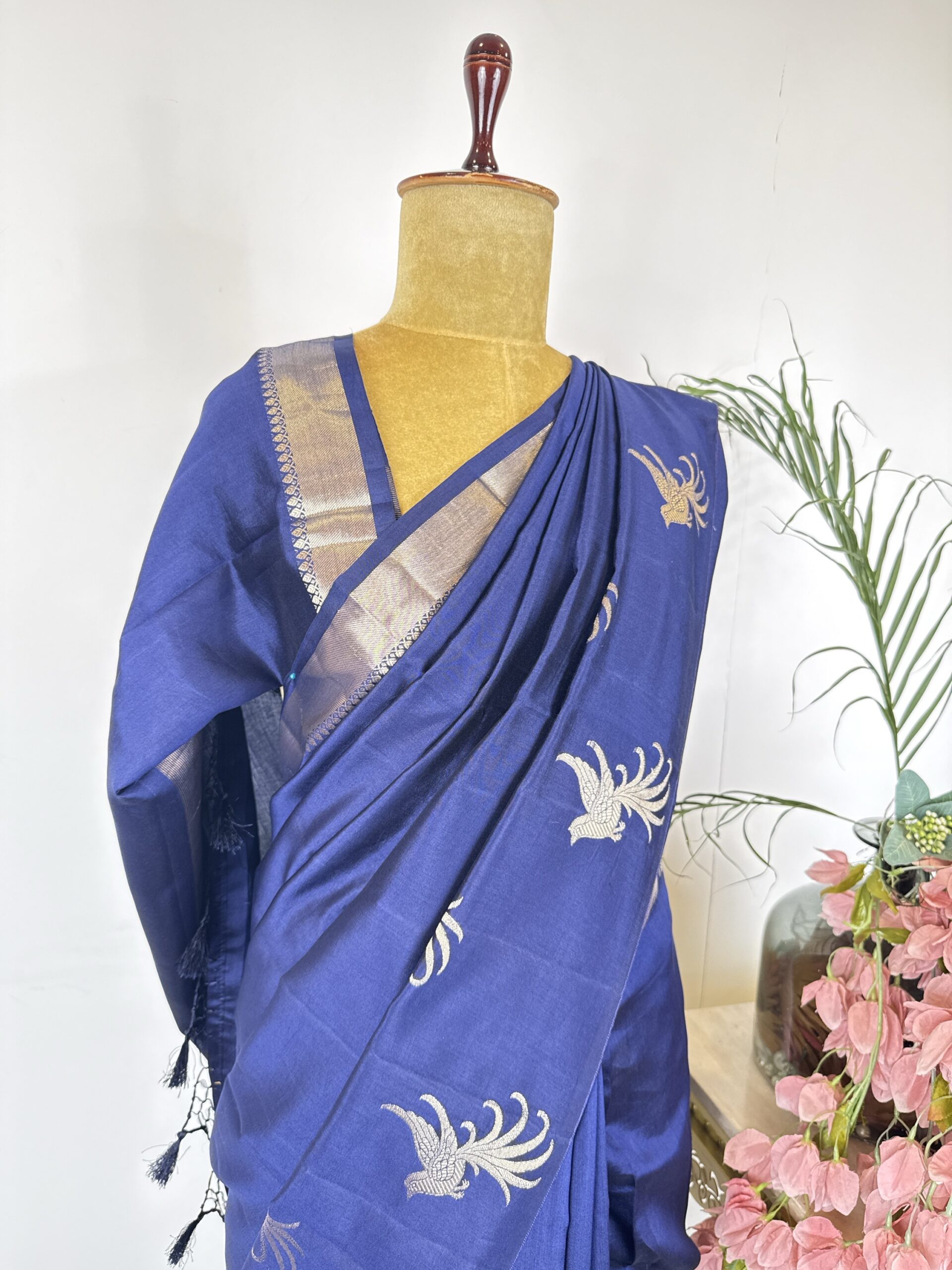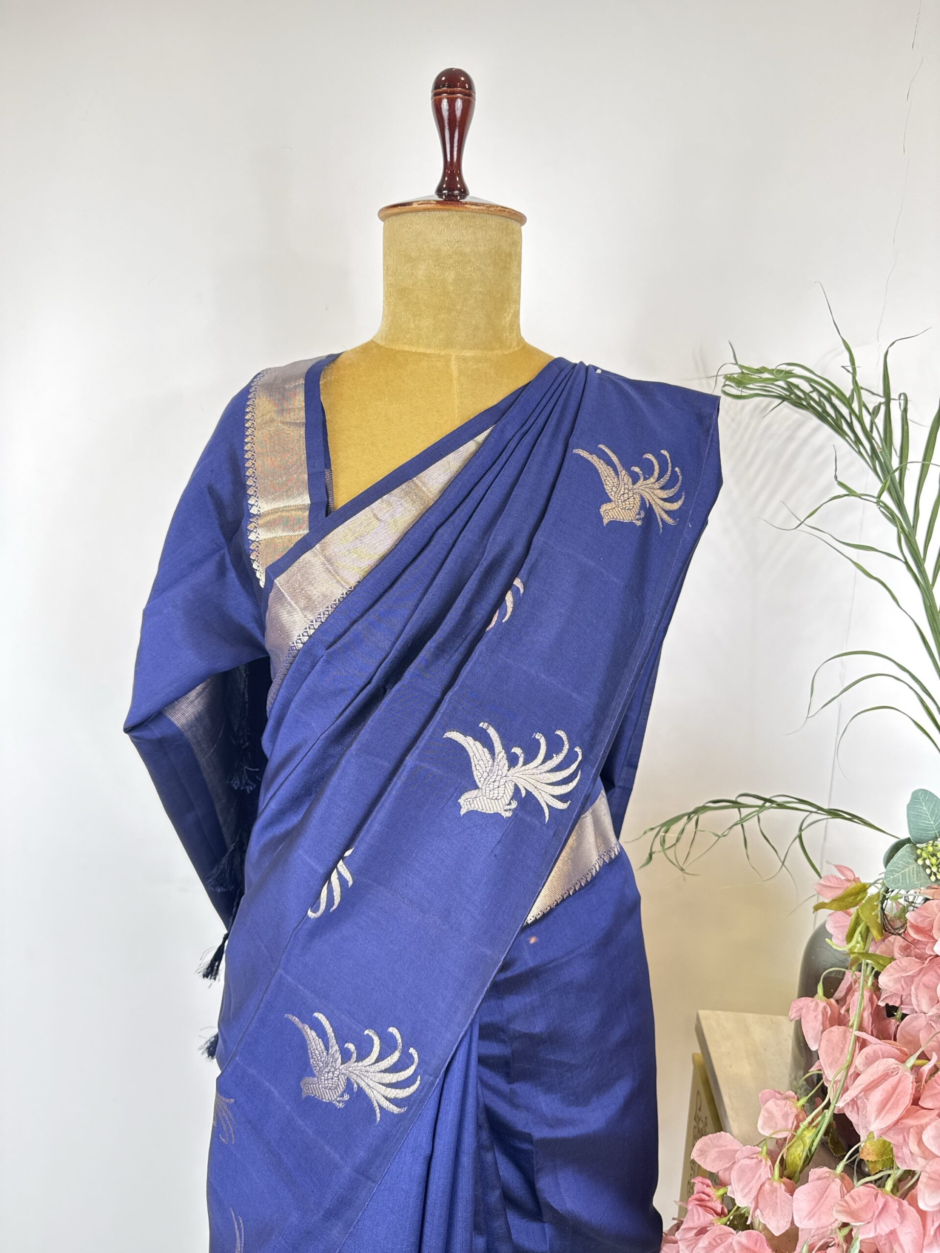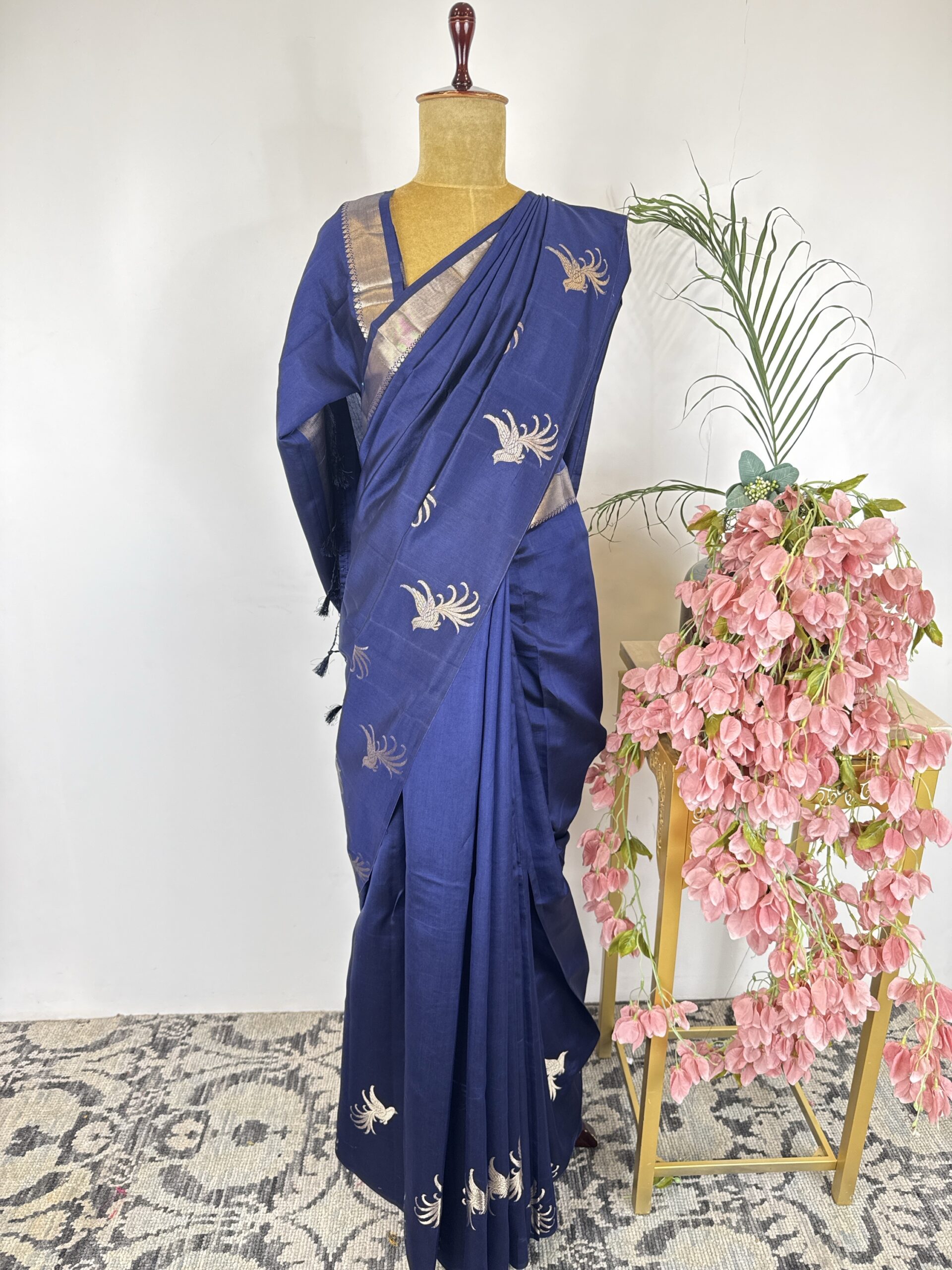 Navy blue colour raw mango saree with birds motifs in the border detailed with gold zari
