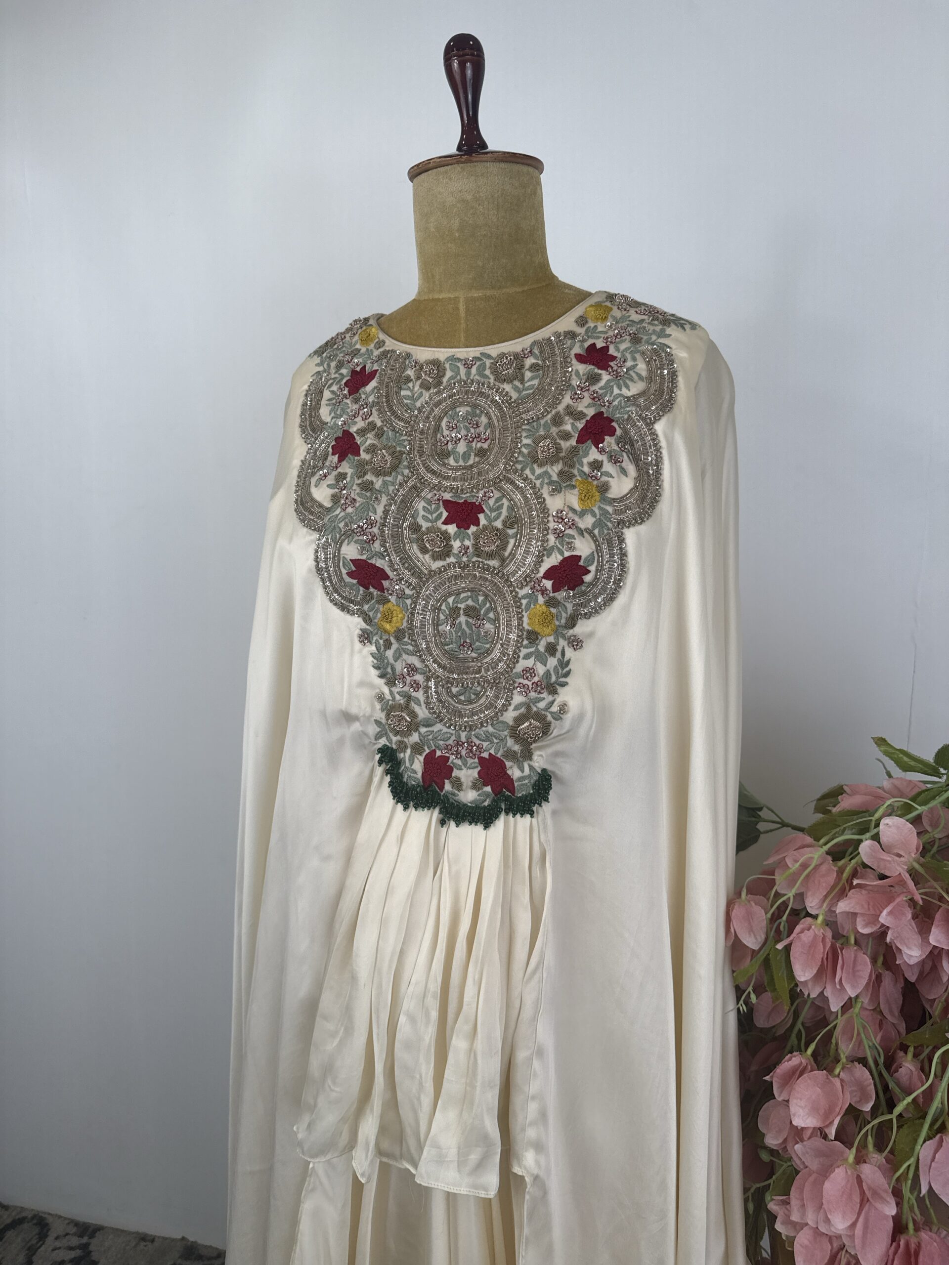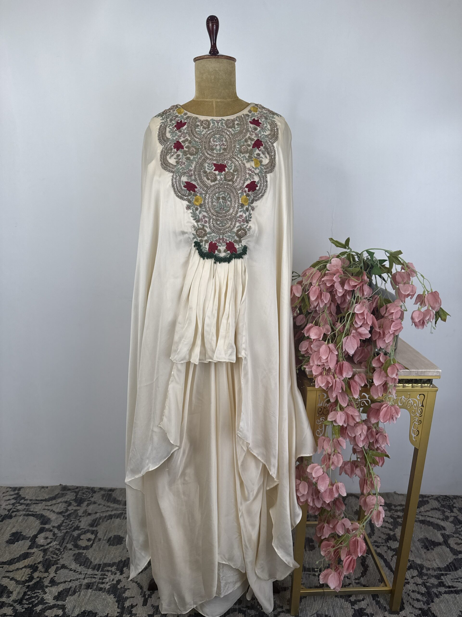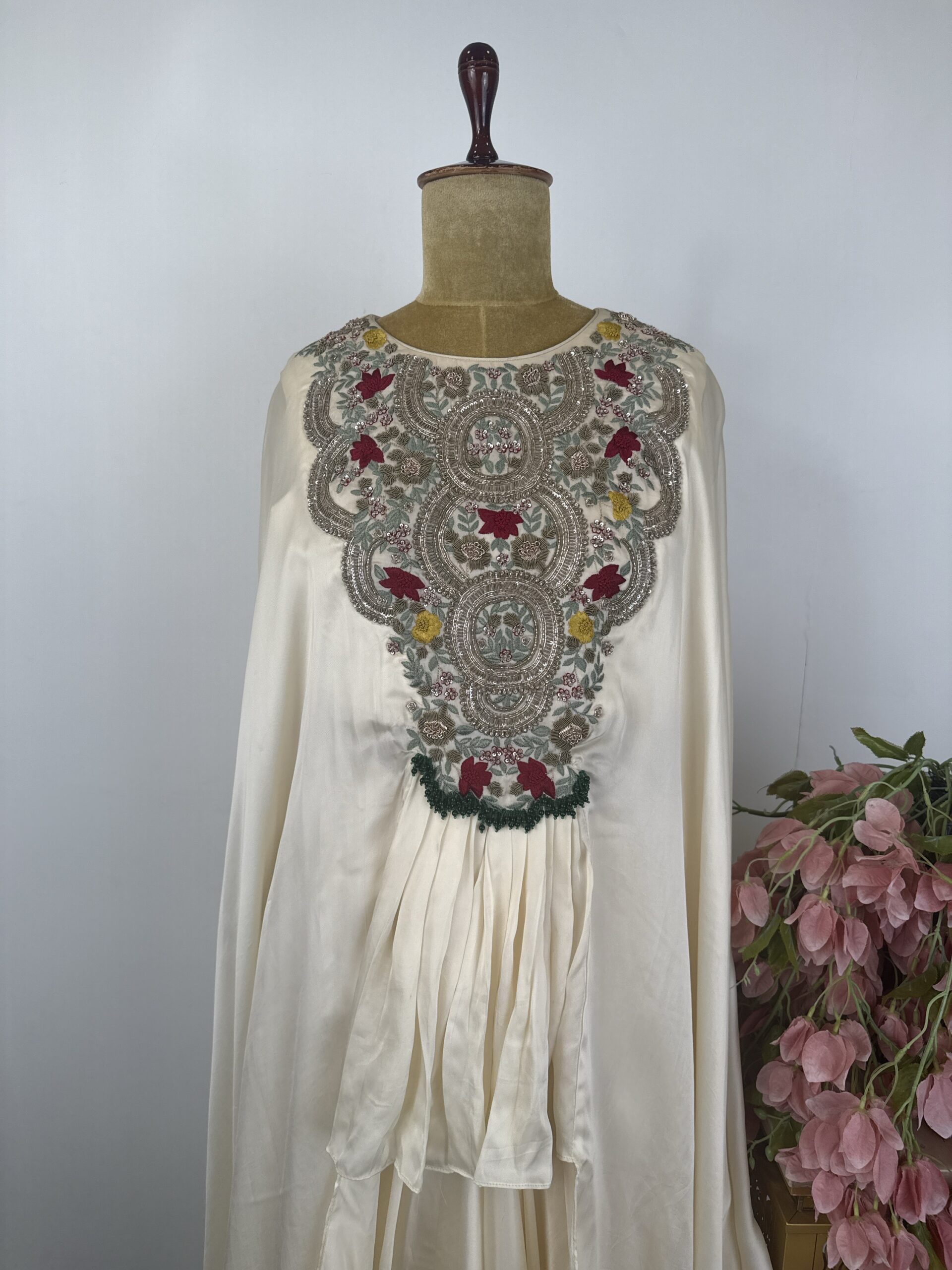 Off white colour cape style top with flared pants with beautiful hand done Zardosi and thread work at neck part and the fabric is satin