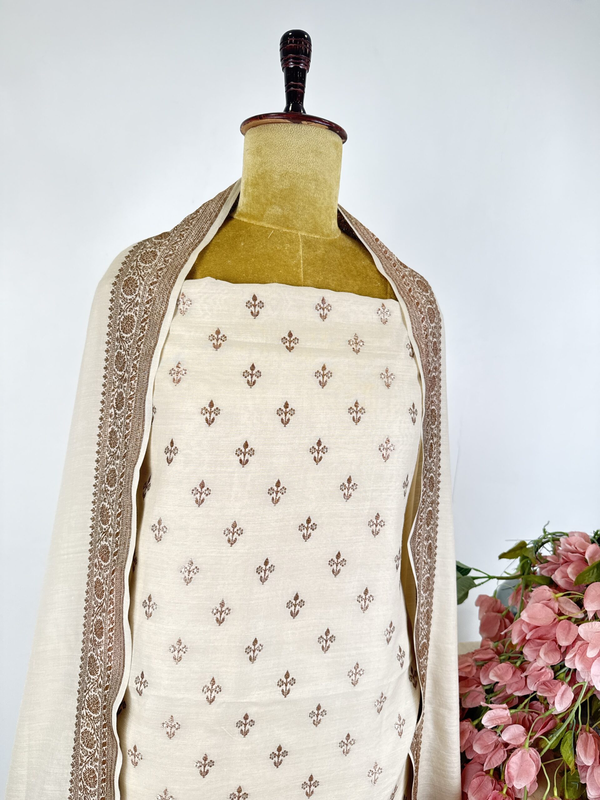 Off white munga silk unstitched suit with floral motifs detailed with zari paired with dupatta and bottom