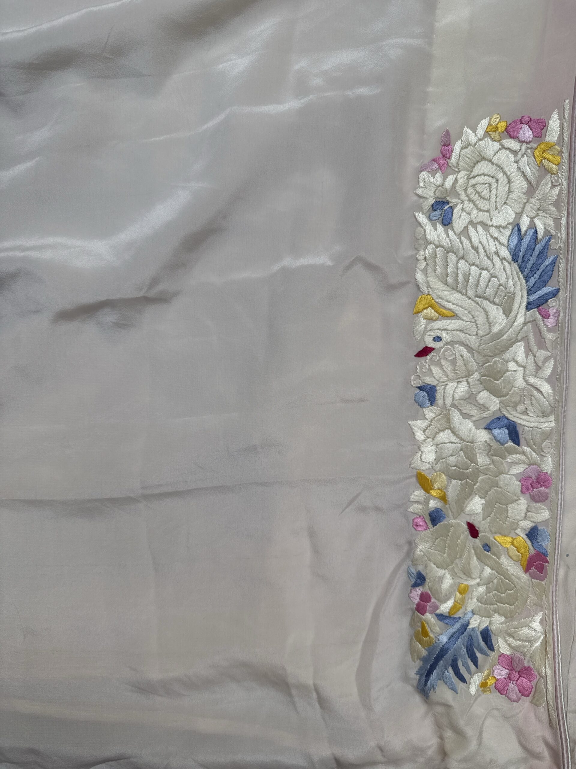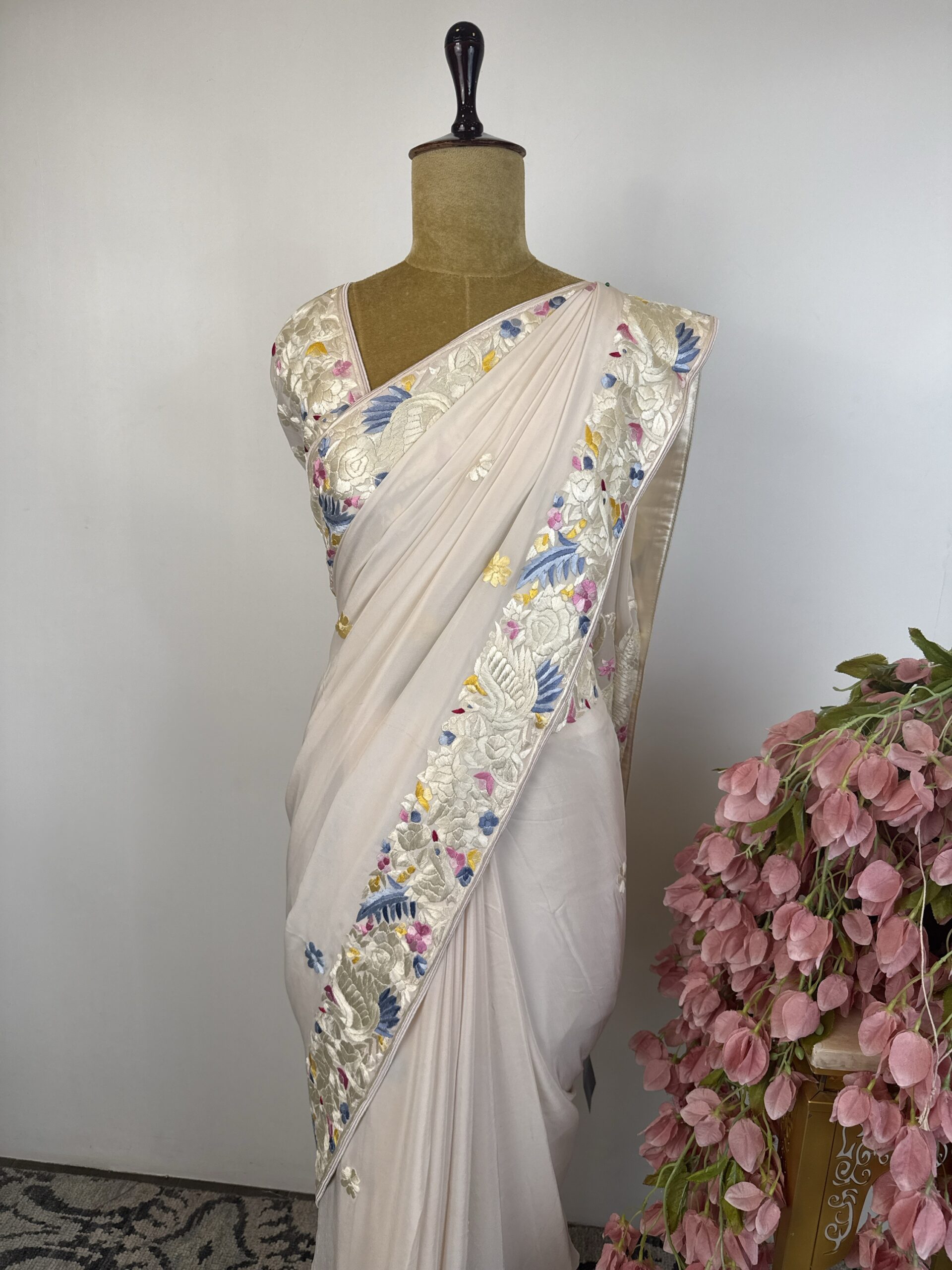 Off white colour parsi gara saree with beautiful hand done thread embroidery with floral and birds motifs all over the saree