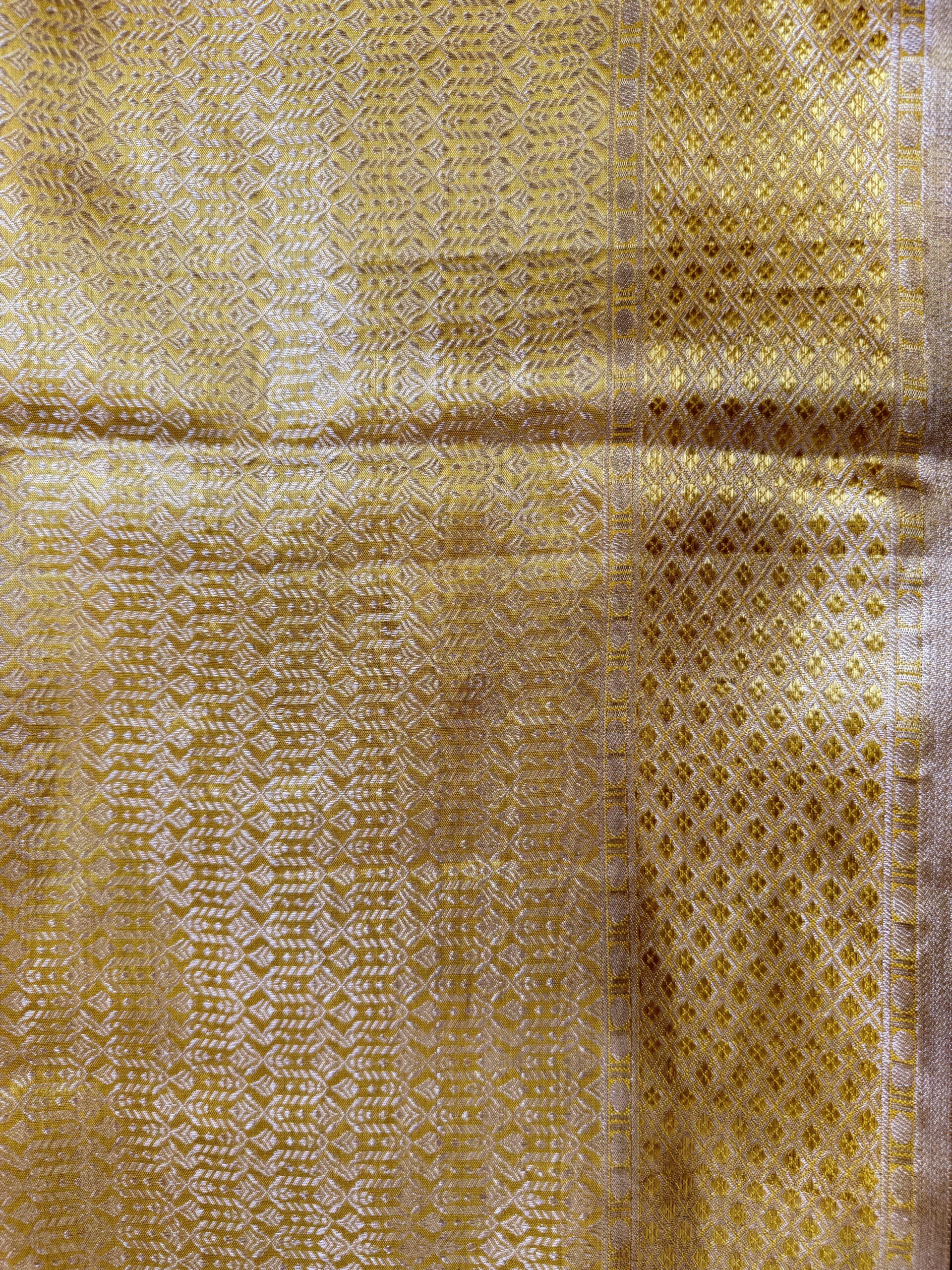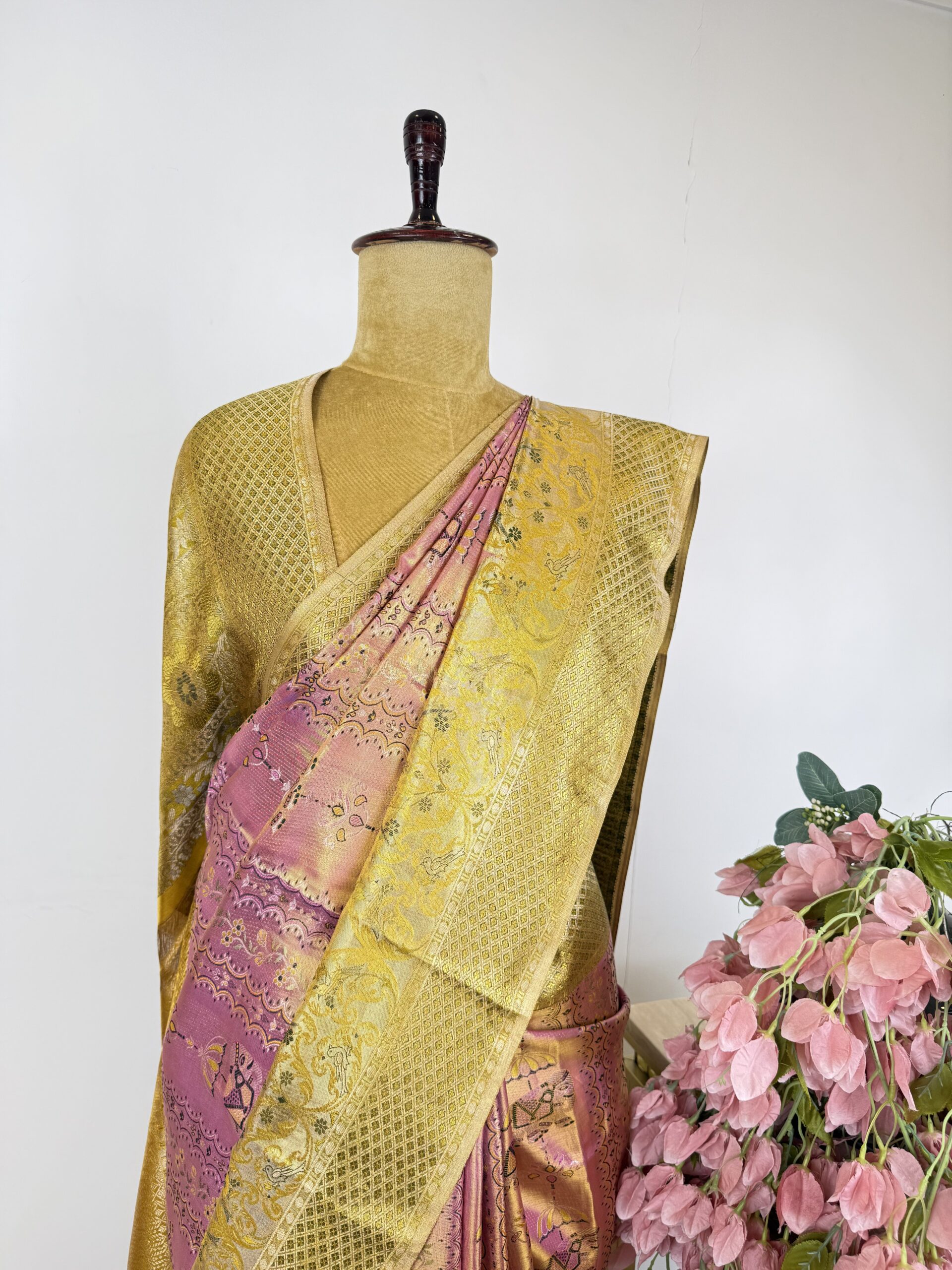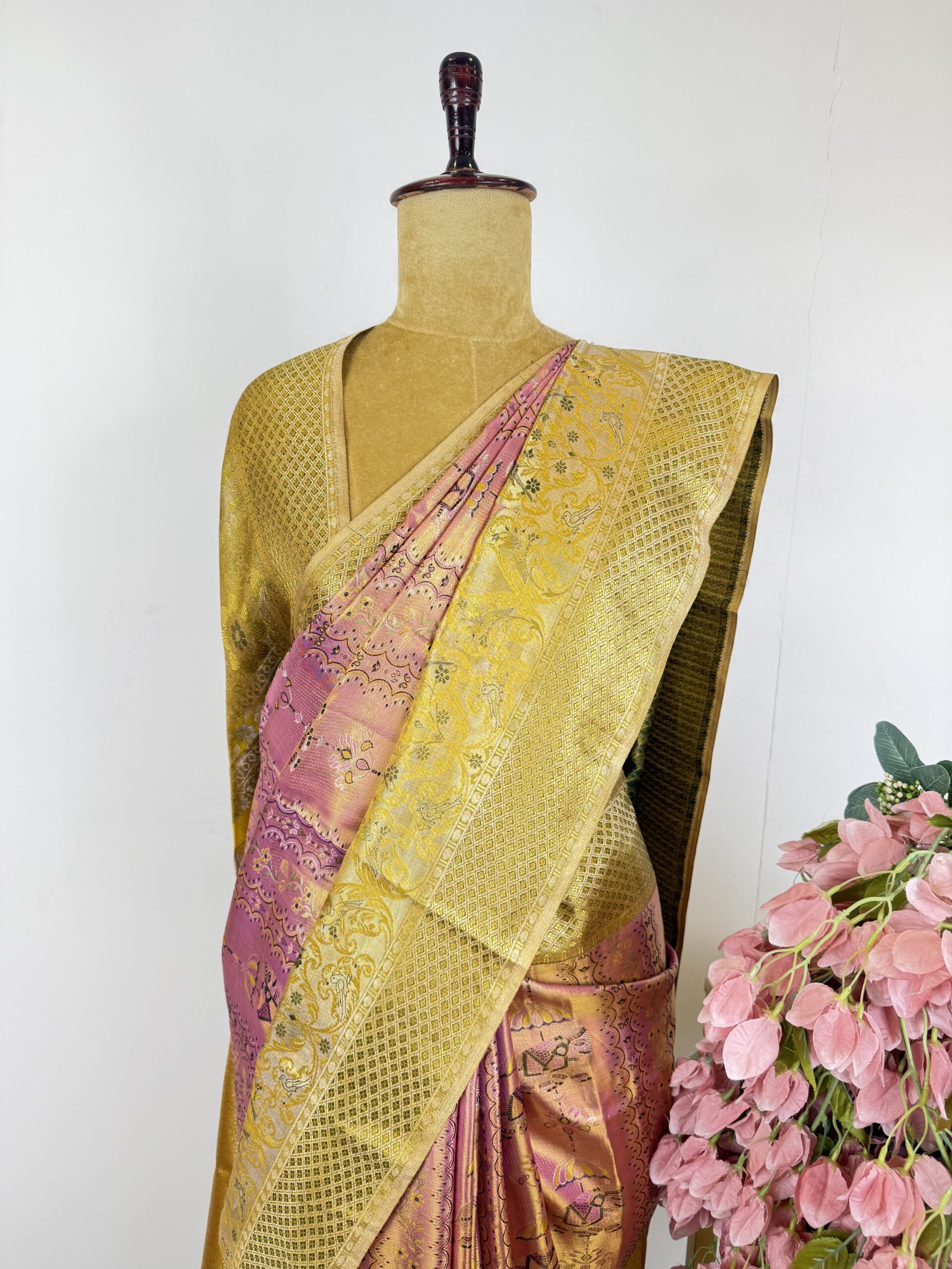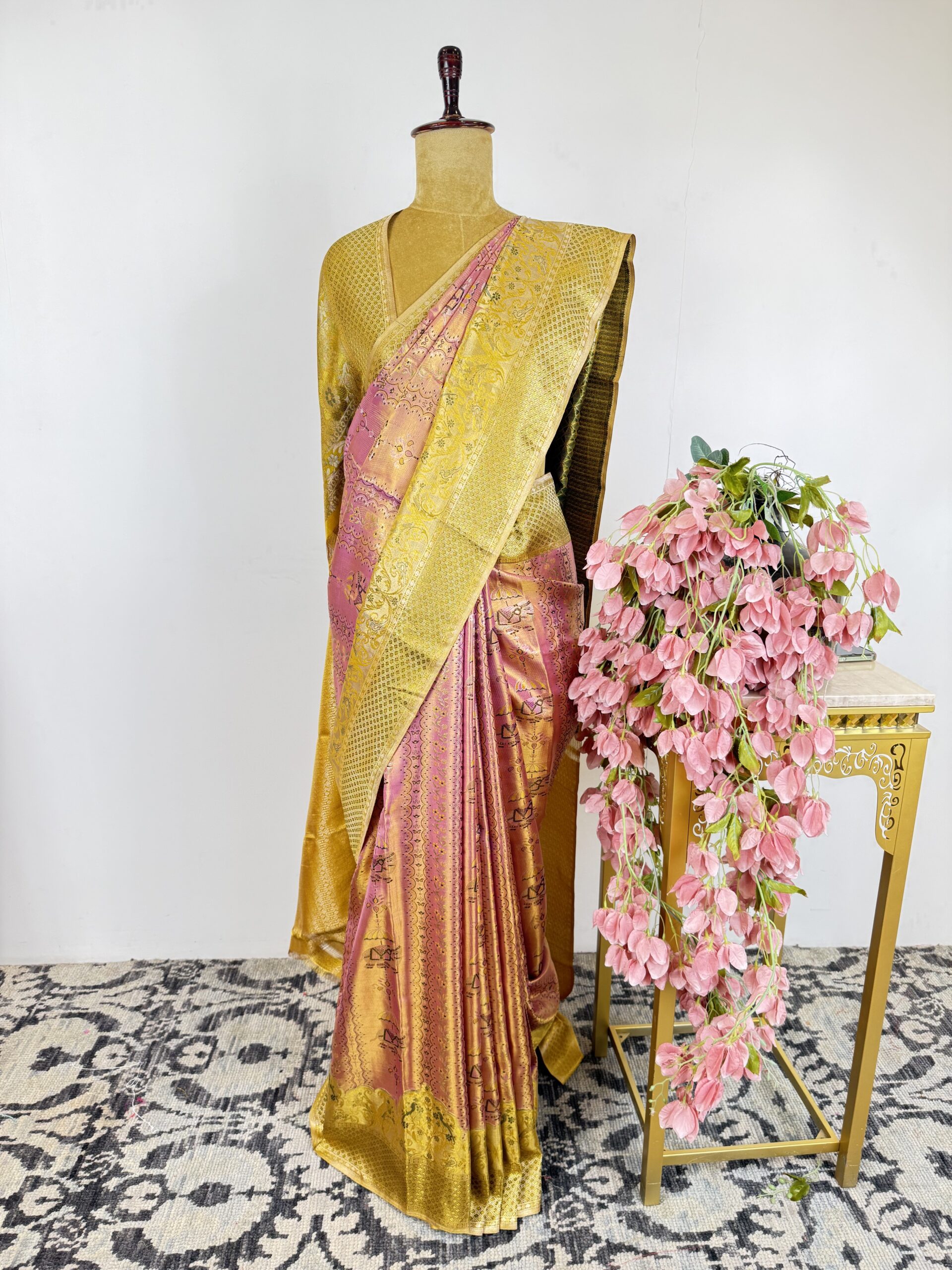Onion pink colour Kanchi saree with floral and elephants motifs detailed with meenakari and green and golden yellow color border with birds motifs