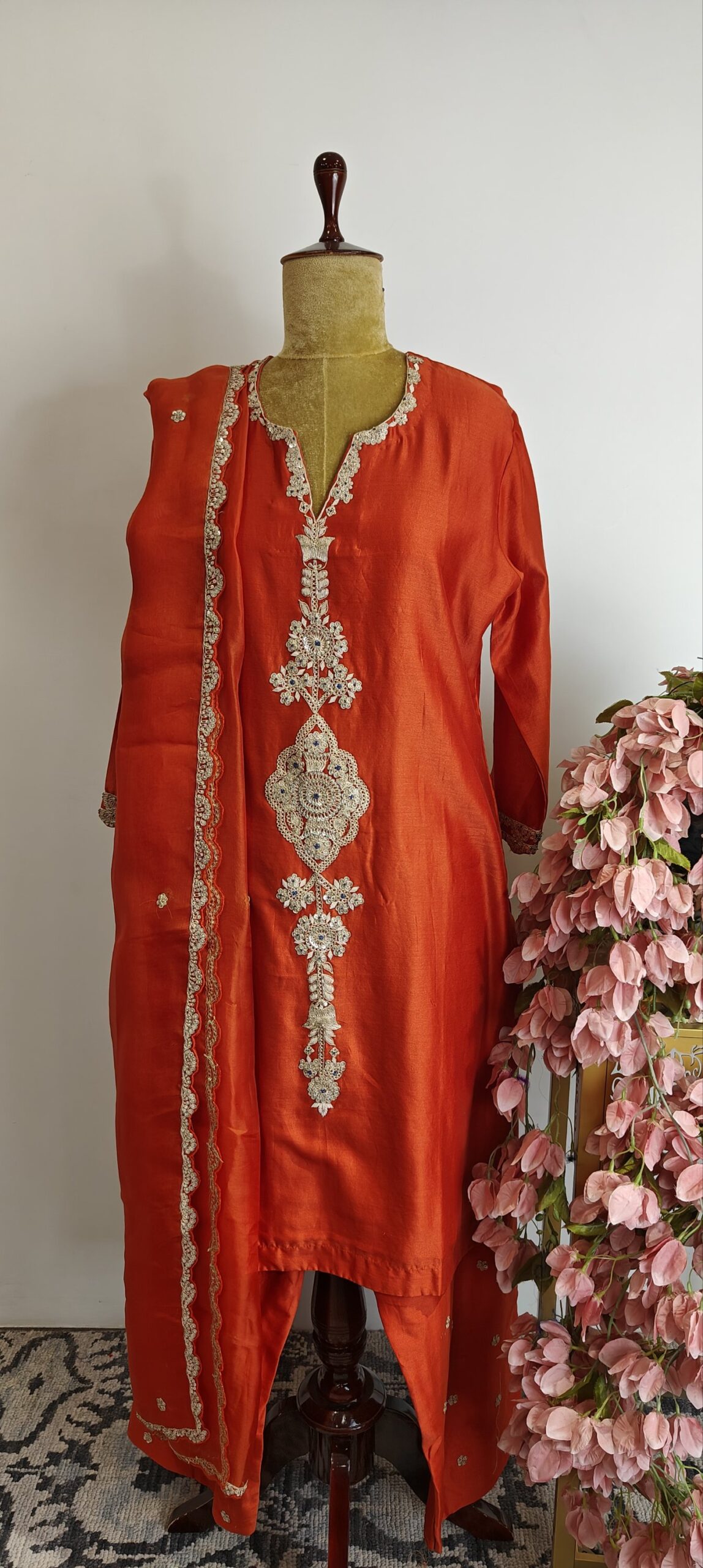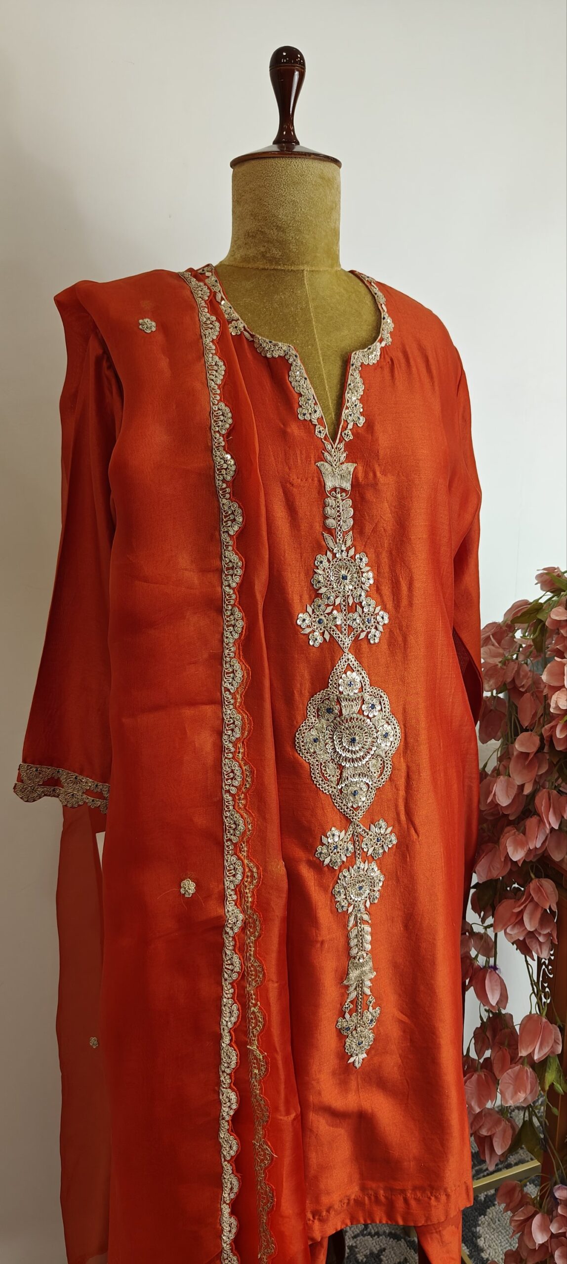 Orange colour 3pcs kurthi set with dori work at neck and pant has work at bottom part and duppatta has border