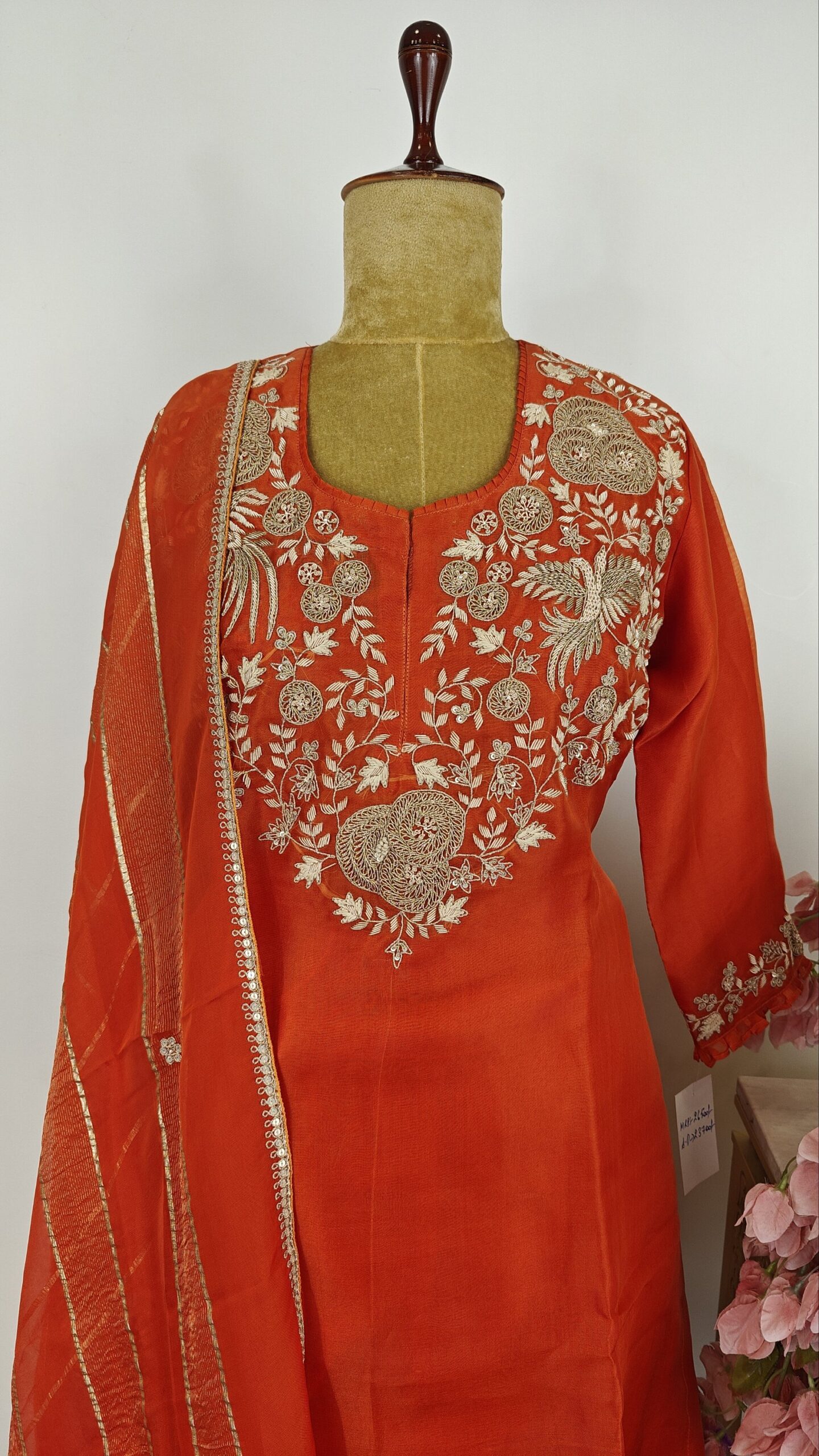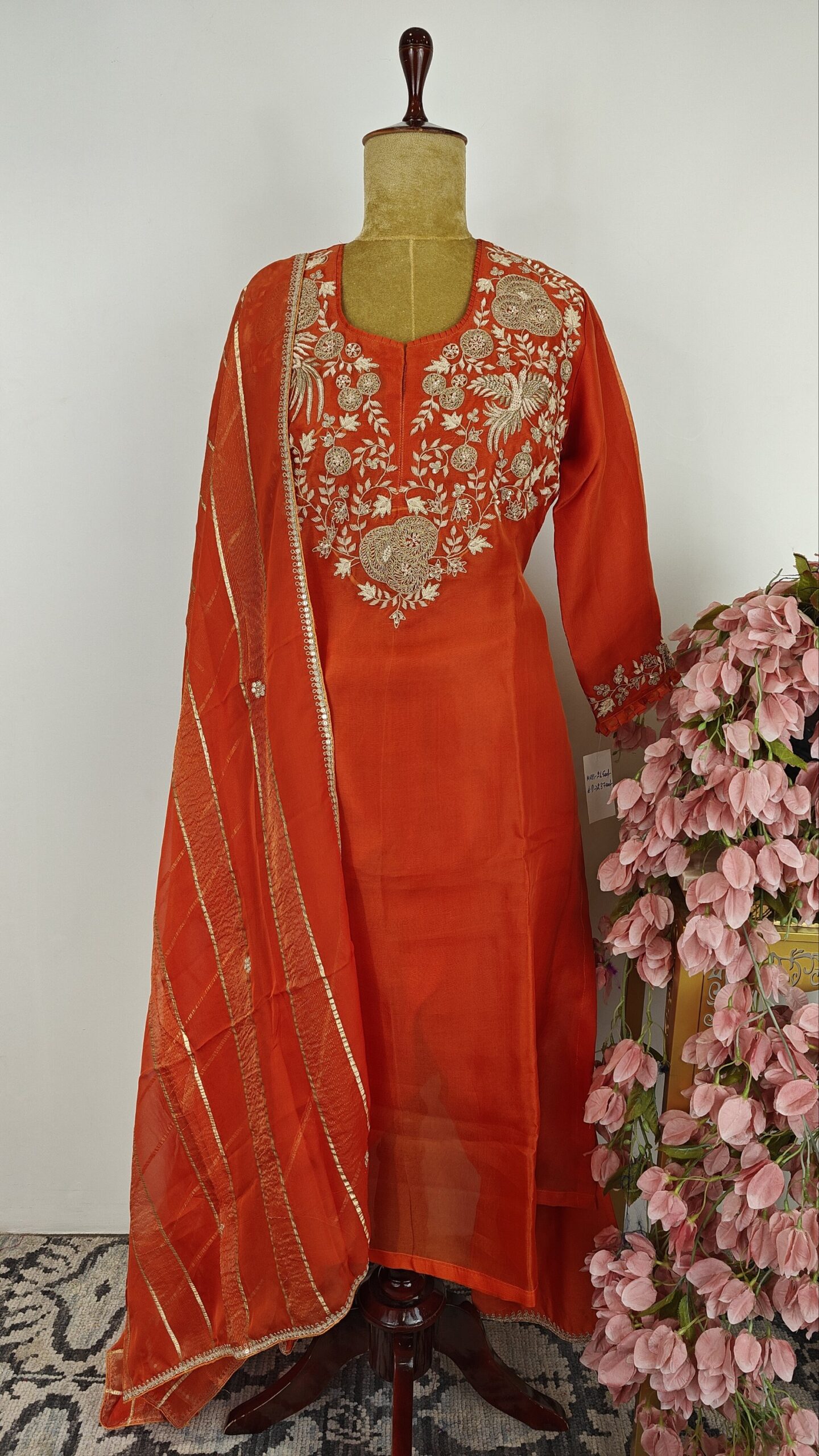 Orange colour 3pcs kurthi set top has beautiful hand done zardosi work at neck part and pant has border and duppata comes with border