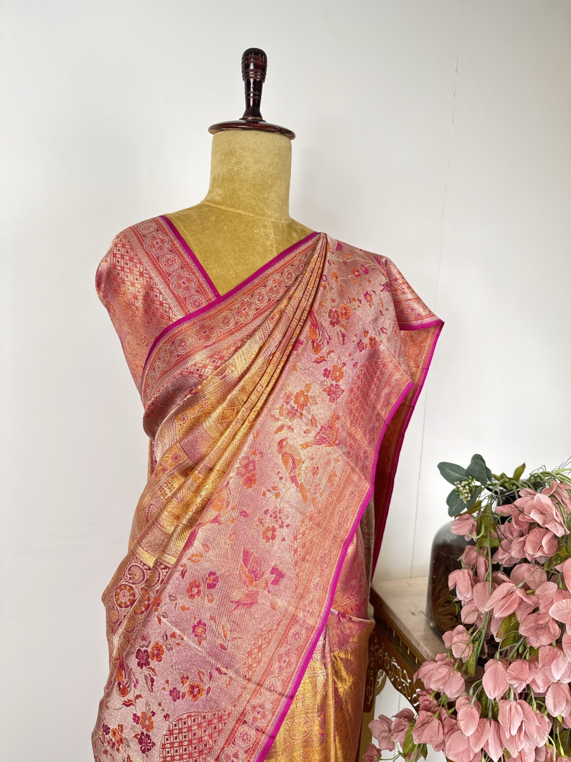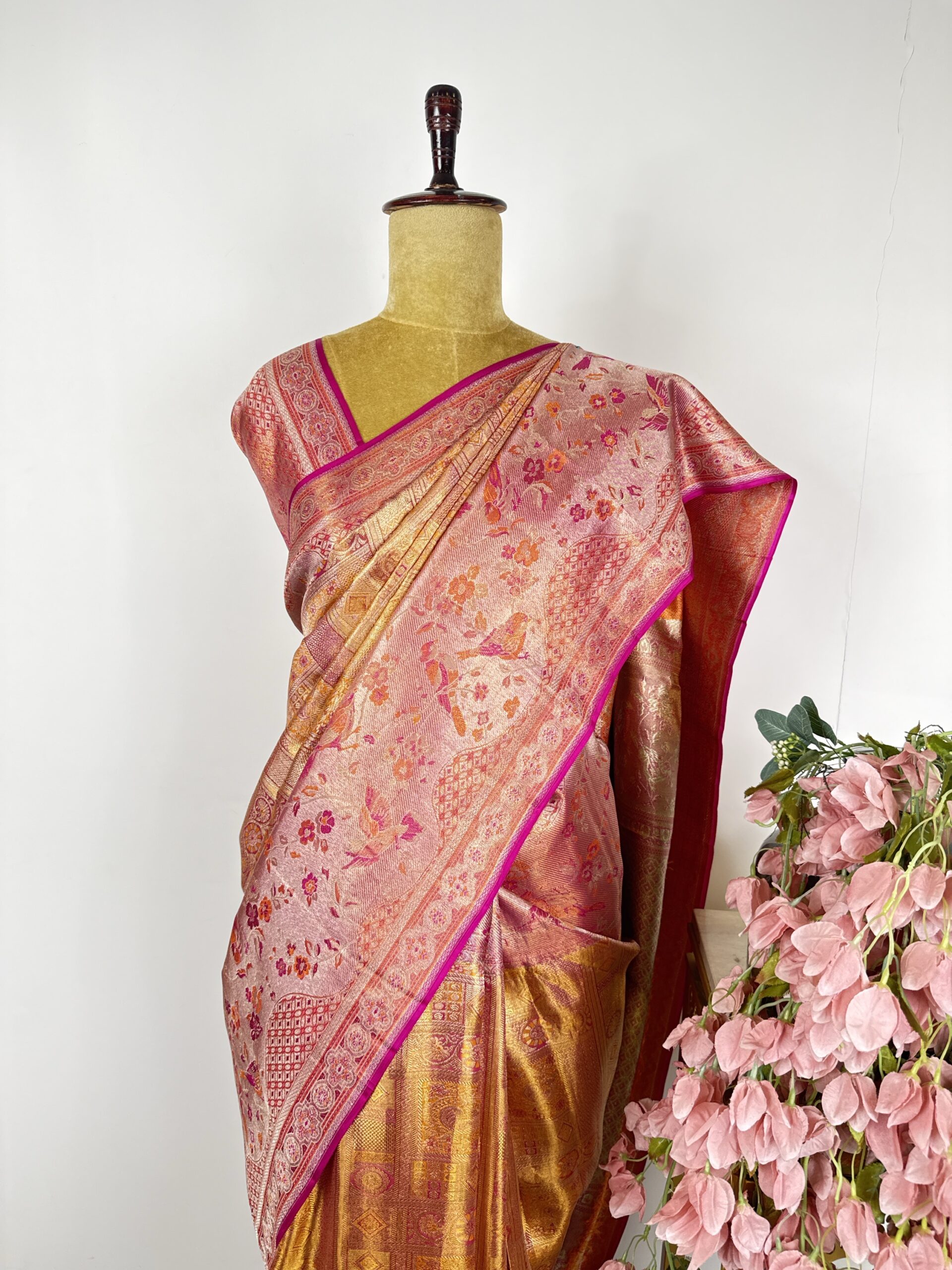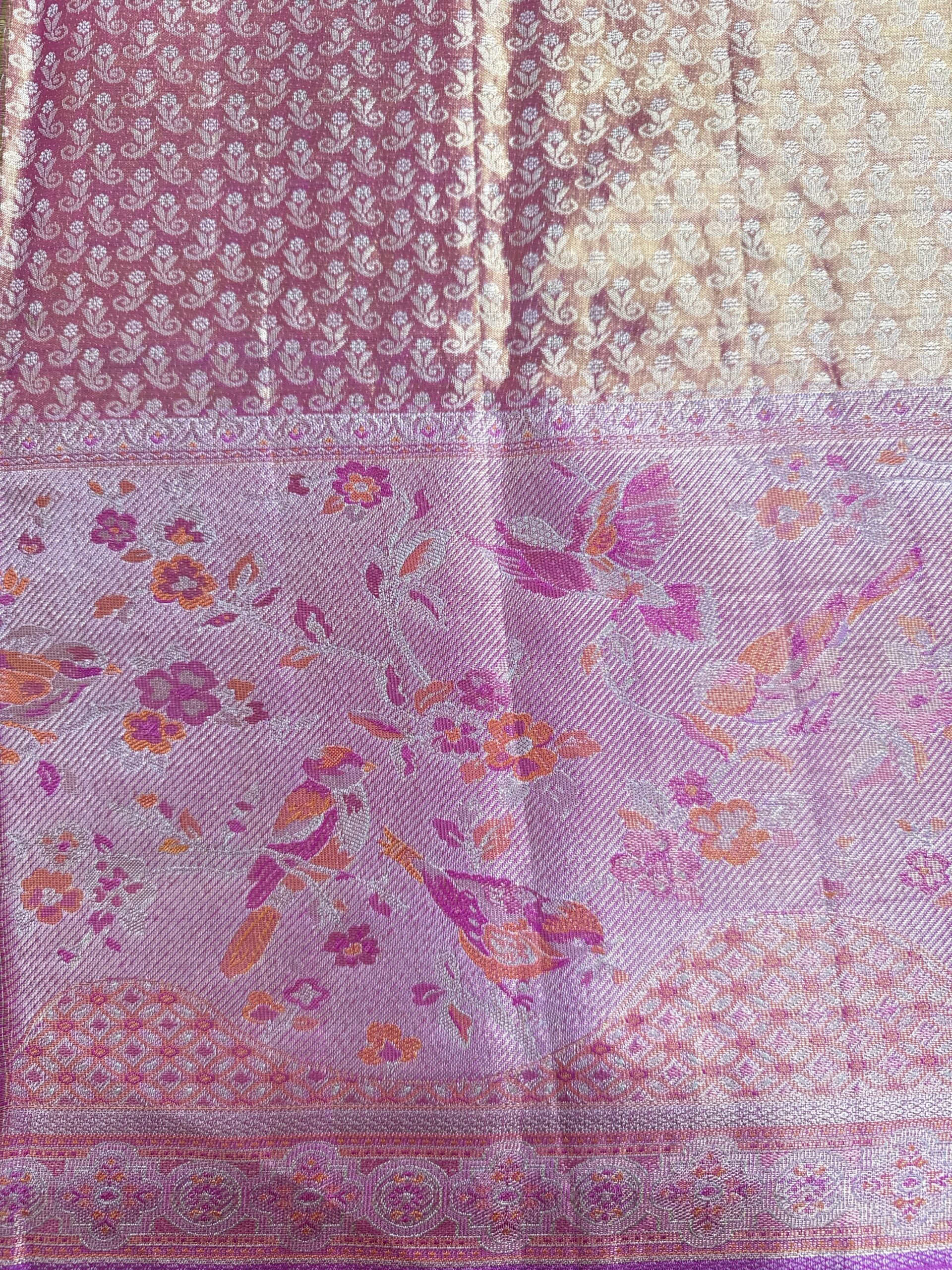 Orange gold and pink Kanchi tissue saree with geometric patterns with peacocks and floral motifs and pink colour borders with birds and floral motifs detailed with meenakari