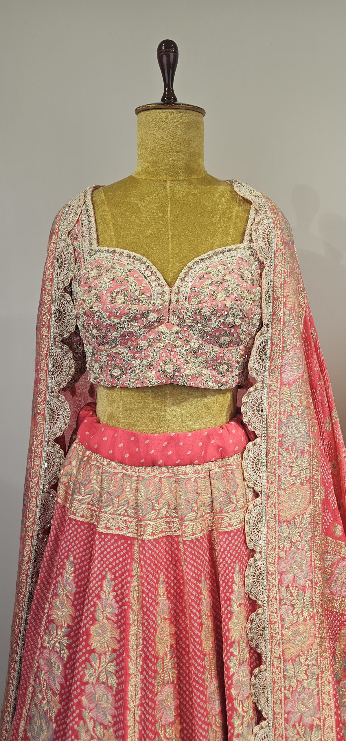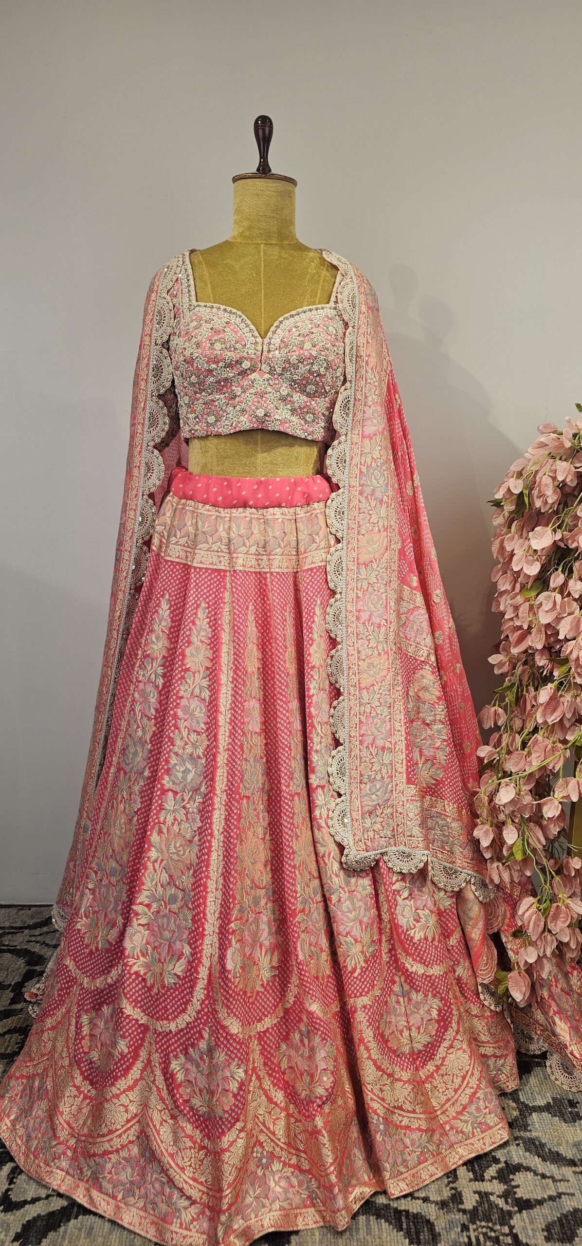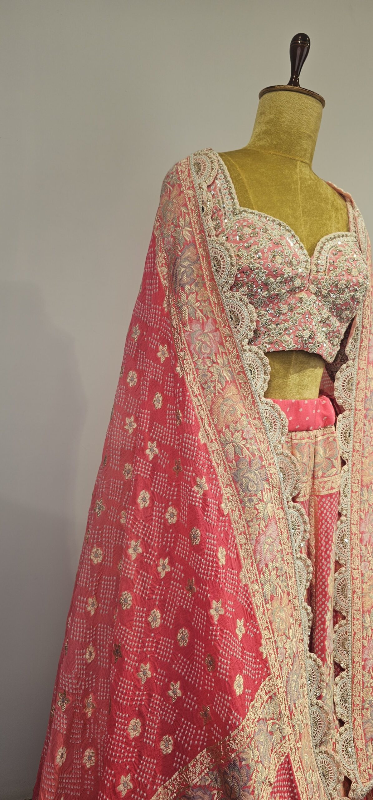Bandhani lehanga with floral parsi weaving paired with hand done pearl embroidery for both blouse and duppatta