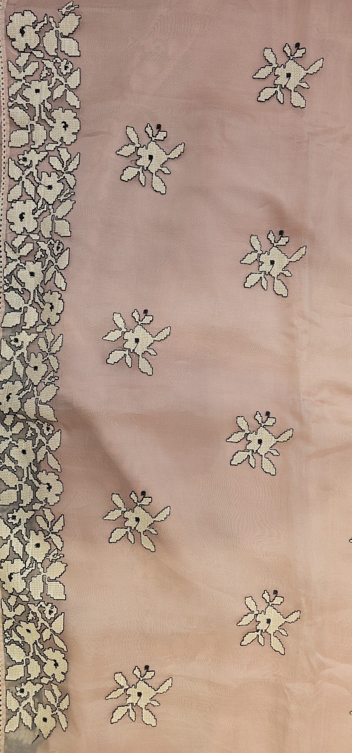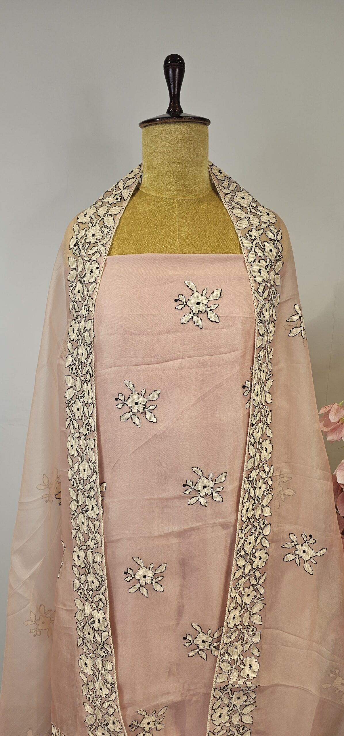 Peach colour organza Unstitched suit with intricate thread embroidery on top and duppatta and pant is plain